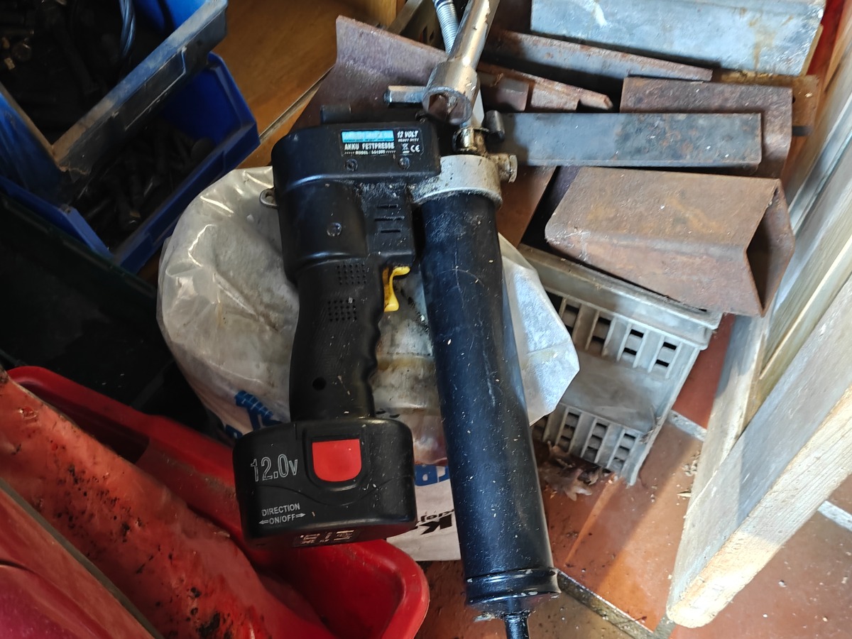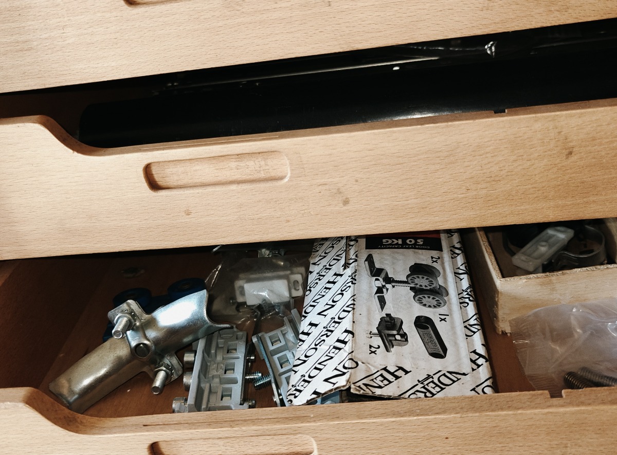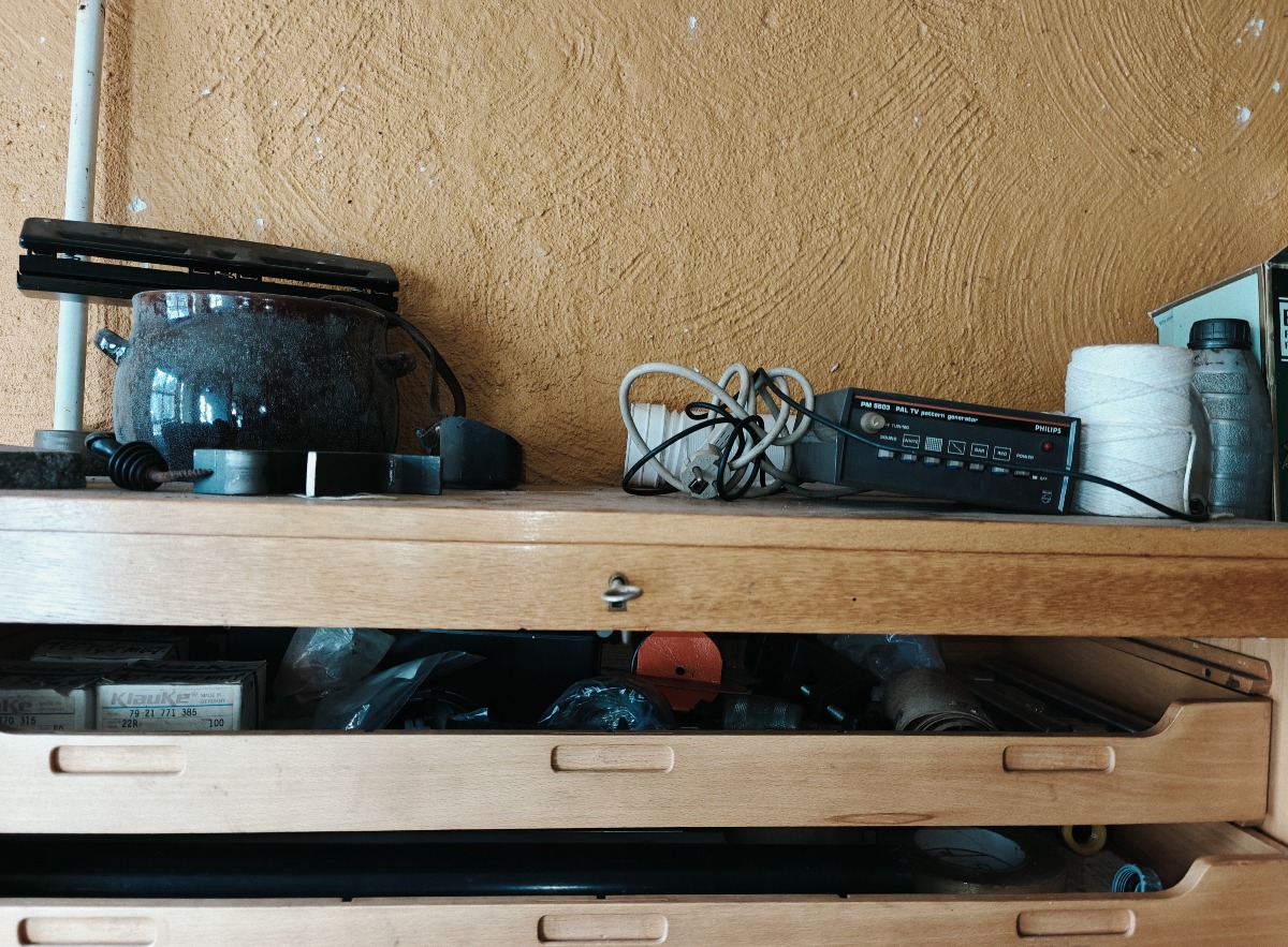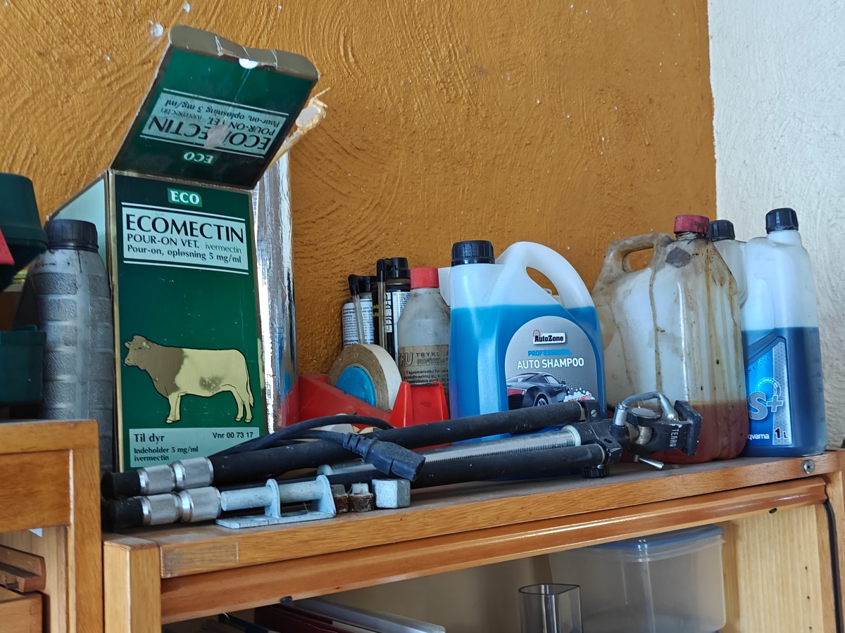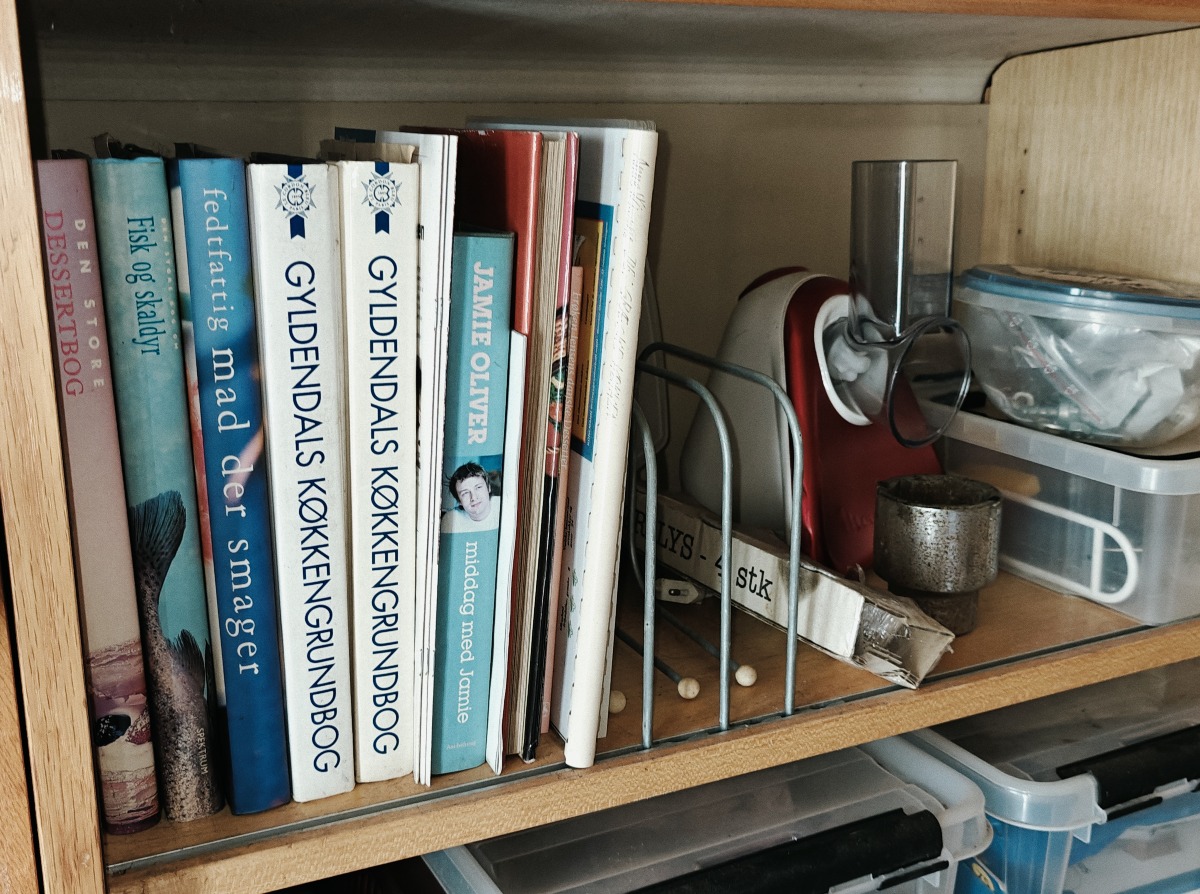 Tøm reolen og gulv foran reol. Står i stuehus.