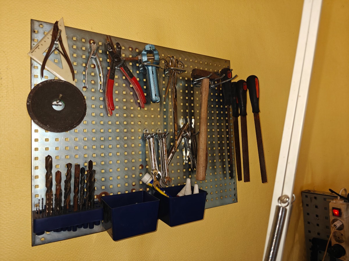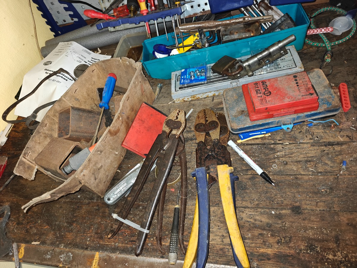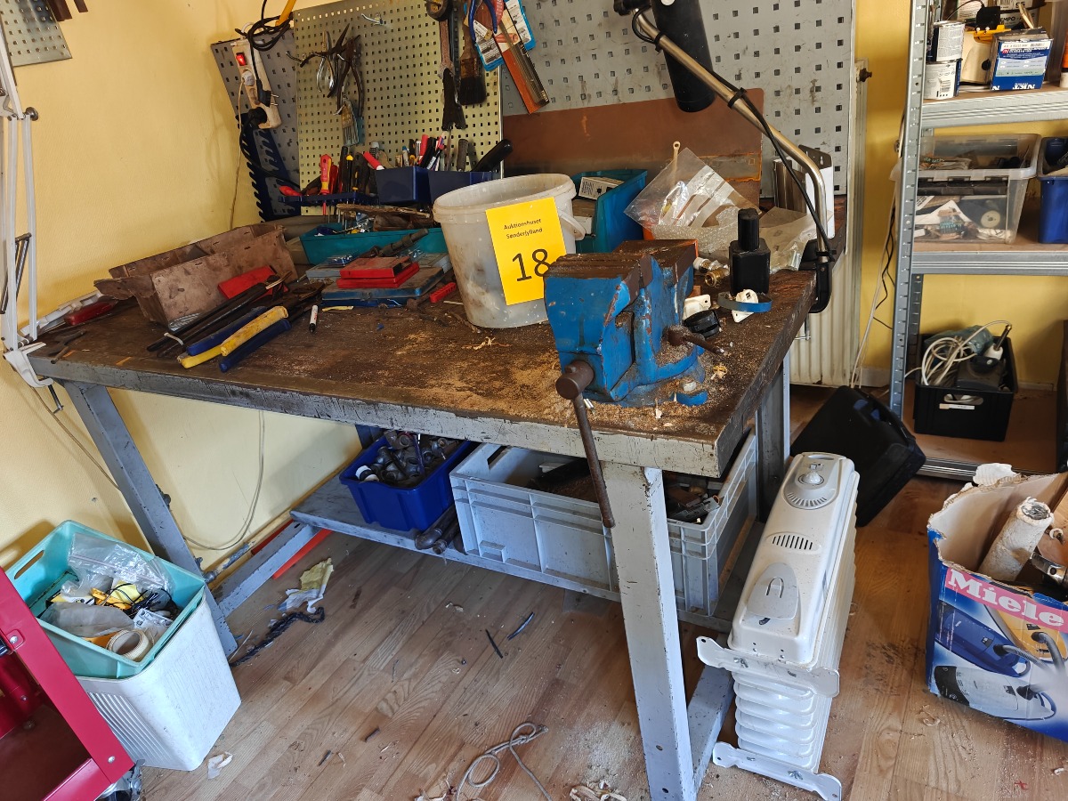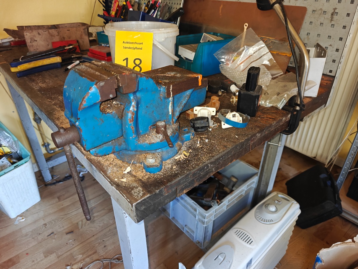 Værkstedsbord m/skruestik & værktøjstavler. Indhold medfølger. Selvnedtagning.