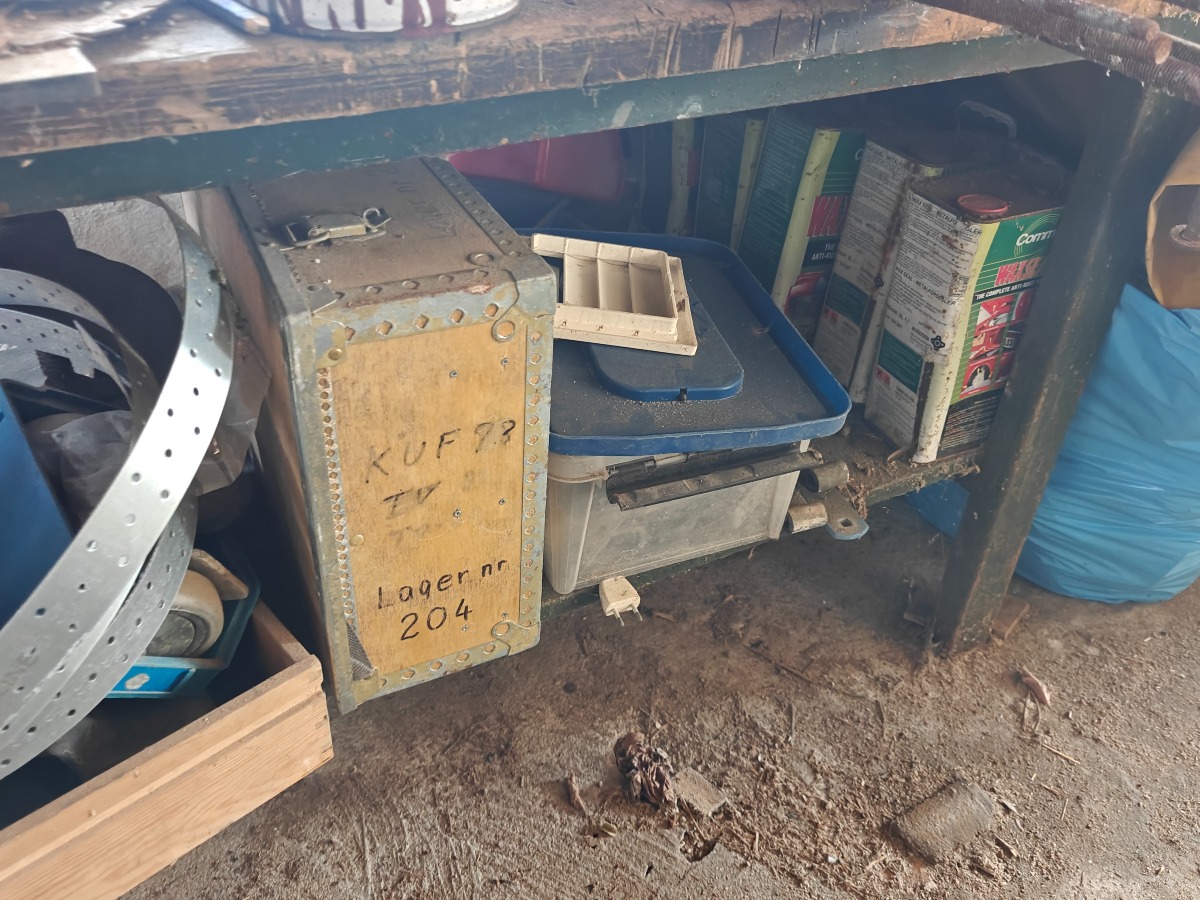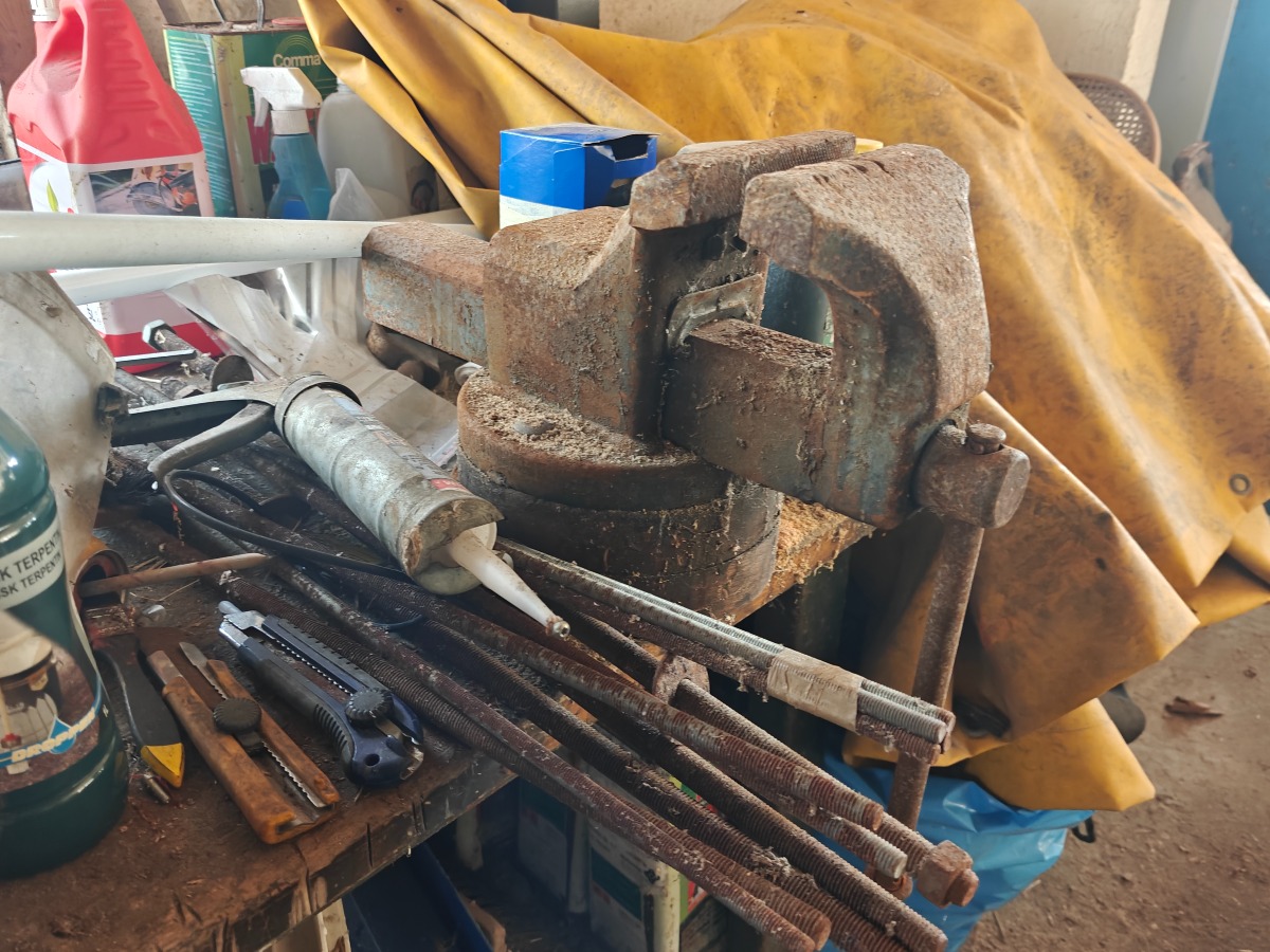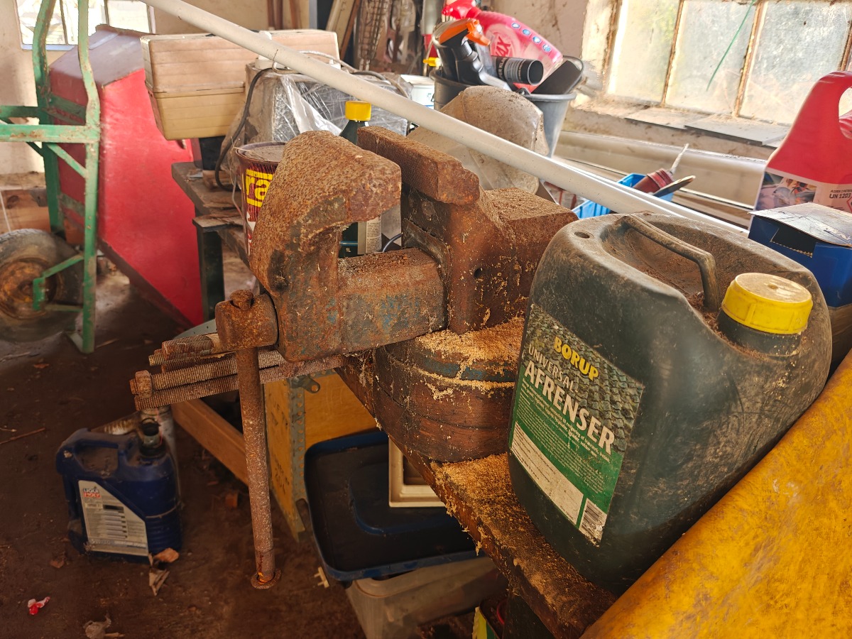 Værkstedsbord m/skruetvinge. Indhold på bord, knager og på gulv t.h. for bord medfølger. Står i garage.