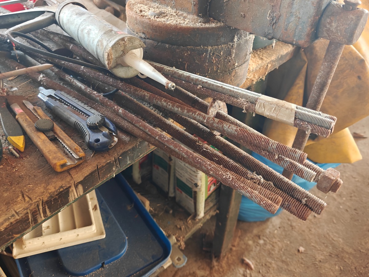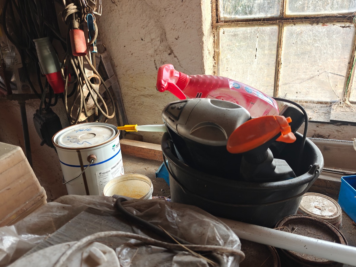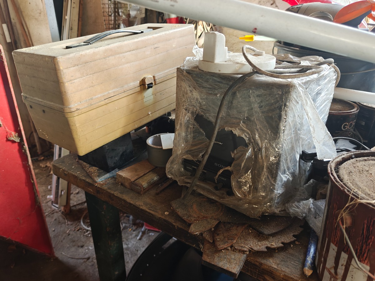 Værkstedsbord m/skruetvinge. Indhold på bord, knager og på gulv t.h. for bord medfølger. Står i garage.