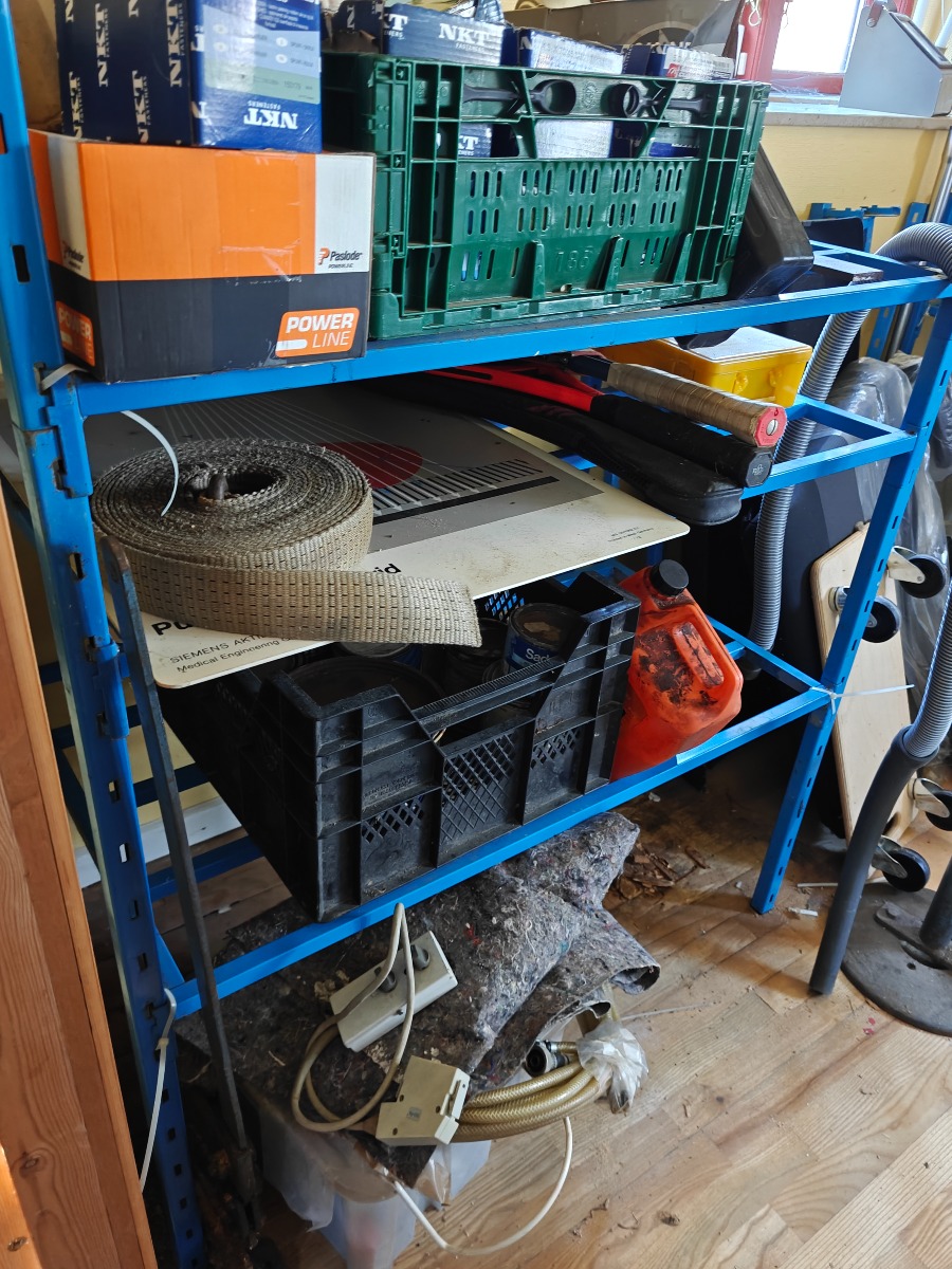 Værkstedsreoler, Bosch elværktøj, bukke, skruer, maling og øvrigt indhold. Selvnedtagning.