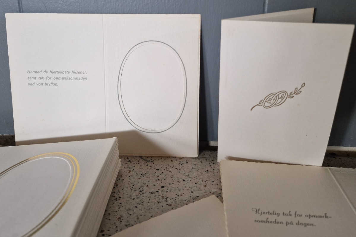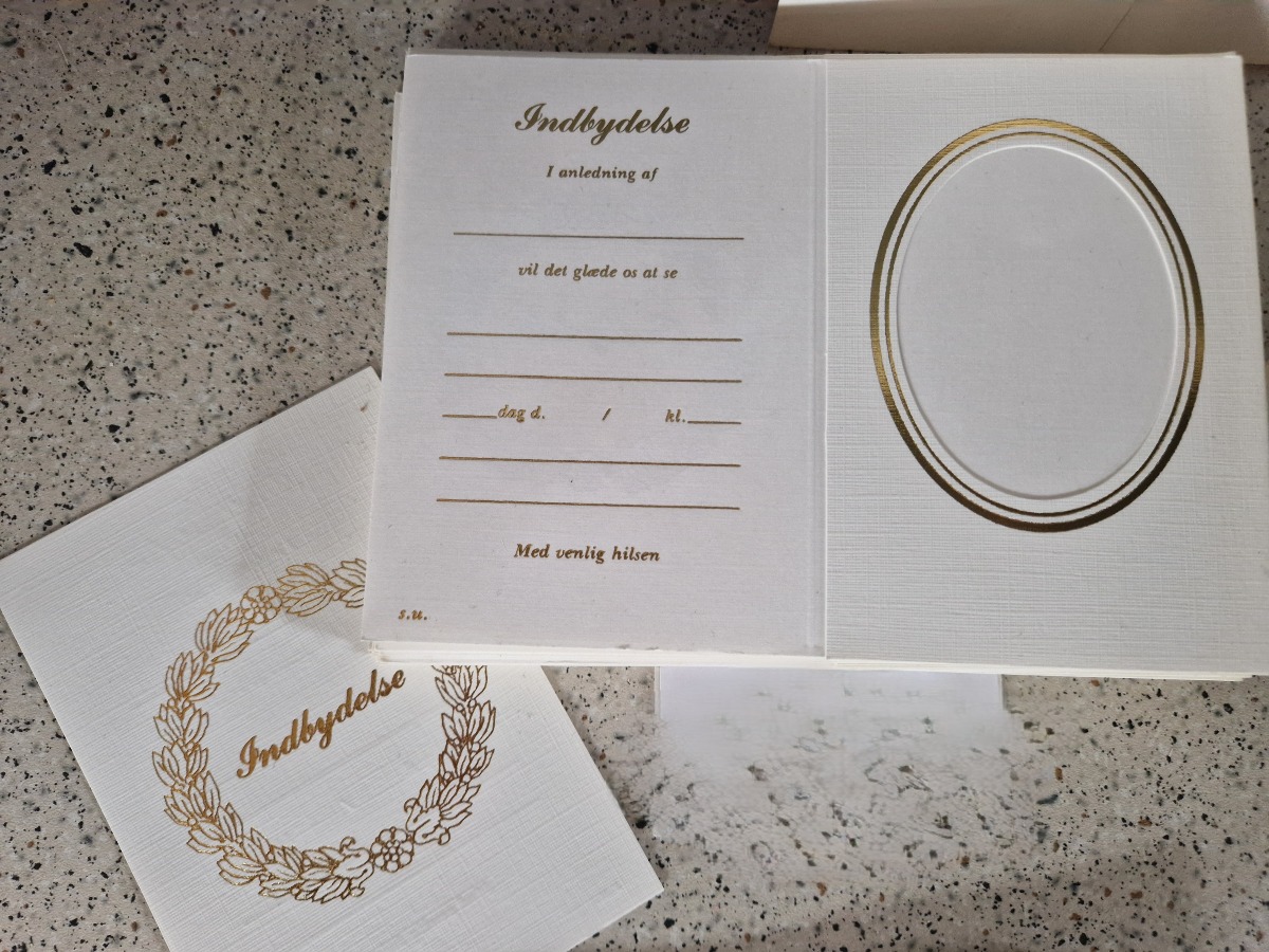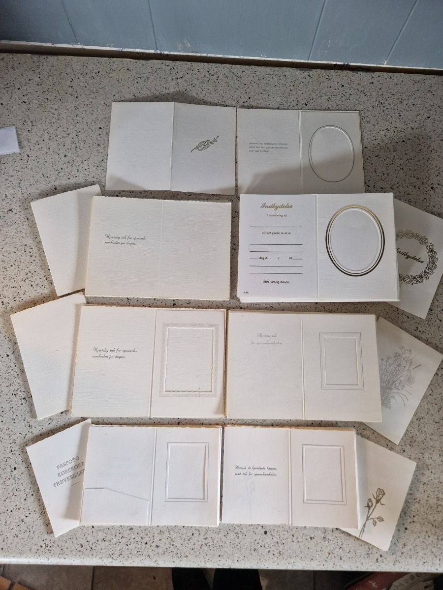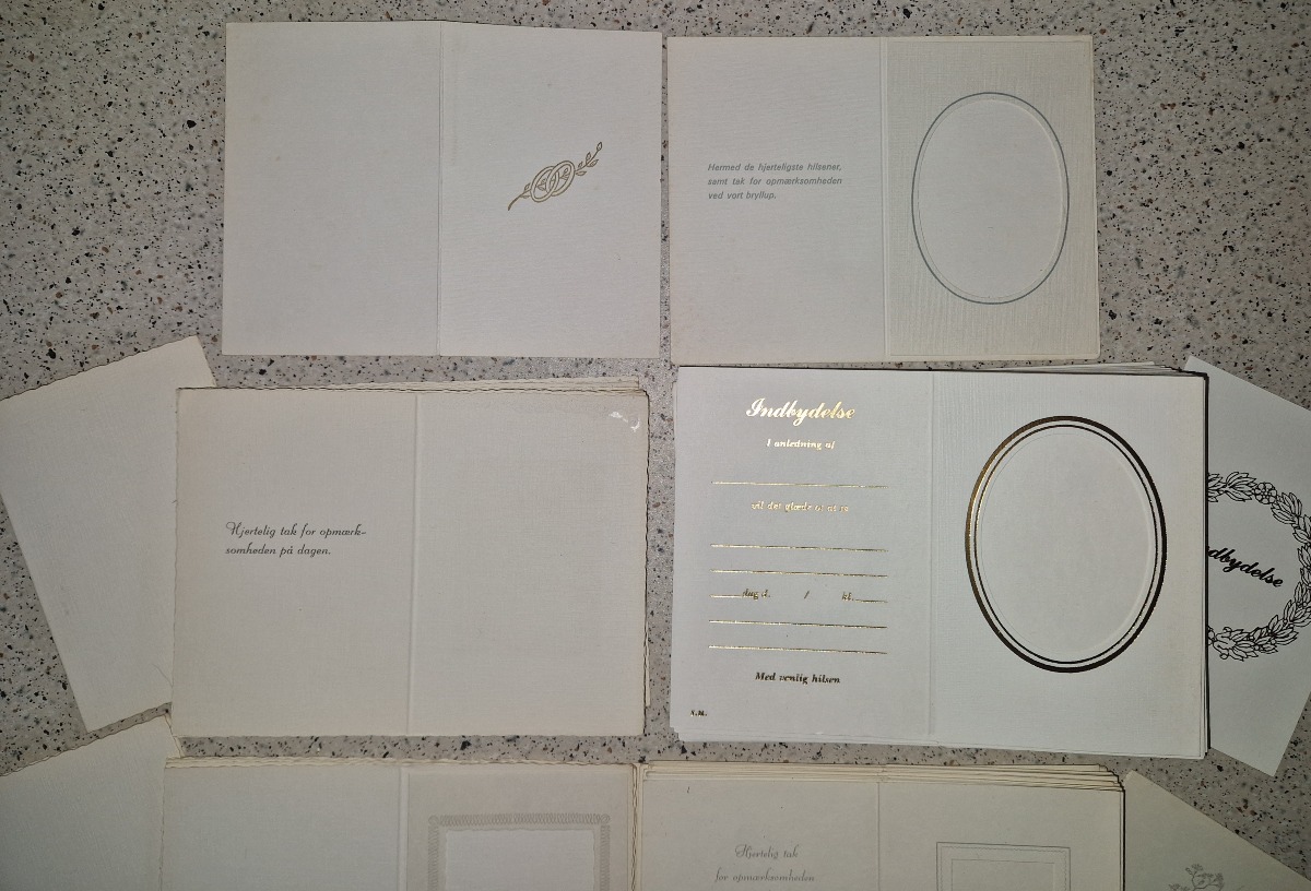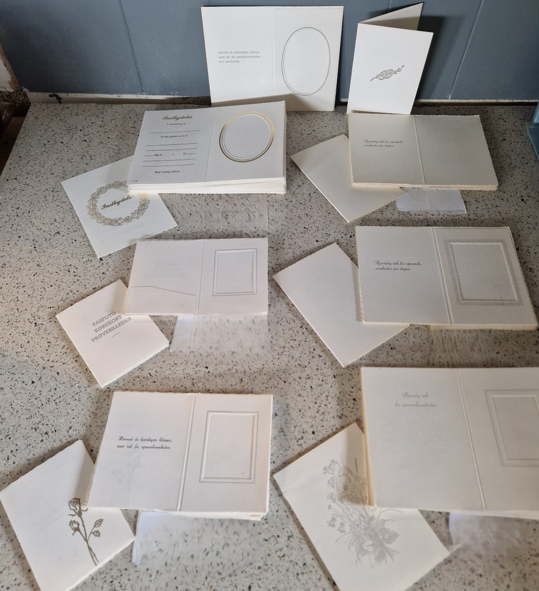 Ca 100 stk. indbydelser, takkekort mm. Heraf nogle til foto. Fotos viser nogle af de designs, som indgår i partiet. Ubrugte.