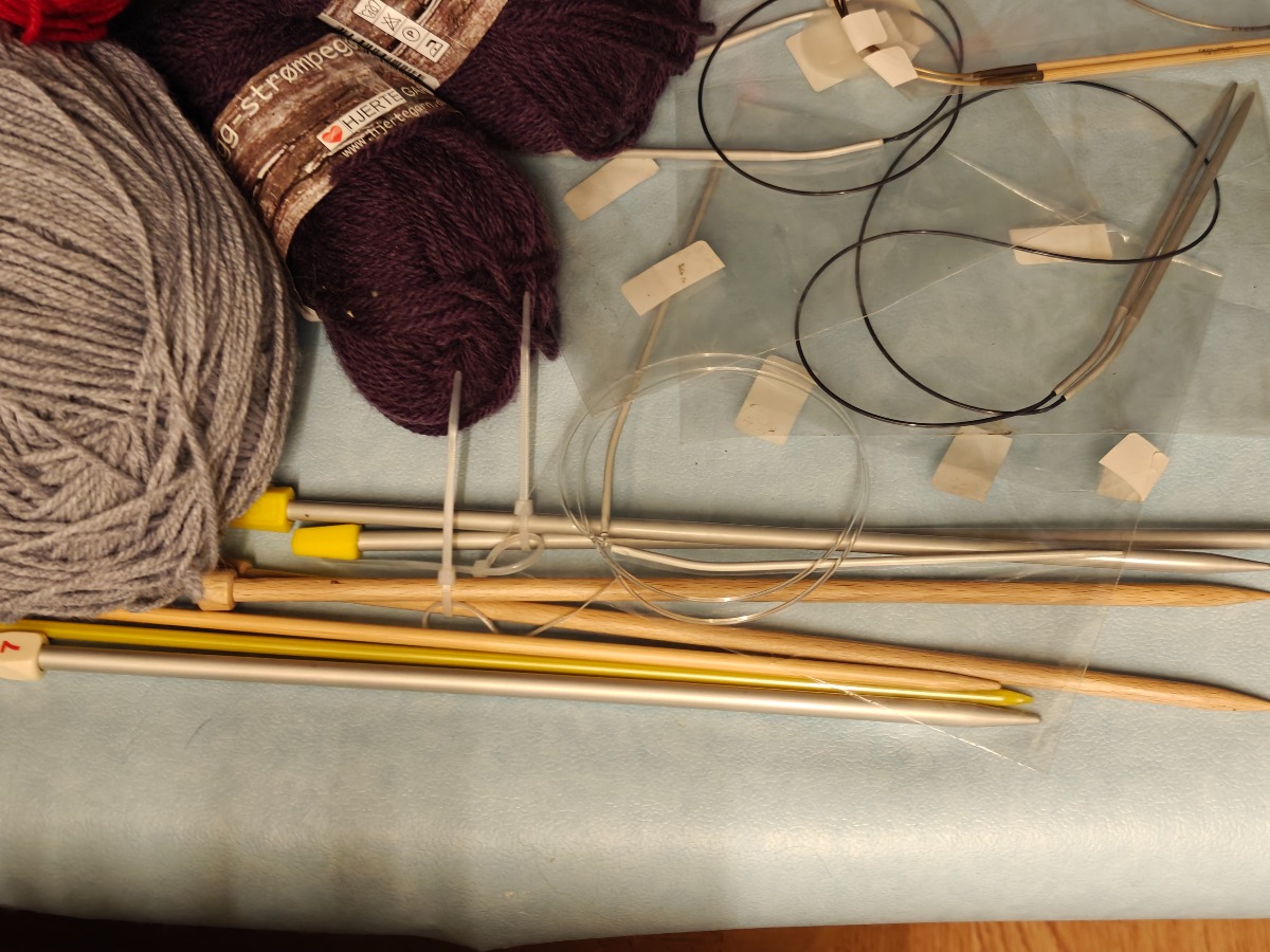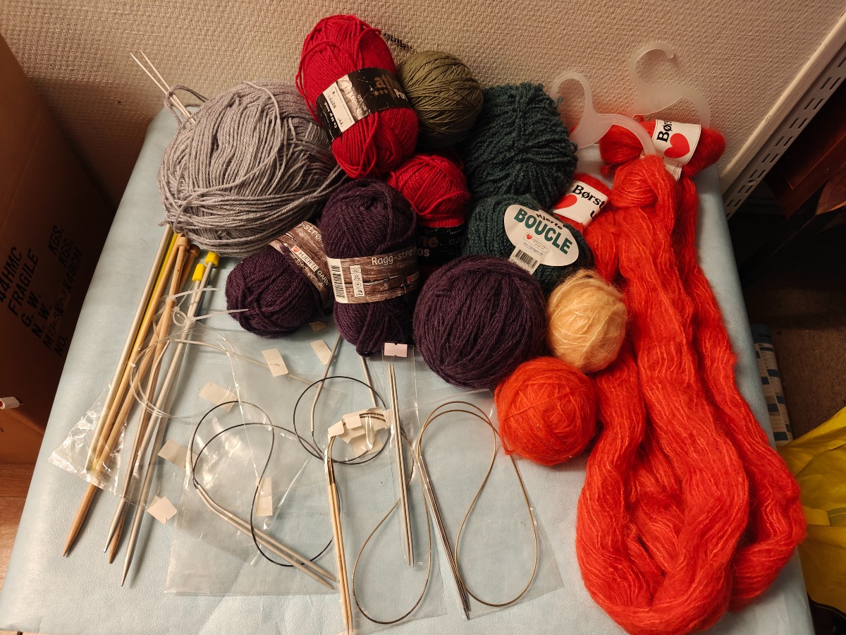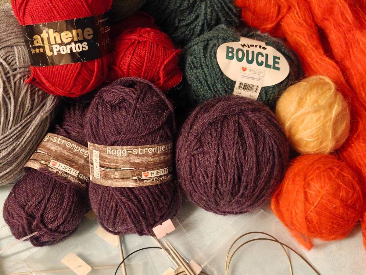 Ca 16 ruller garn, samt 9 sæt strikkepinde. Ass. farver, str, mærker og modeller. Ubrugte.