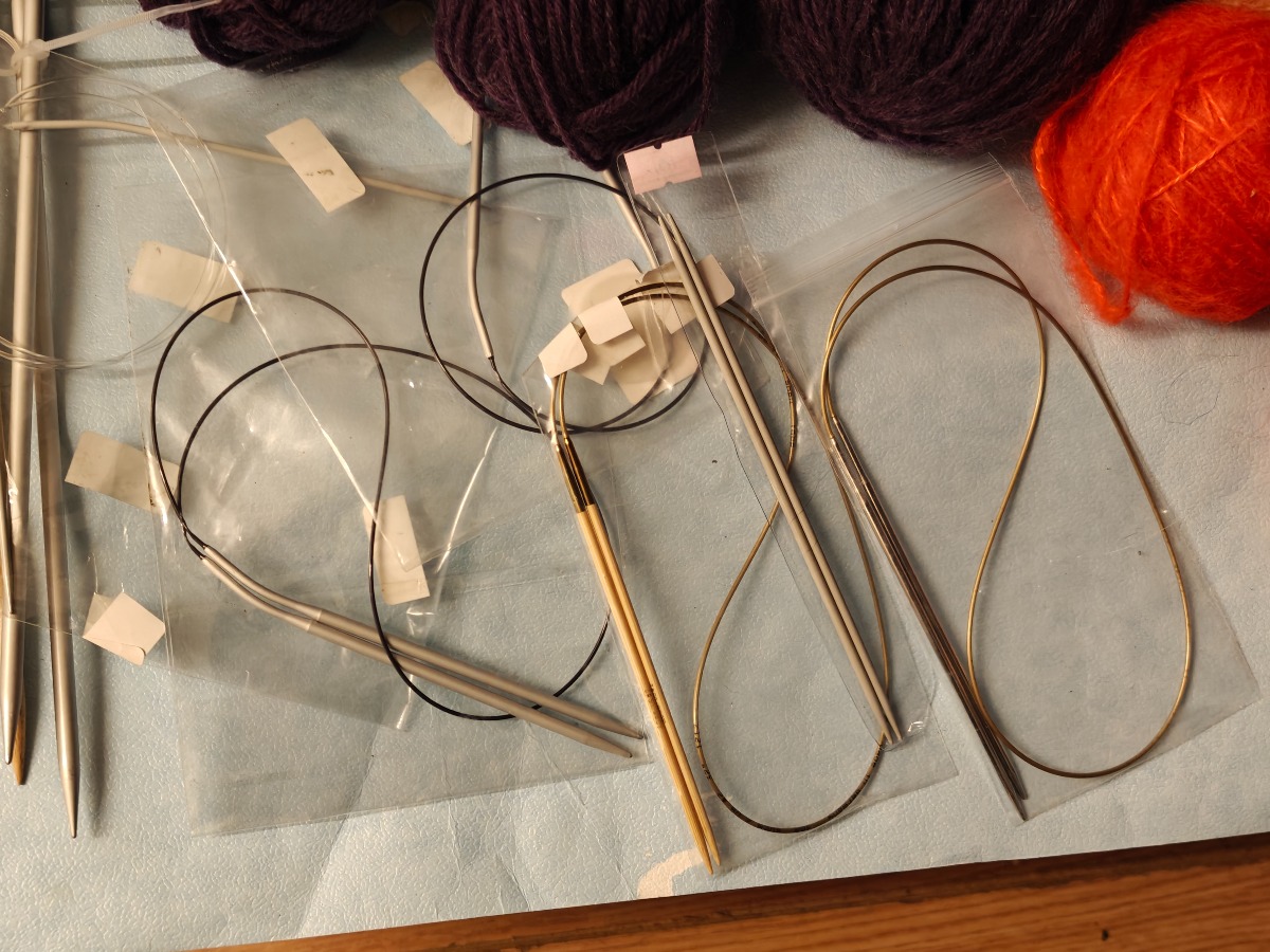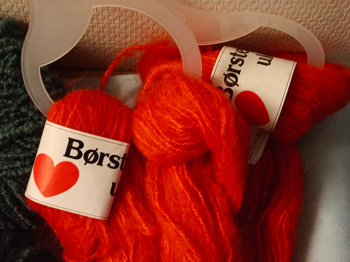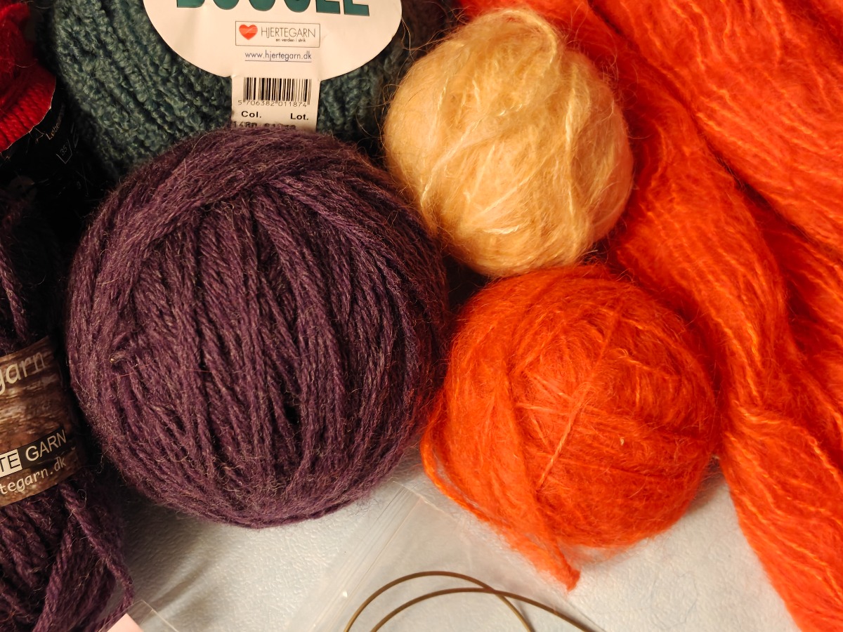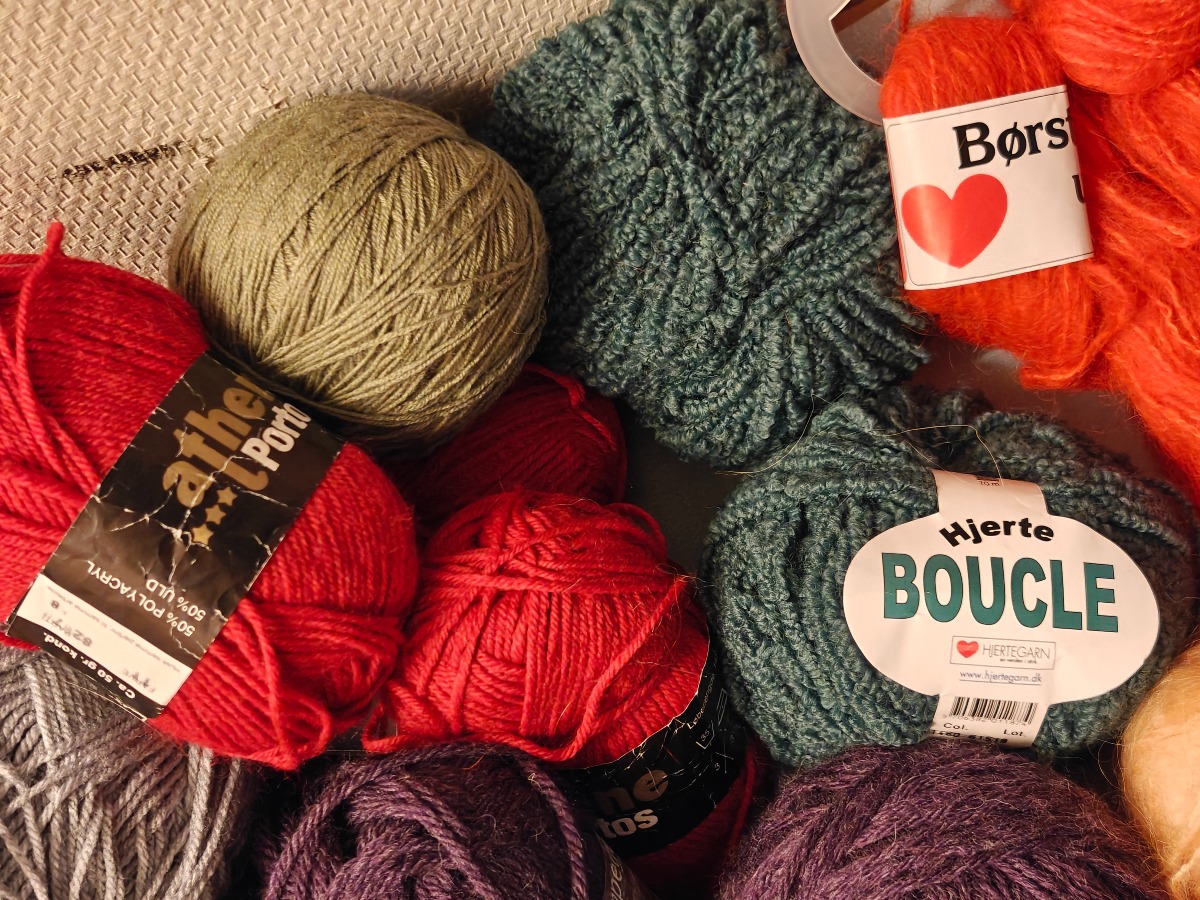 Ca 16 ruller garn, samt 9 sæt strikkepinde. Ass. farver, str, mærker og modeller. Ubrugte.