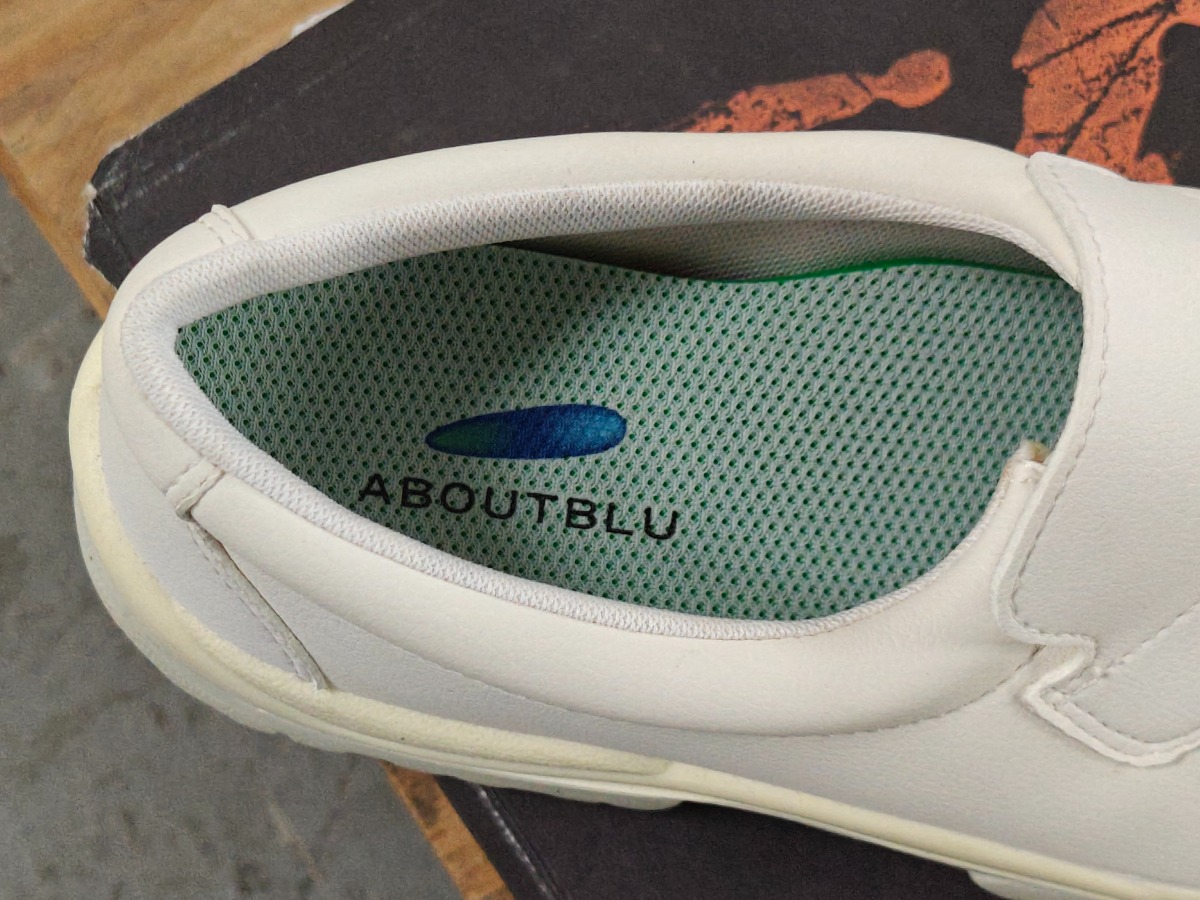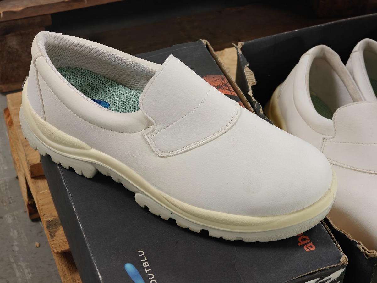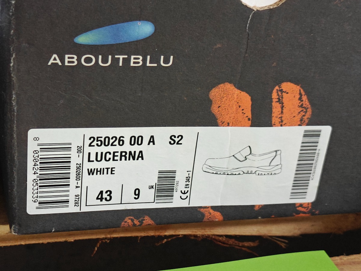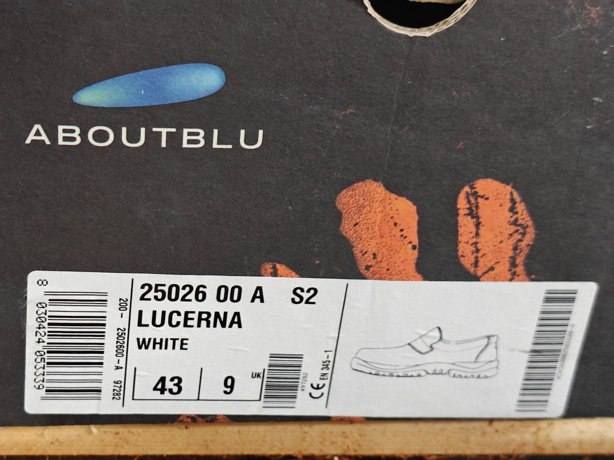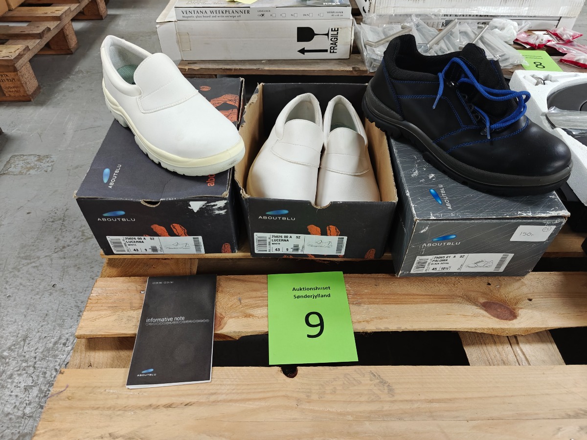 3 par arbejdssko. Mrk: AboutBlu. 1 par: Model: Paloma. Str: 45. Farve: Black Royal. 2 par: Mrk: Lucerna. Str: 43. Farve: Hvid. Alle er ubrugte og i orginale æsker.