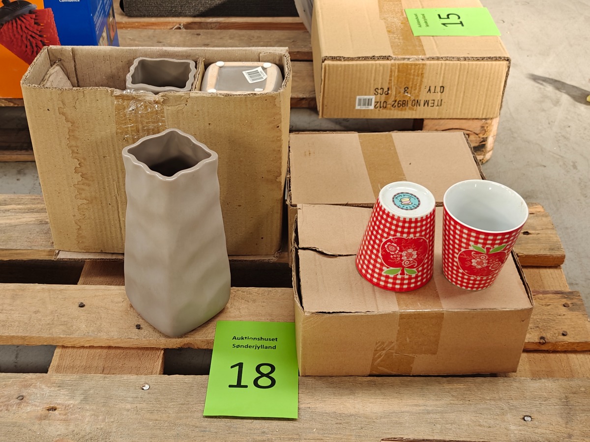 12 Porcelænskrus. Mrk: Pretty Porcelain by Falby. 3 vaser i lys grå. Ubrugt.
