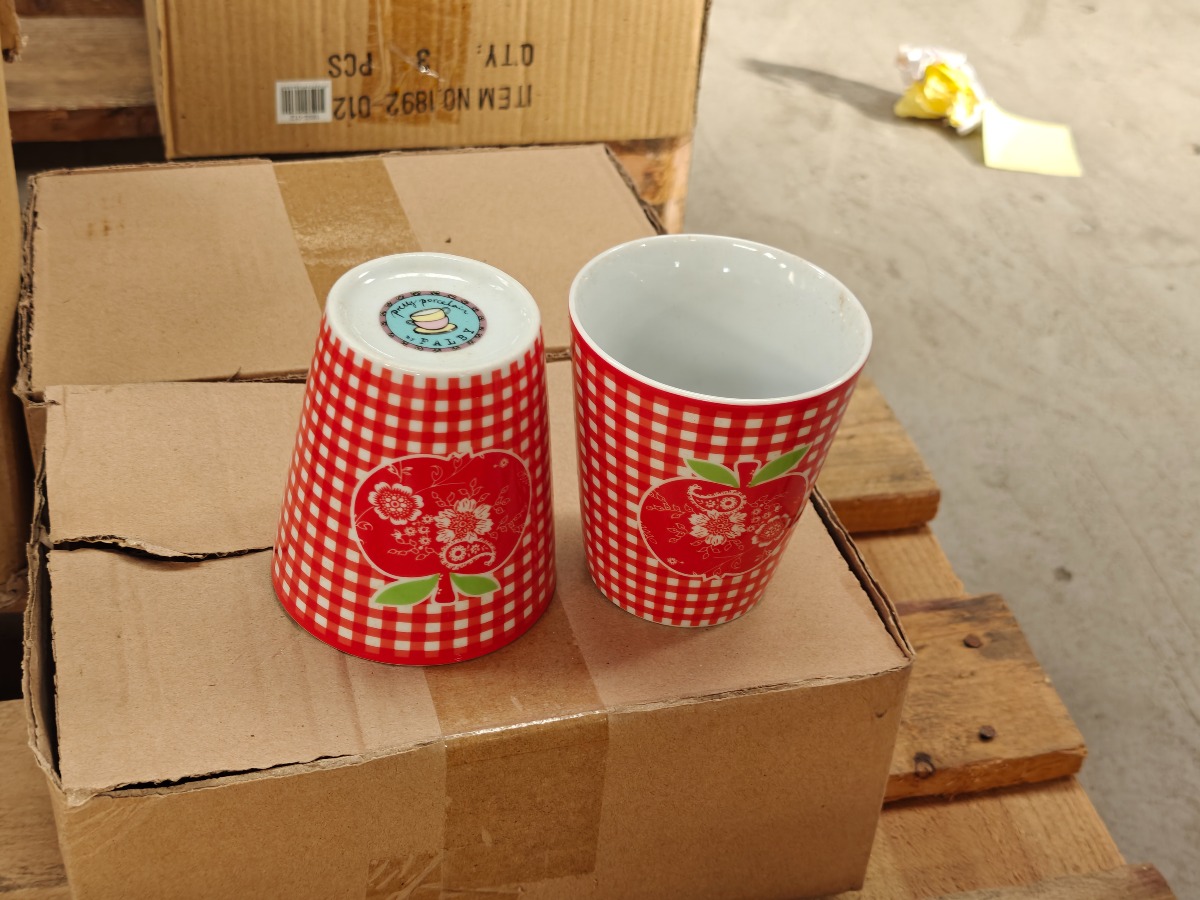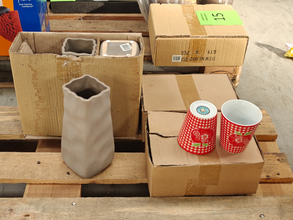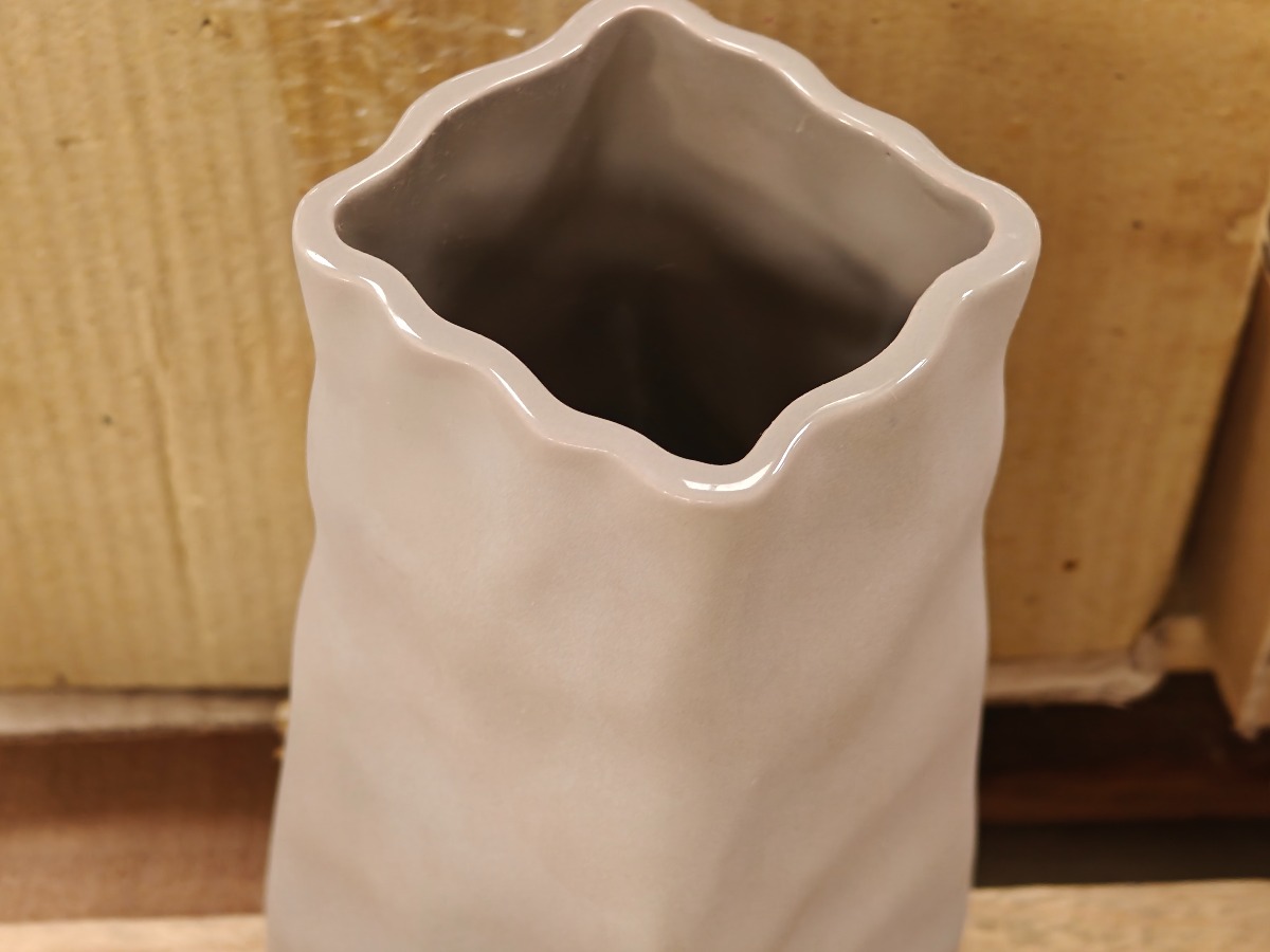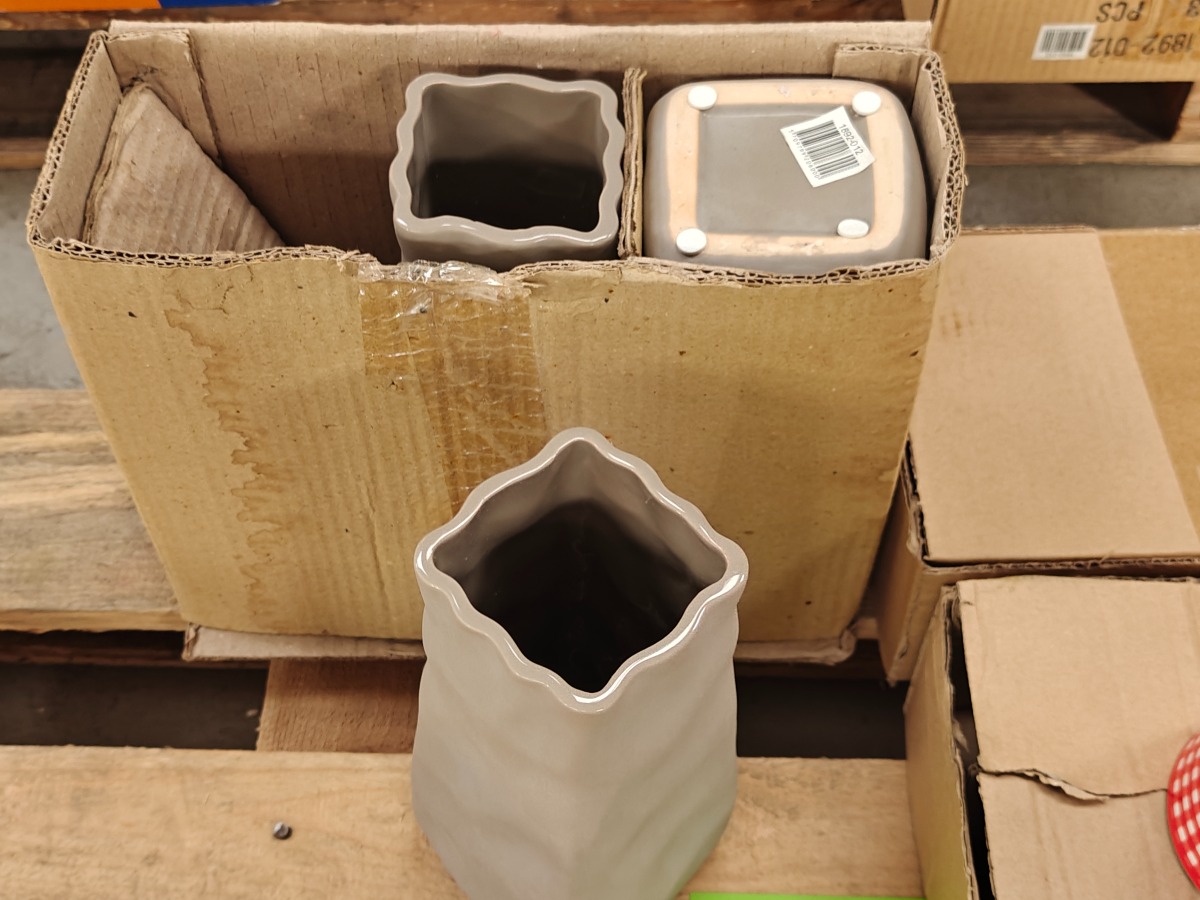 12 Porcelænskrus. Mrk: Pretty Porcelain by Falby. 3 vaser i lys grå. Ubrugt.