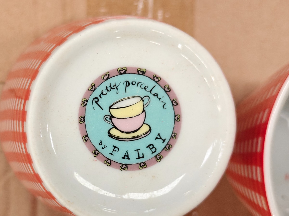 12 Porcelænskrus. Mrk: Pretty Porcelain by Falby. 3 vaser i lys grå