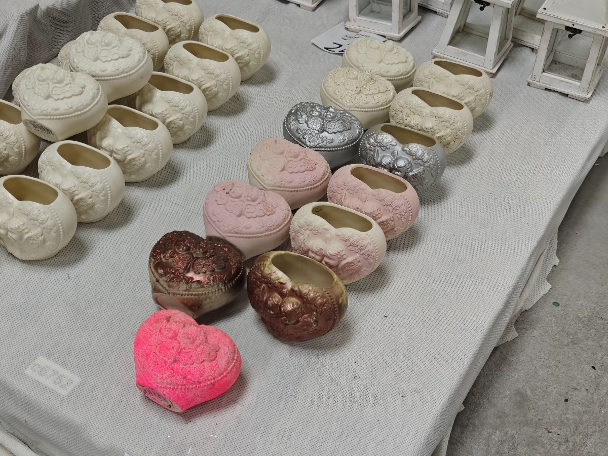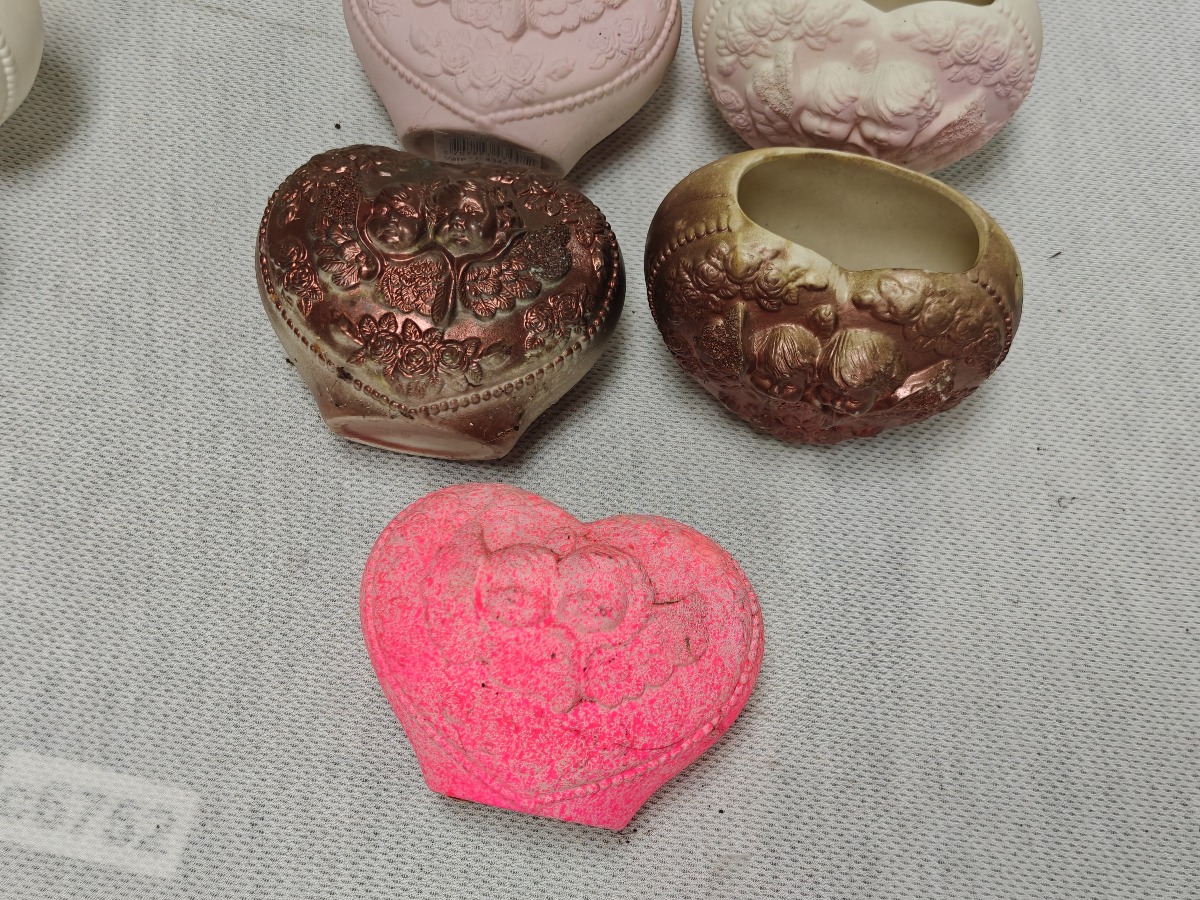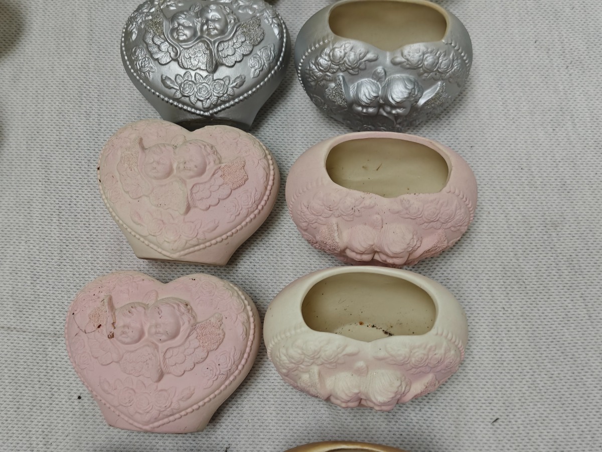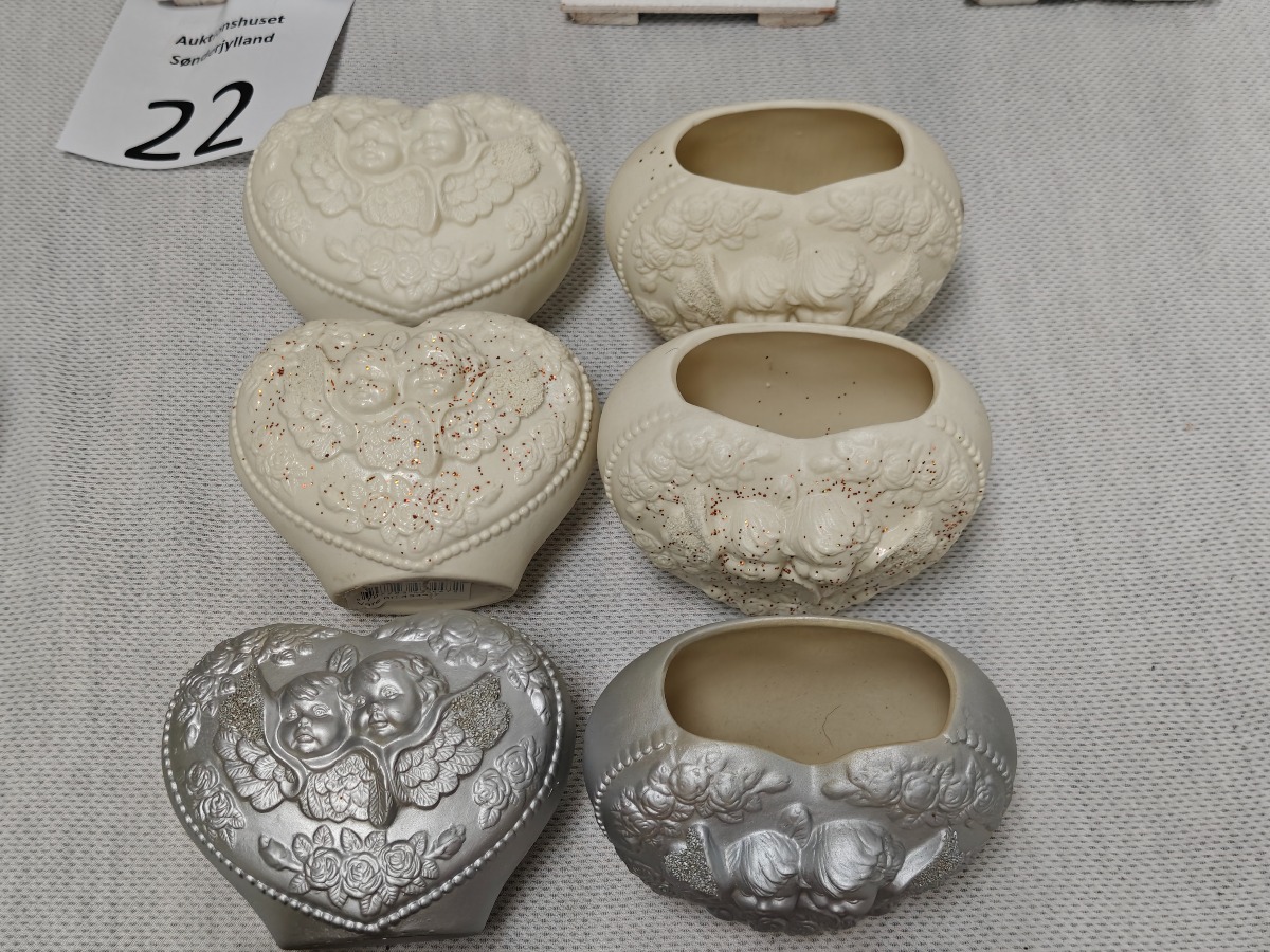 13 Vaser. Hjerteformede m/engledesign. Ass. Farver. Mål: H: ca 12 cm. Ubrugte.