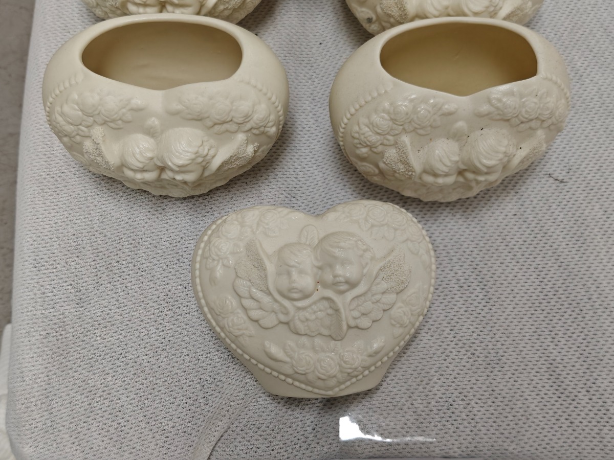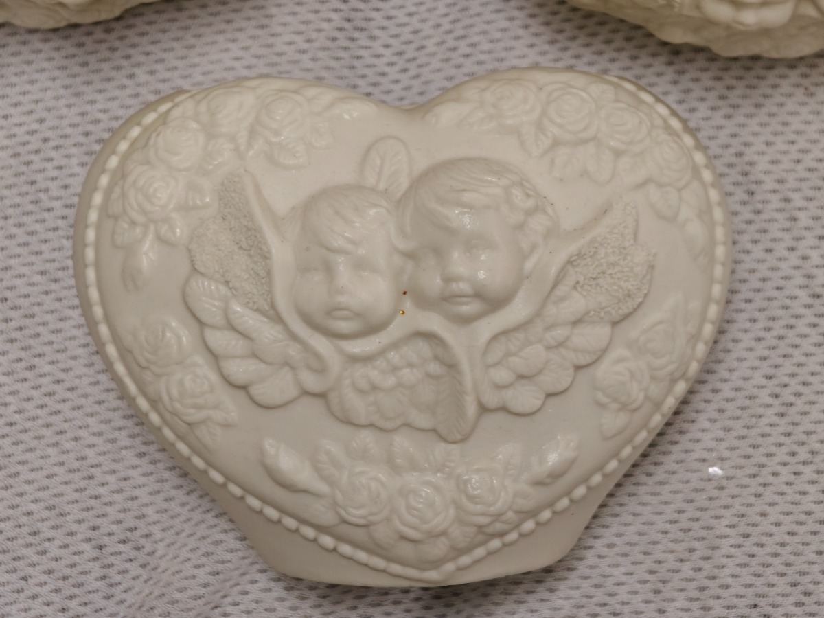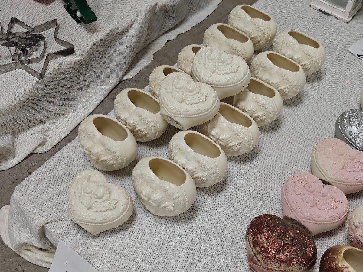 15 Vaser. Hjerteformede m/engledesign. Hvide. Mål: H: ca 12 cm. Ubrugte.