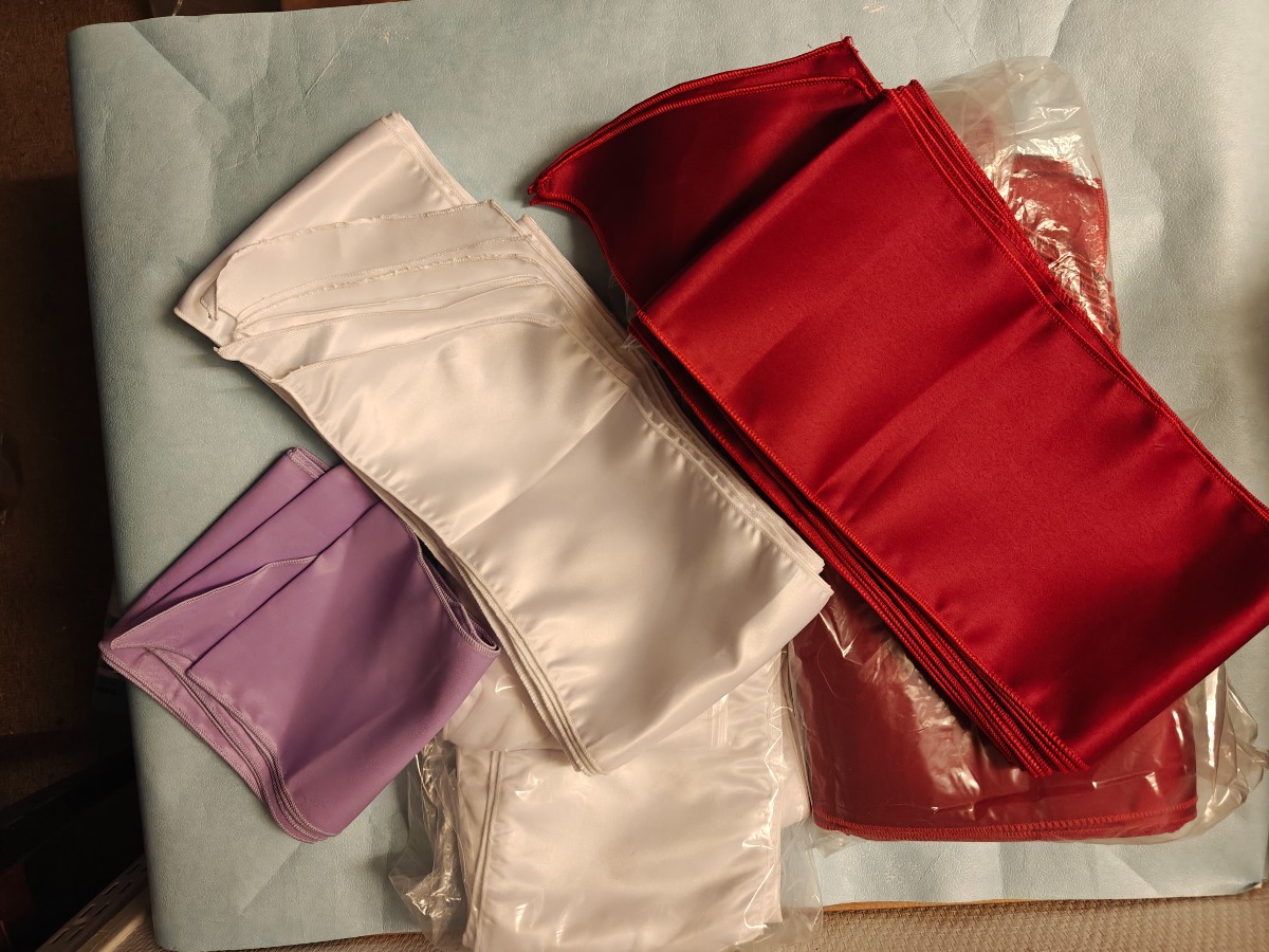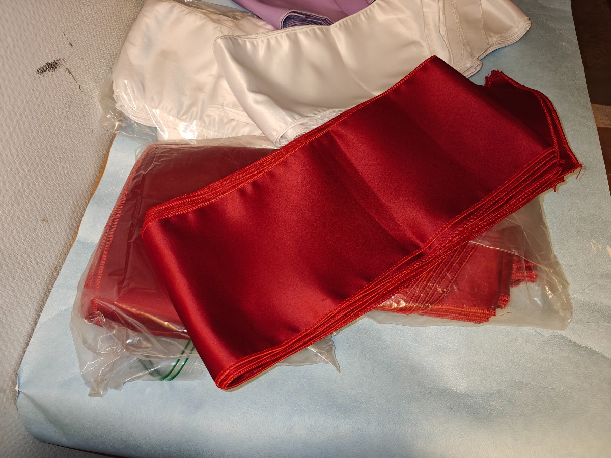 18 Store satinbånd t/fx stolerygge mm. 14 røde, 3 hvide og 1 lilla. Mål: B: 14 cm. L: 260 cm