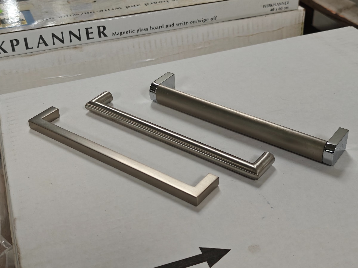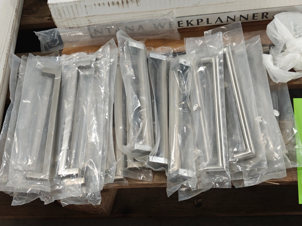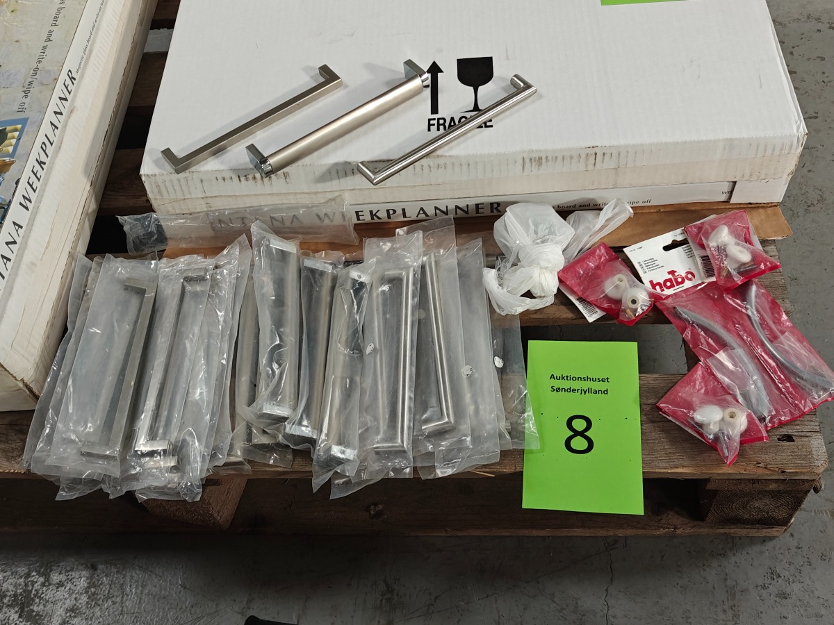 31 Greb t/køkkenlåger. 16 kantede. 9 runde. 4 brede. 2 buede. Samt 6 møbelknopper. Ubrugte og i emballage.