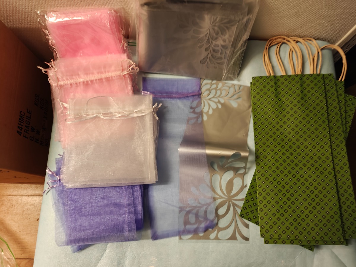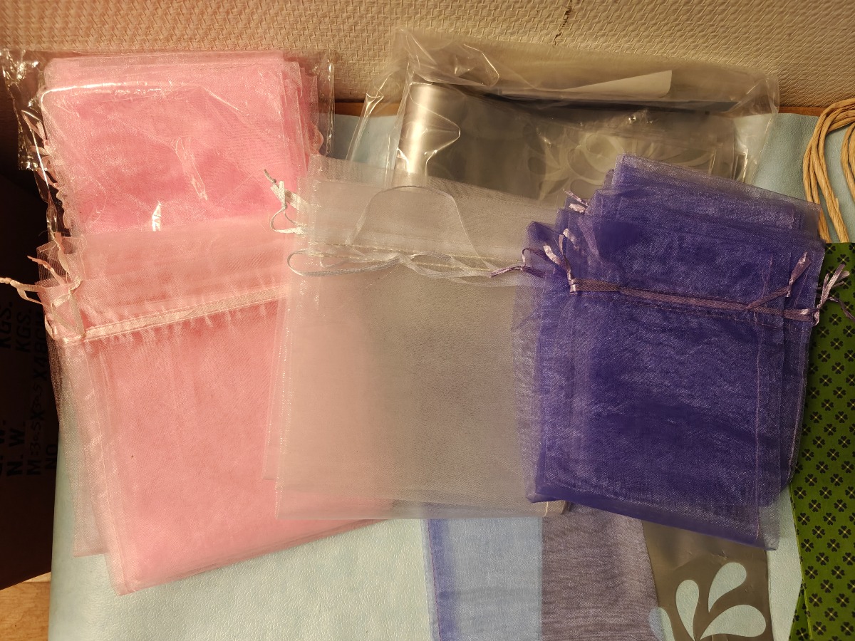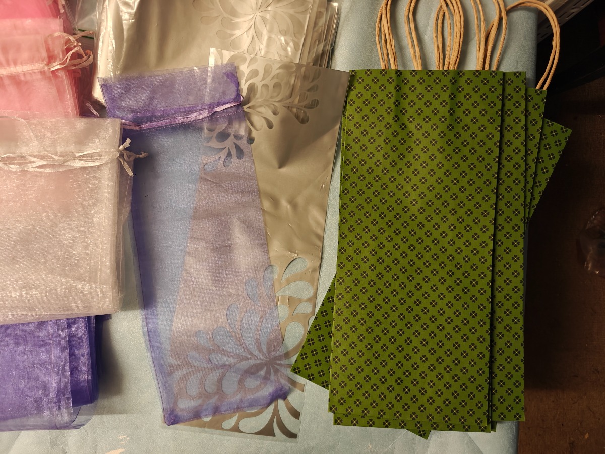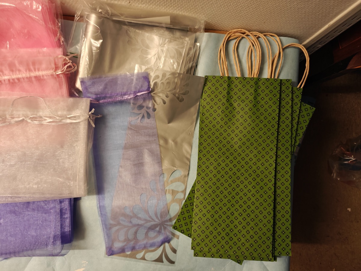 Ca 100 Gaveposer t/vin. Organza m/satinbånd: Pink, lilla & hvid, kraftig papir m/hank: Grønne & plast: Klar/sølvgrå