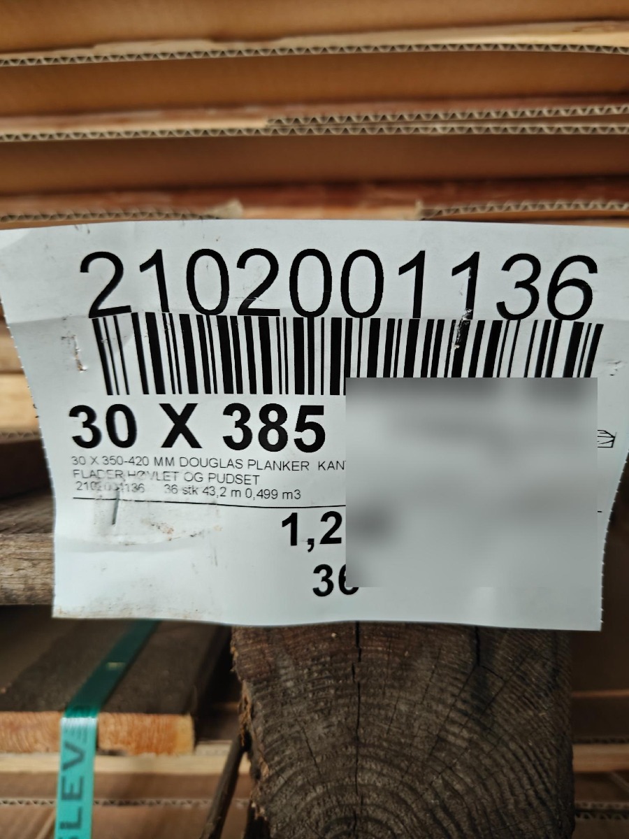 Douglas planker 1 pl. med 36 stk plankerne måler 30 x 350 - 420 mm x 1,2 meter ukantskåret, høvlet og pudset