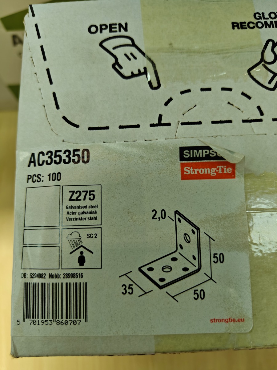 1 ks. med100 stk Simpson Strong -Tie galvaniserede vinkelbeslag, beslagene måler 50 x 50 mm 35 mm bredde