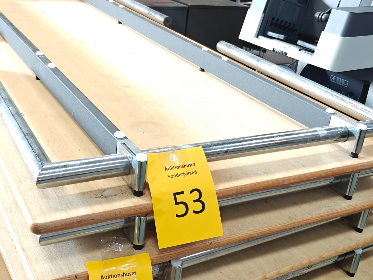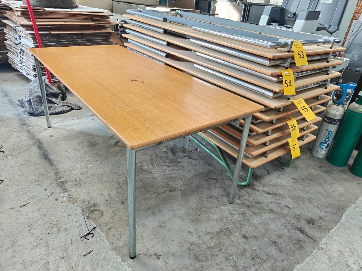 2 stk klapborde fra Randers Danish Furnituremakers med plade og i stål stel. Måler 180 x 80 x 72 høj. Kan klappes sammen. Perfekt til gildesalen. Med brugsspor.