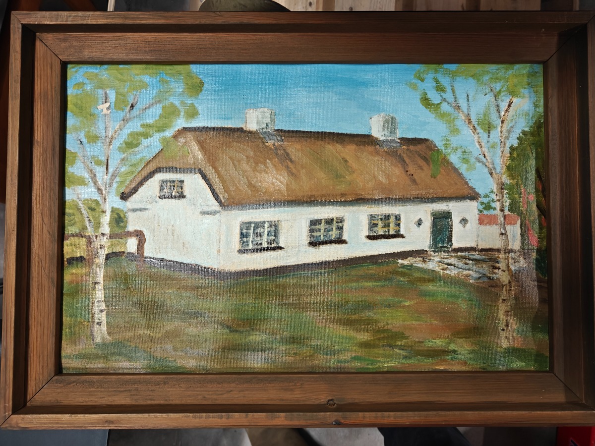 2 malerier. Stilleben og hus. Olie på lærred. Ca. 42 x 55 cm. pr. stk.