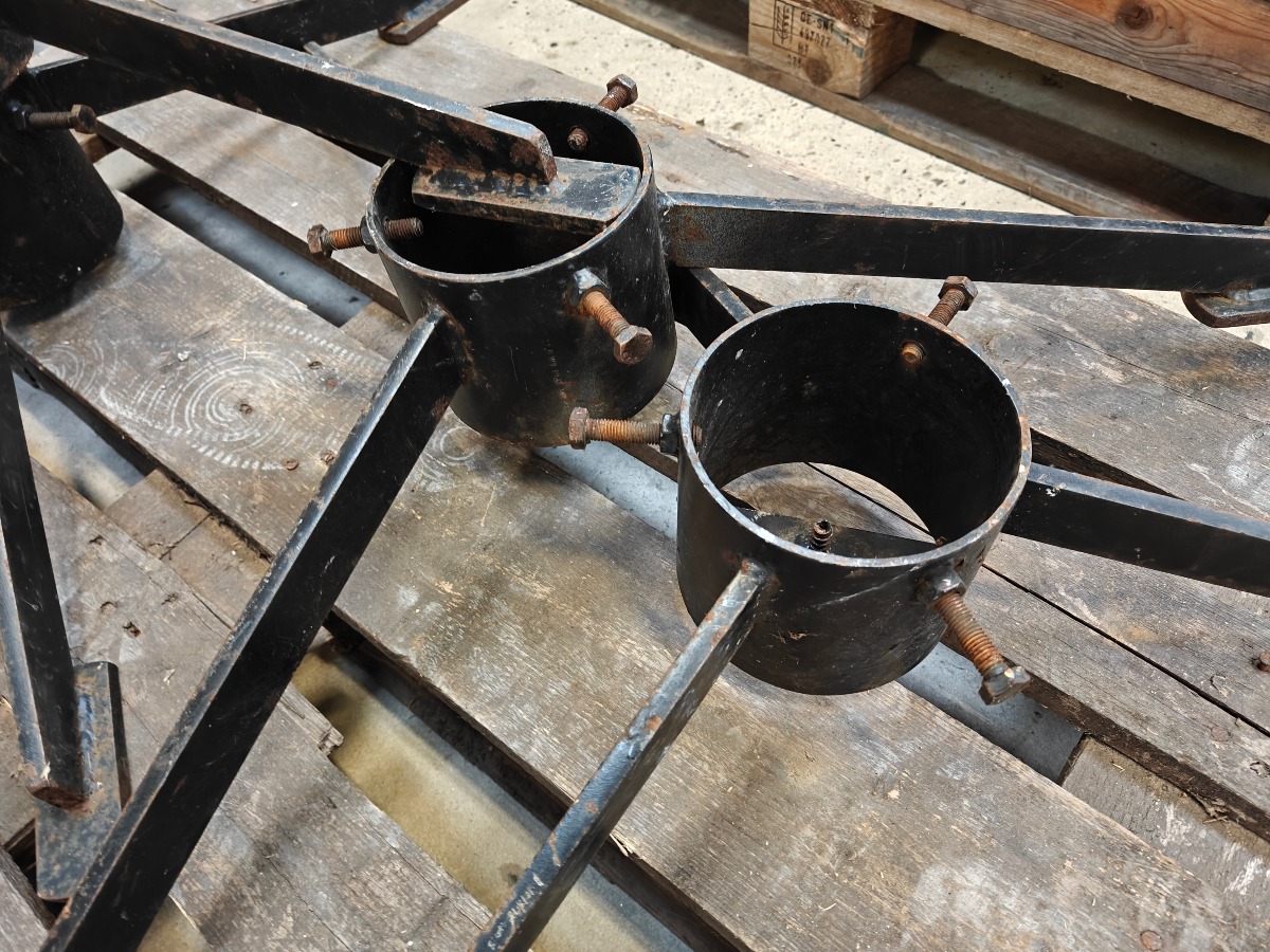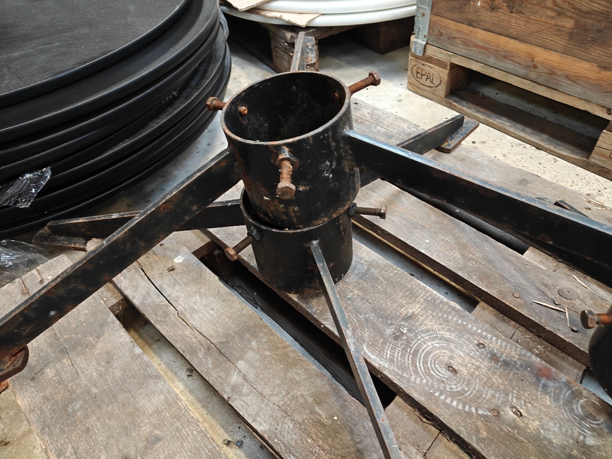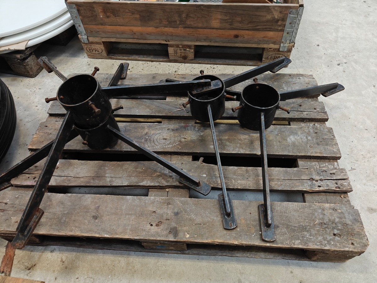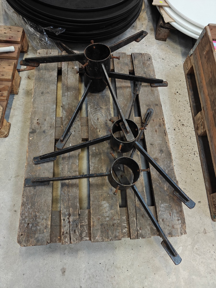 4 juletræsfødder af sortmalet jern på 3 ben. Ø for træ op til 13 cm. Har været brugt udenfor.
