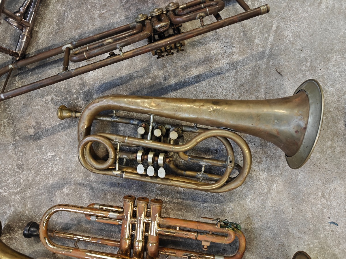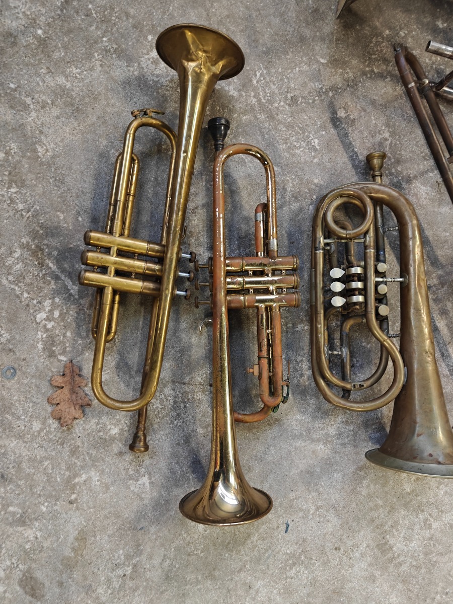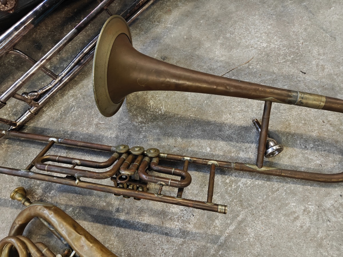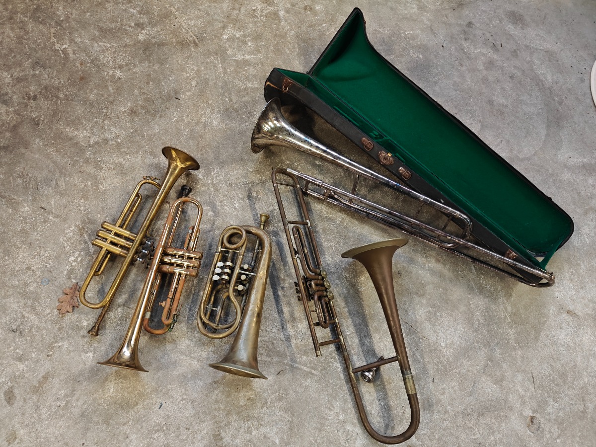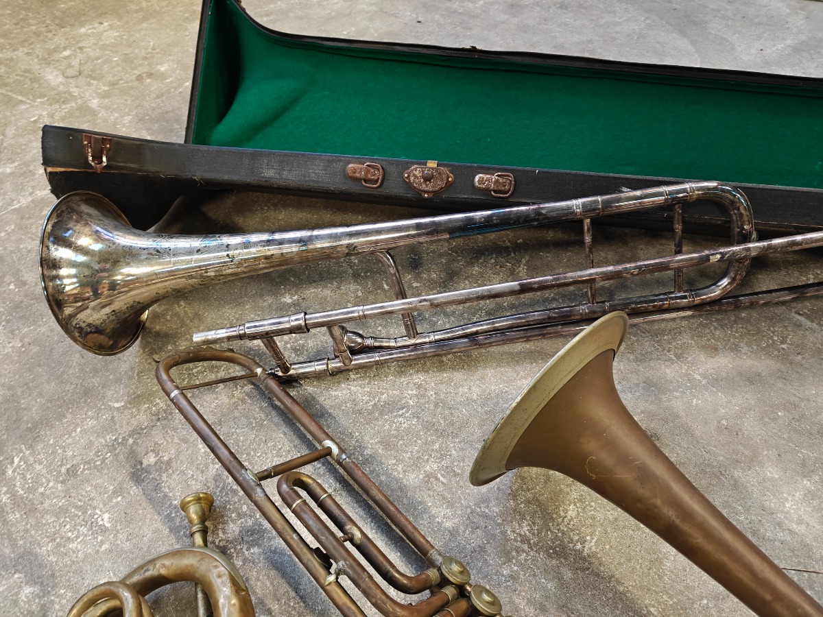 5 blæseinstrumenter: 2 trompeter, 1 kornet og 2 trækbasuner samt en kasse til sidstnævnte. Intstrumenterne bærer præg af manglende pleje. der garanteres ikke for funktionaliteten.
