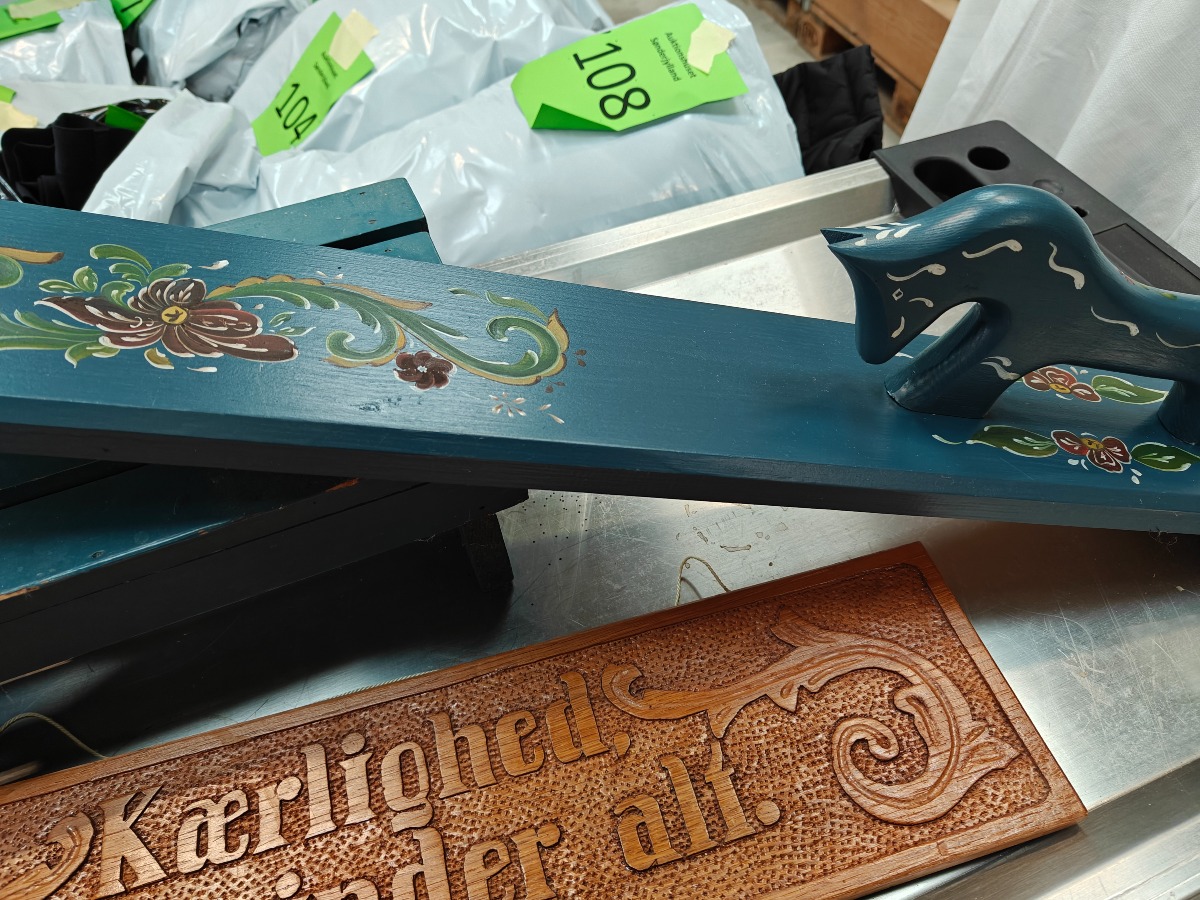 Forskellige træarbejder. Manglebræt, lille skammel, Skilt med udskåret tekst og blæsebælg.