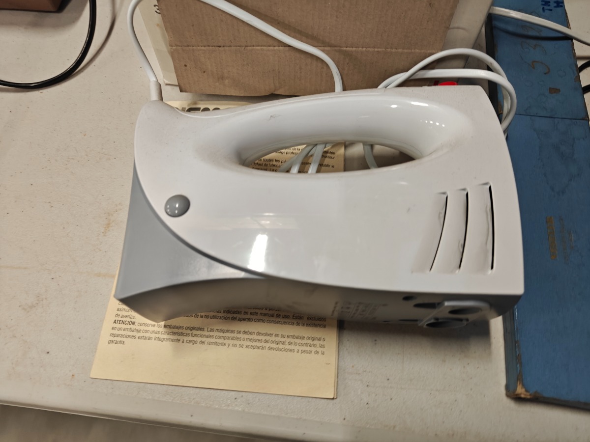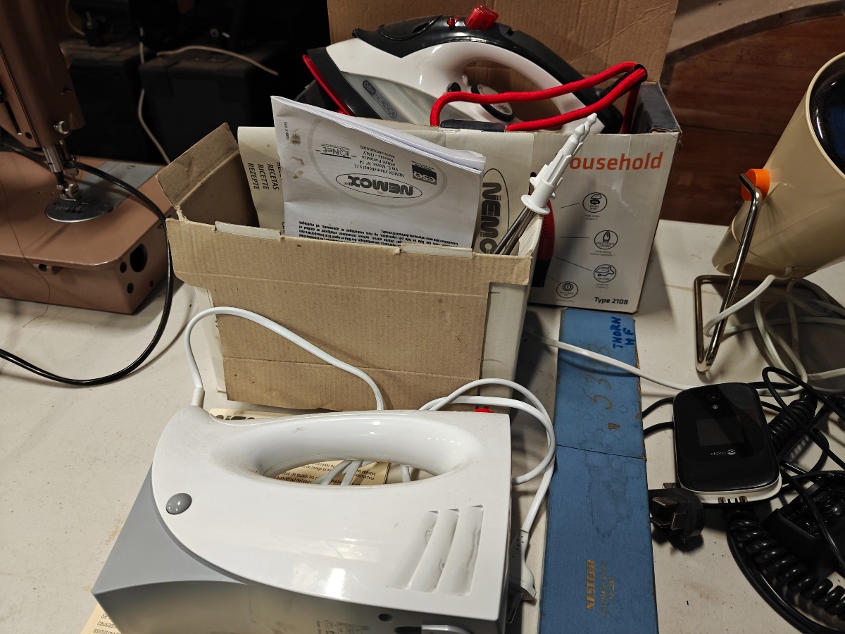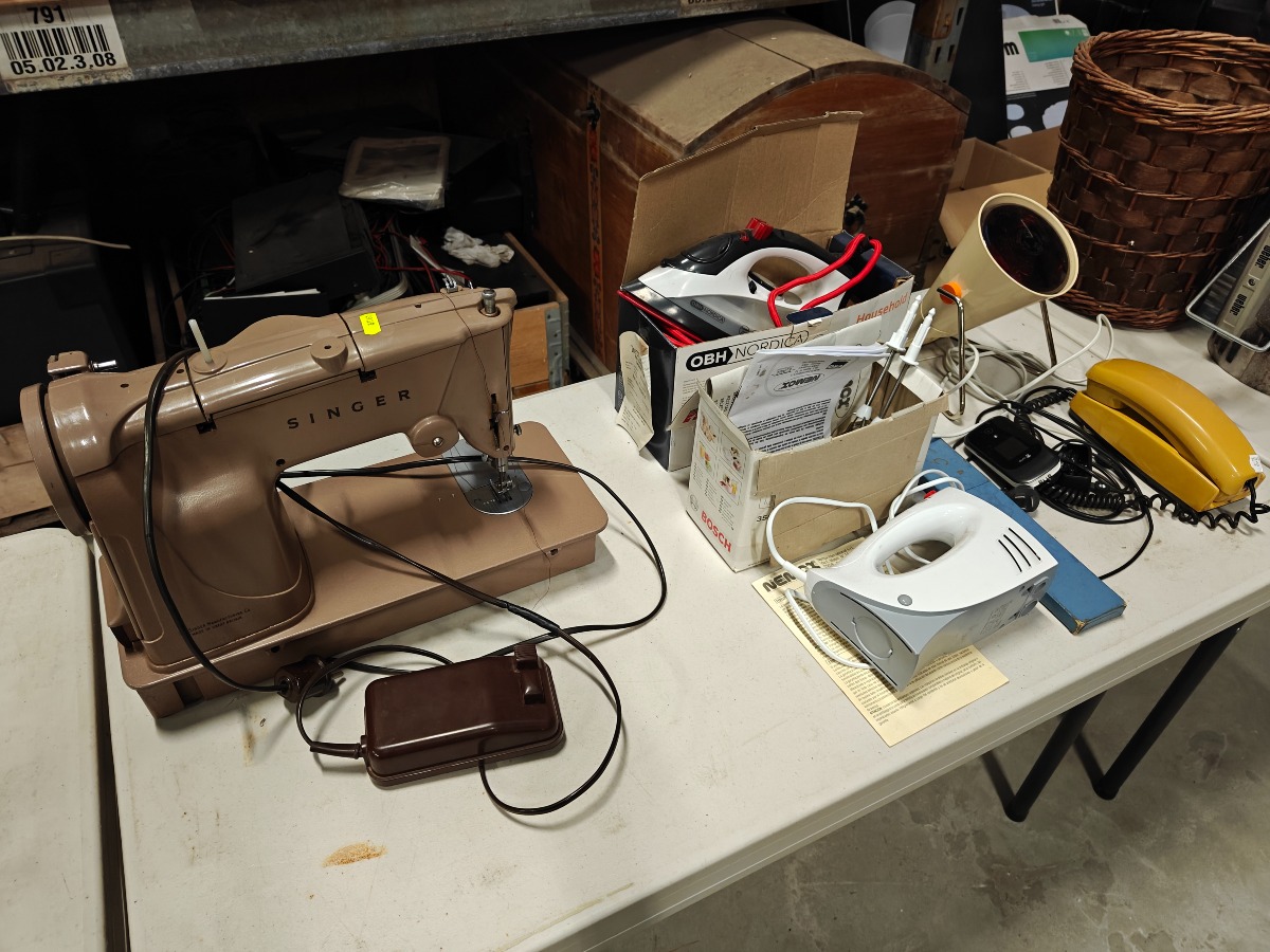 Forskelligt husholdningselektronik. Ældre Singer symaskine, OBH strygejern, håndmixer og andre effekter. Vi garanterer ikke for funktionaliteten.
