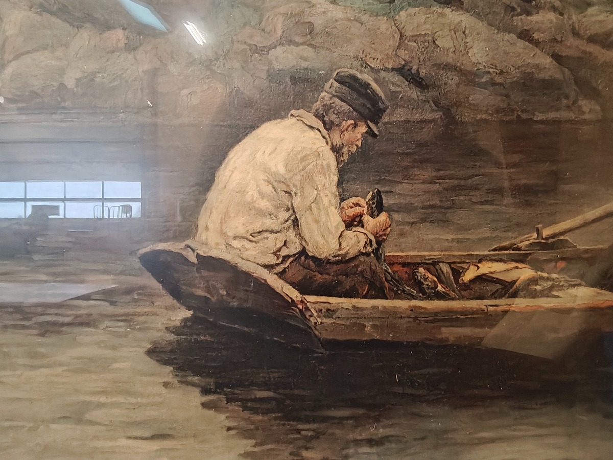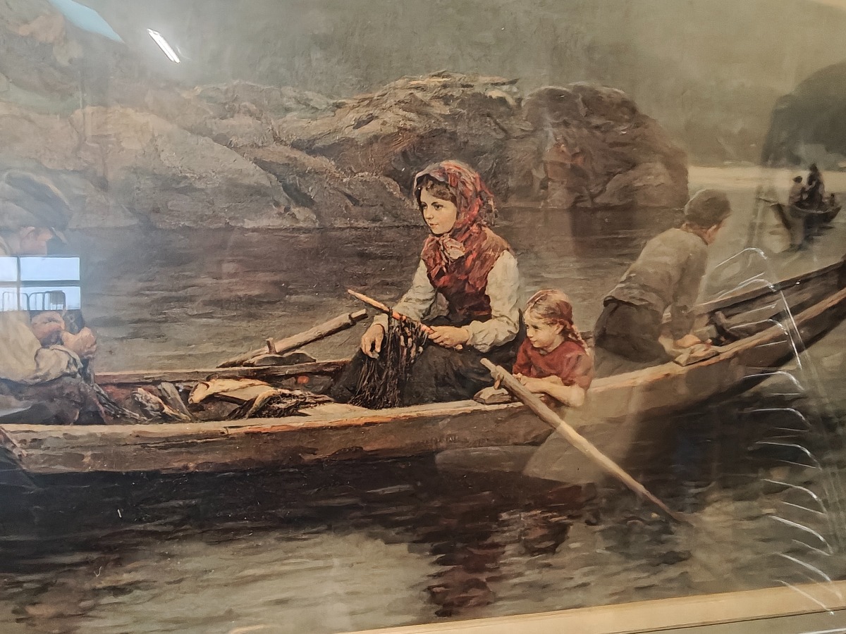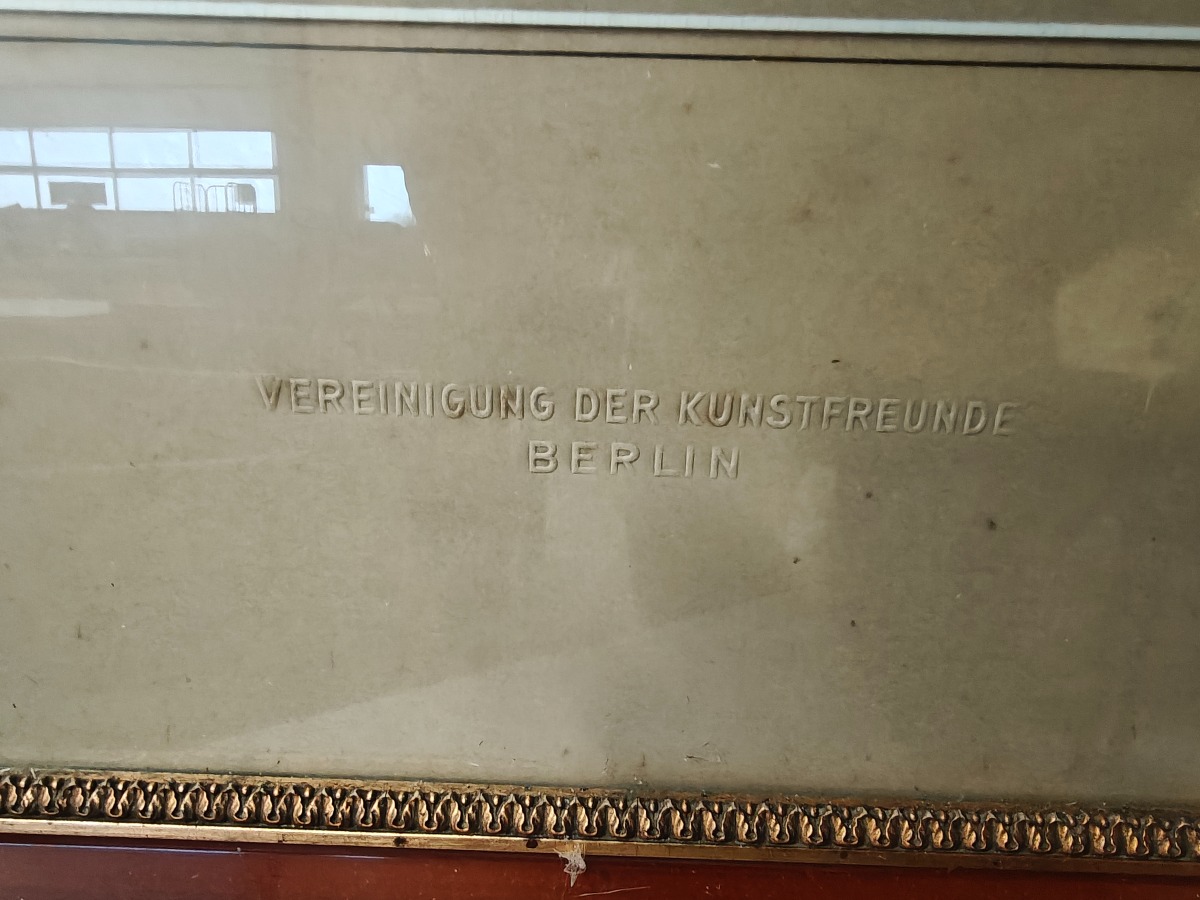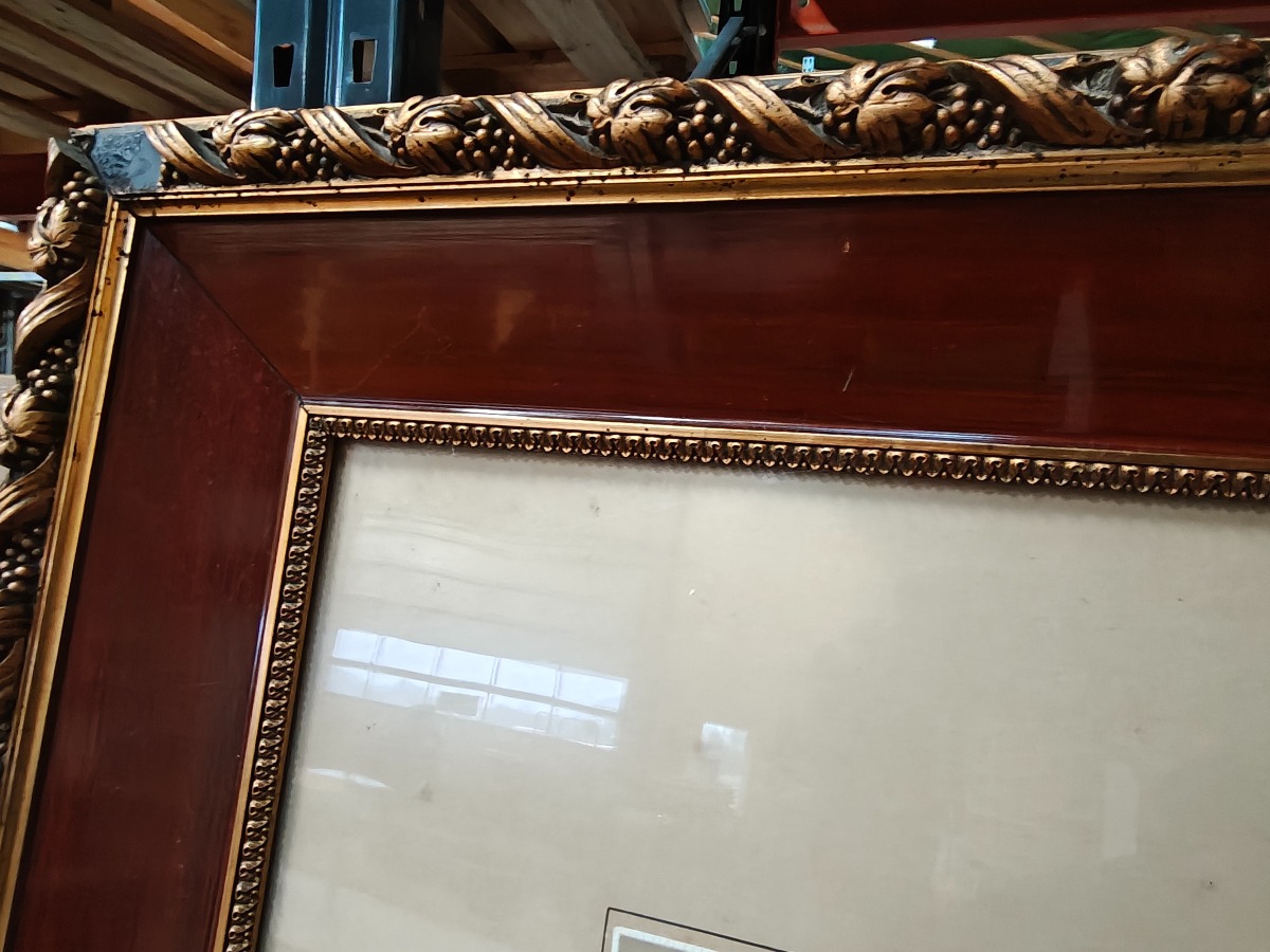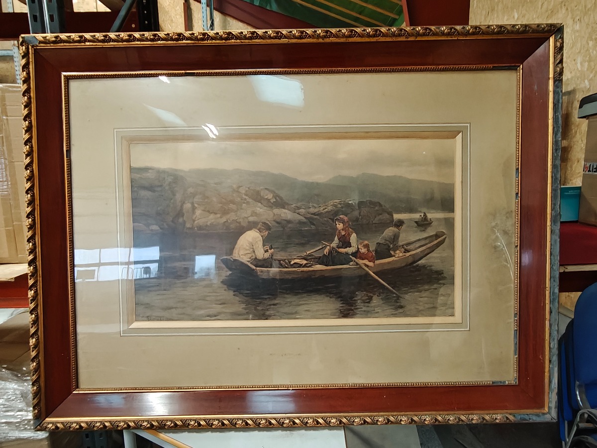 Koloreret tryk med motiv af personer i båd. Indrammet med passe partout  og pragtramme. Ramme med mangler og skjolder på passe partout. 105 x 136 cm.