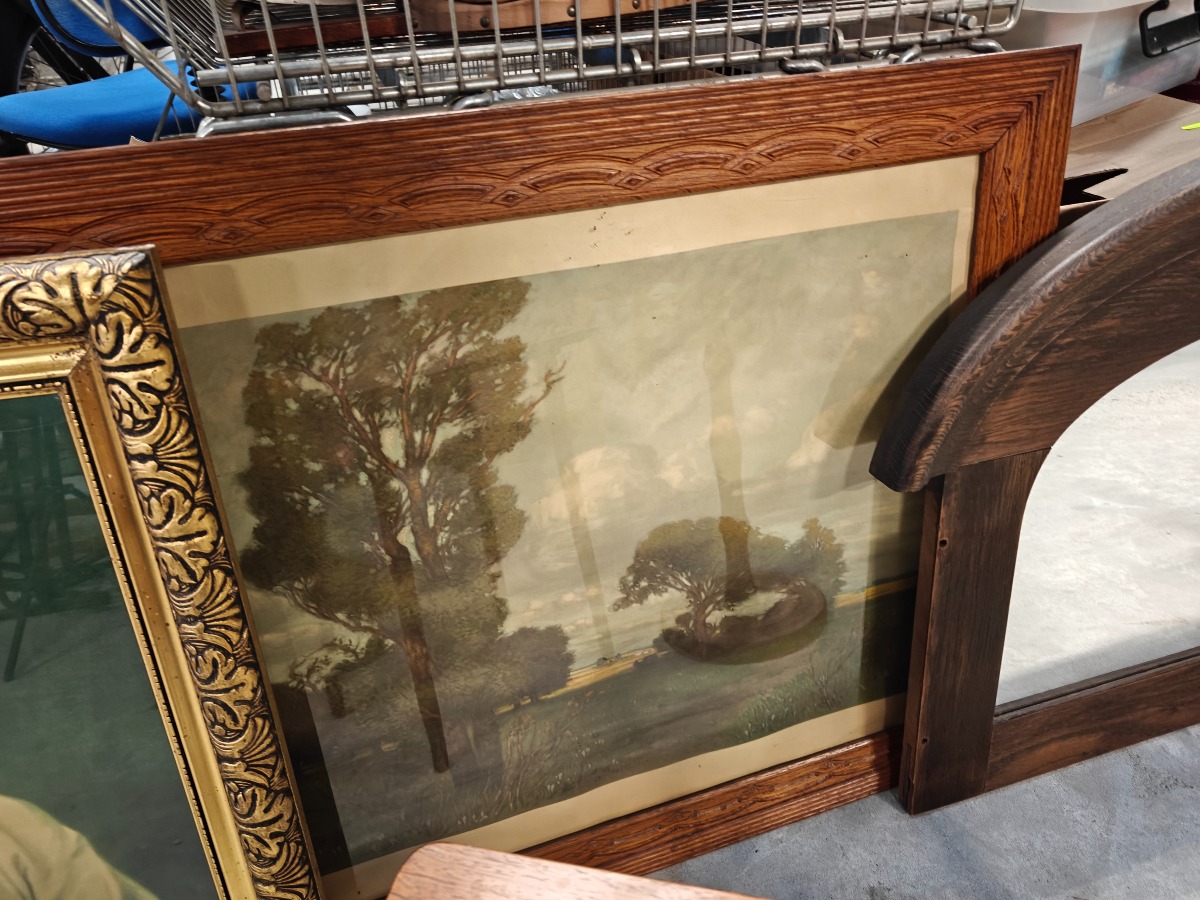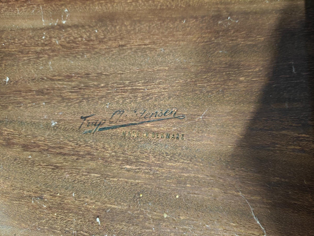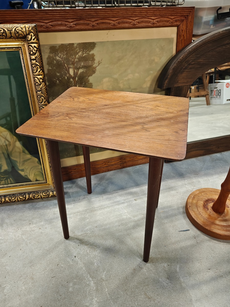 Lille sidebord af teak, Trap Christensen. Del af et sæt indskudsborde. 2 indrammede tryk og et buffet-spejl