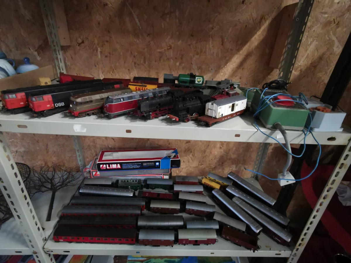 Lima og Fleischmann modeltog Str. H0. Mange forskellige lokomotiver og vogne samt 2 transformatorer. Blandet stand.