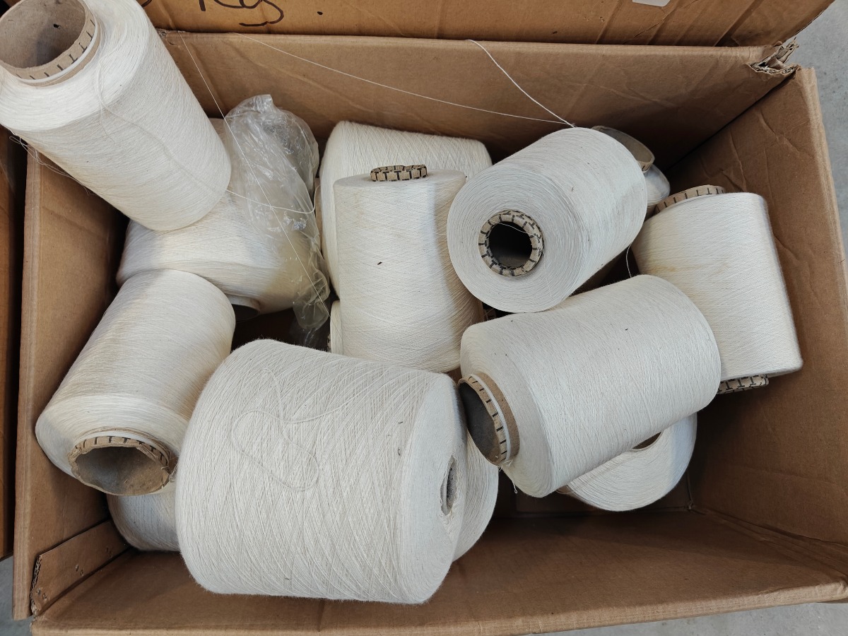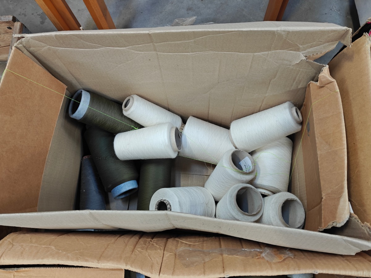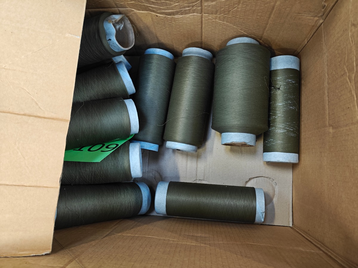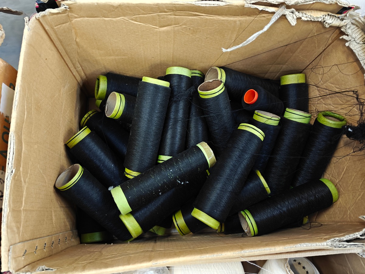 Lot store spoler med sytråd. Forskellige farver og mængde på rullerne.