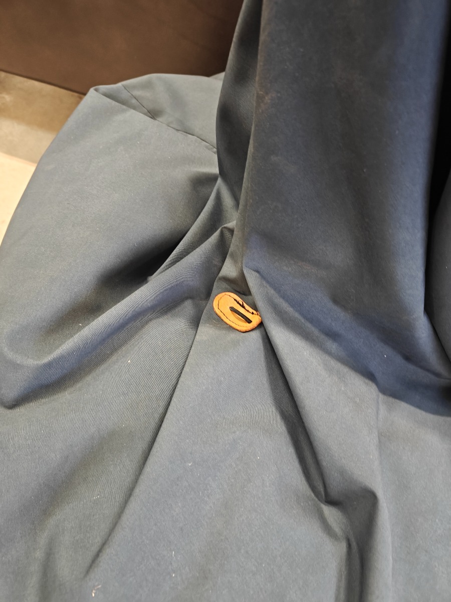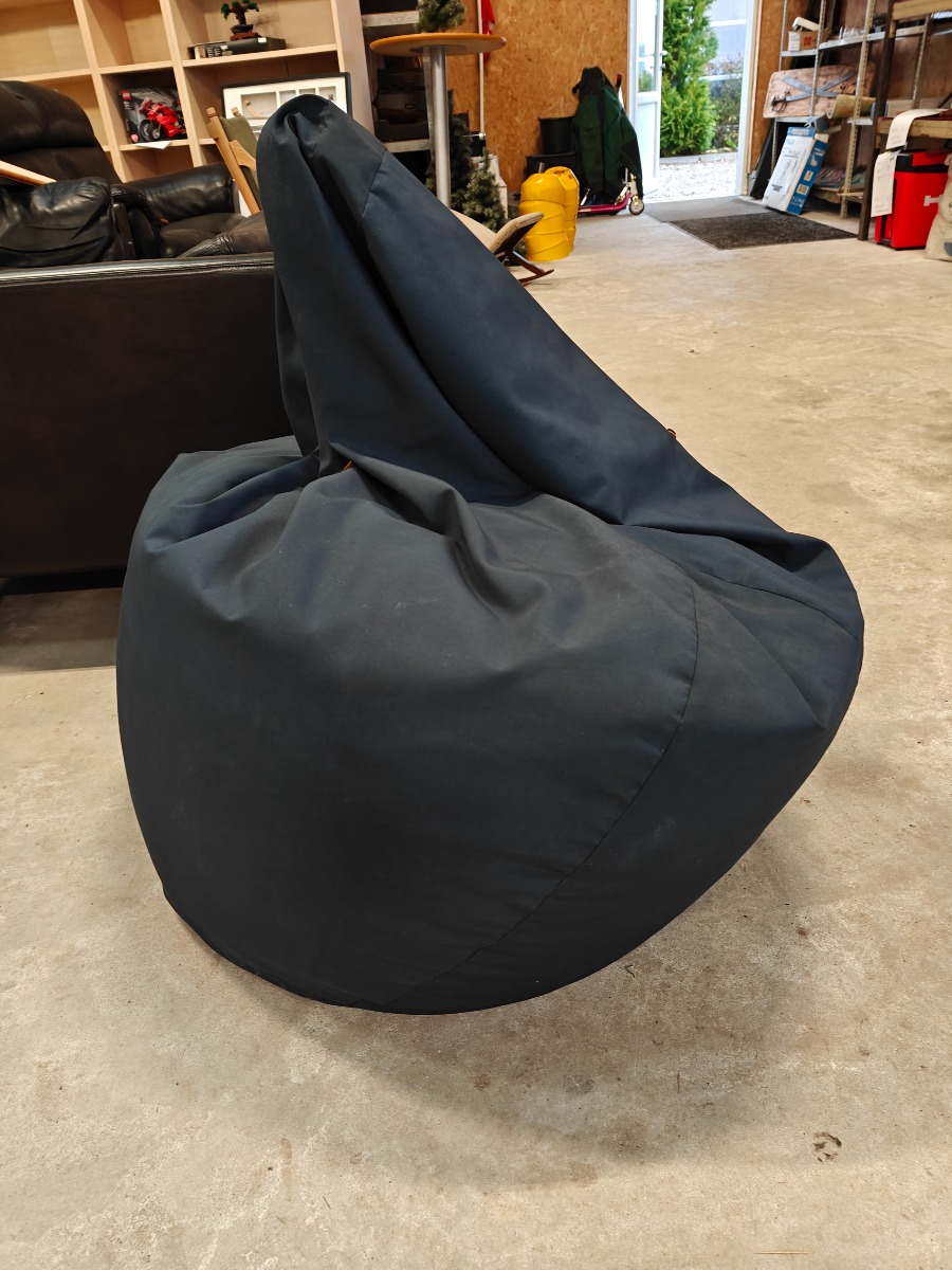 Sækkestol af sort kunststof med læderdetaljer.
