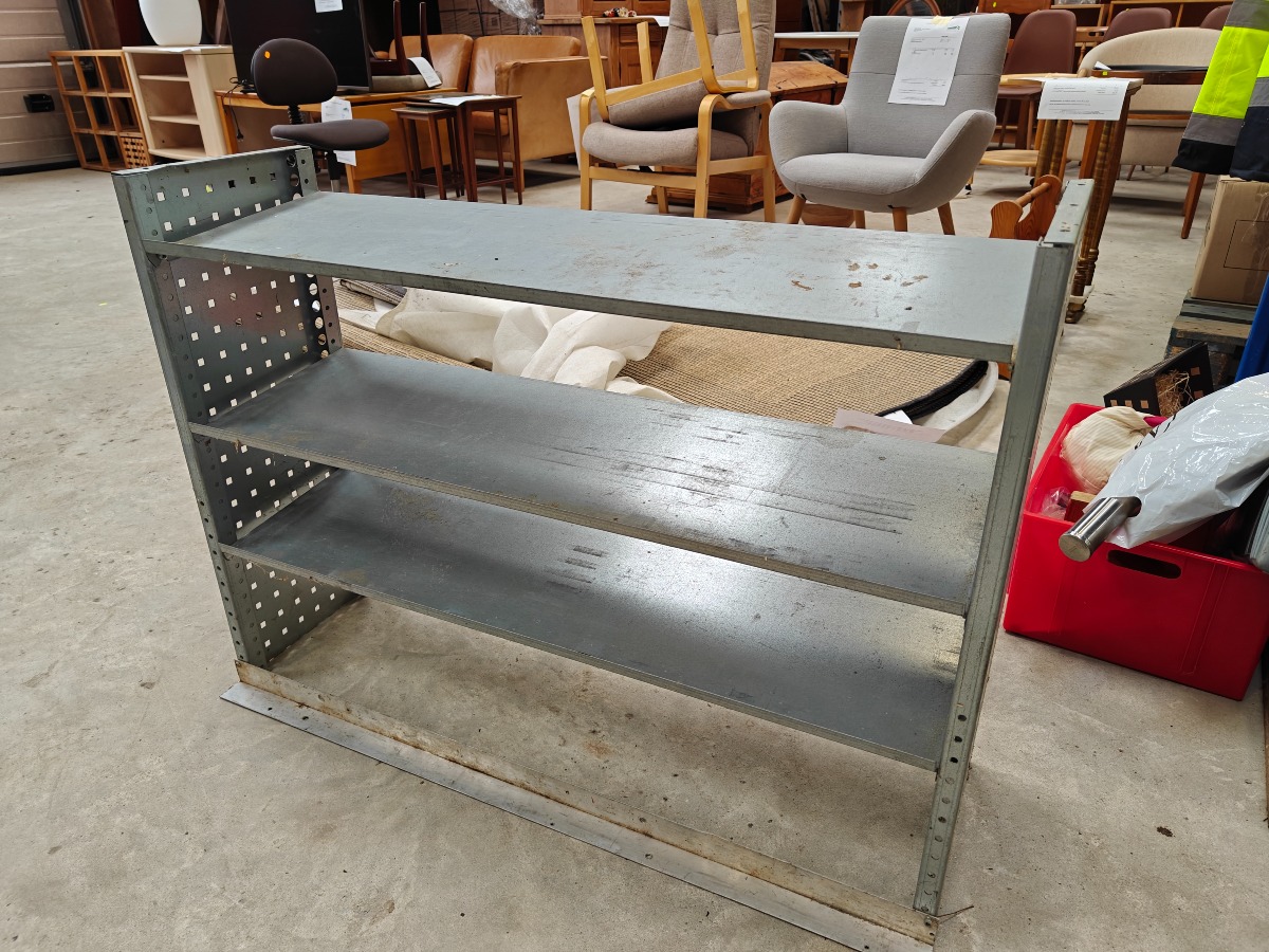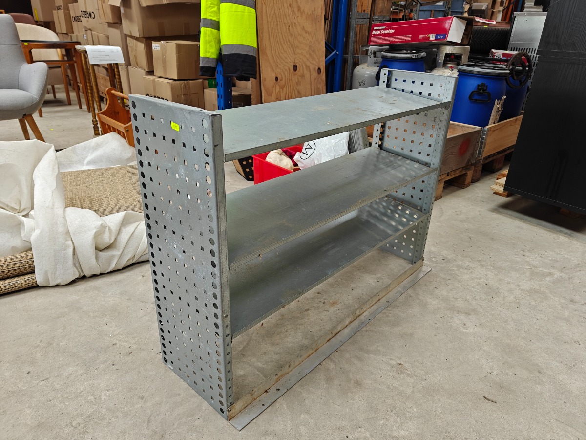 Stålreol, inventar til kassebil. H. 71, B. 98, D. 28 cm.