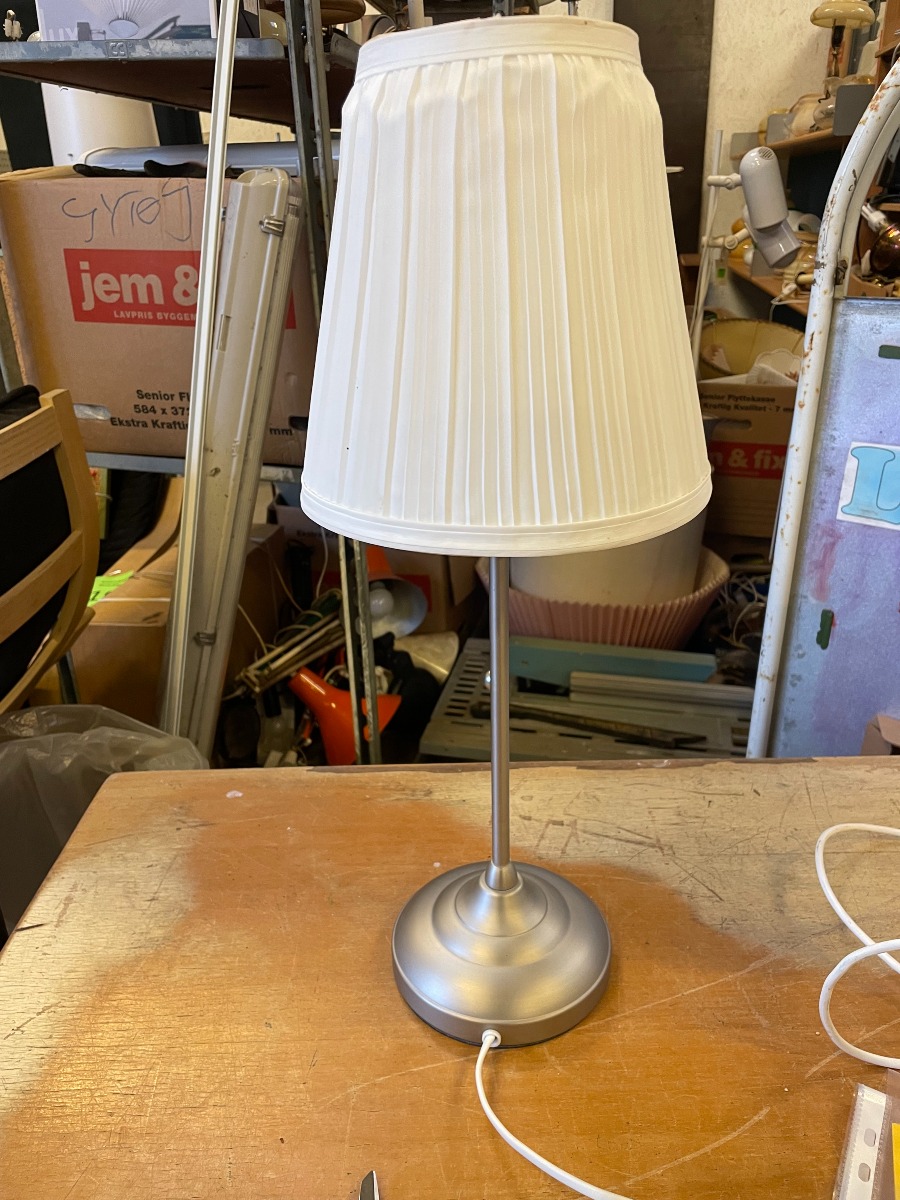 Bordlampen har “børstet stål” fod. Højde 54 inkl skærm