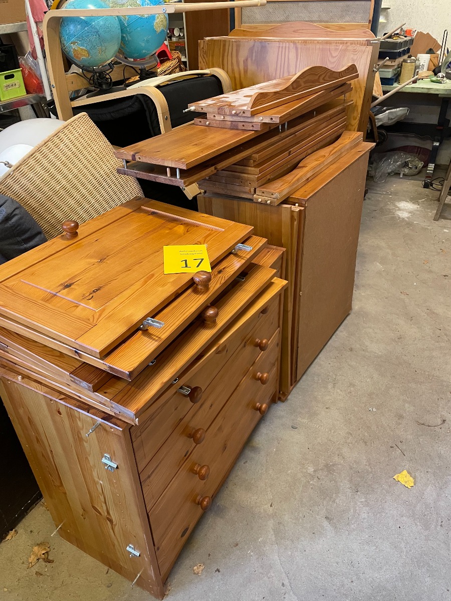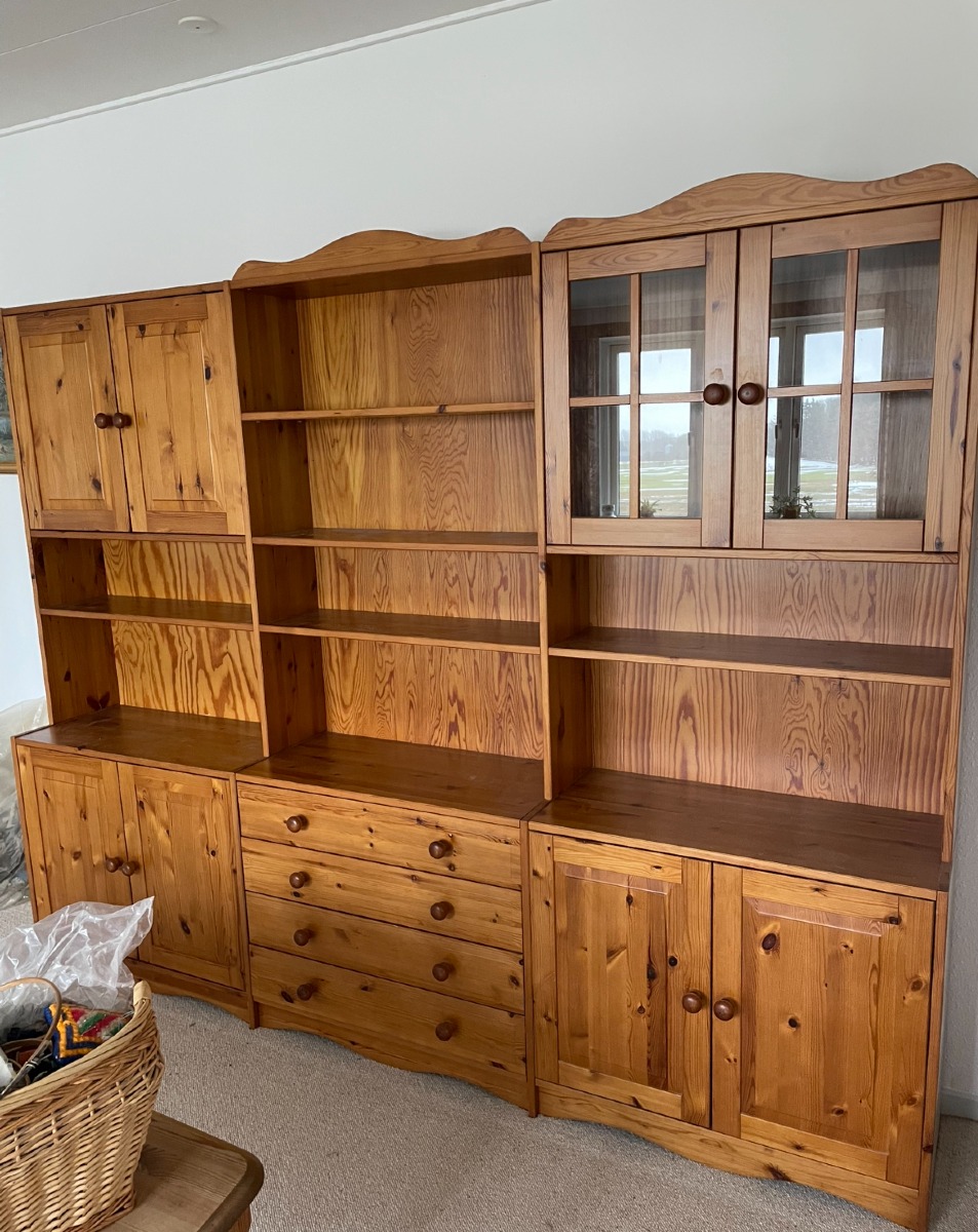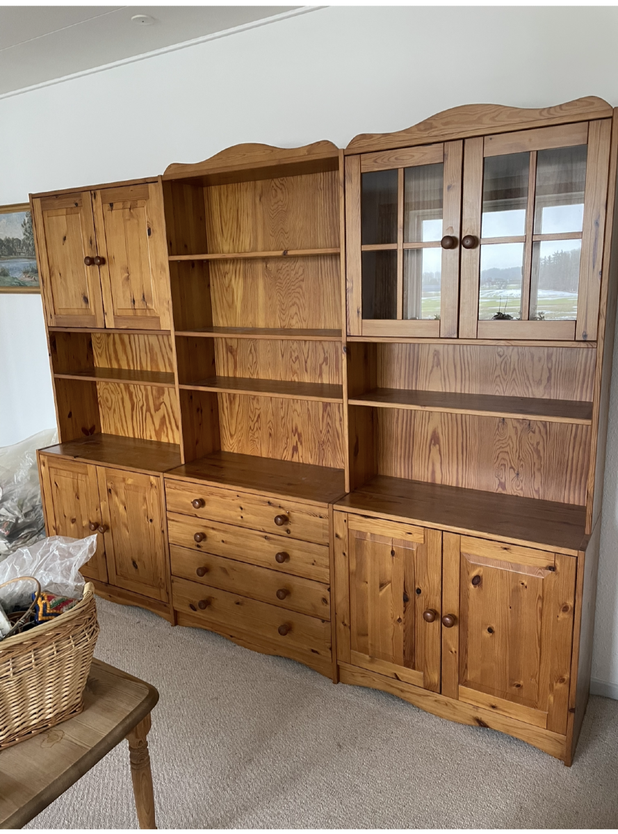 Fyrretræs reol system i 3 fag. 2 underskabe med låger, 1 med skuffer. 1 overskab med glaslåger og 1 hylde. 1 overskab med låger og 1 hylde, 1 overskab med hylder. Står adskilt. Der er 2 låger som skal har små skader og skal limes. Mål: B. 242 x D 41 x H 194cm. Varerne brugte og med forventelige brugsspor.