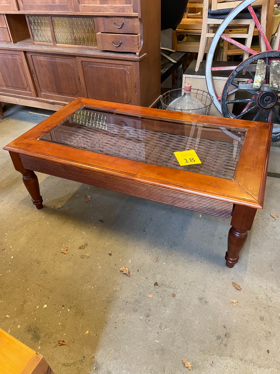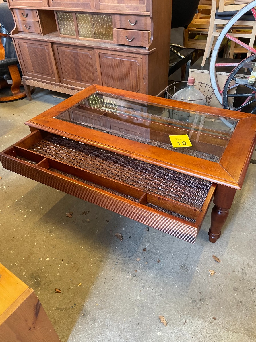 Sofabord i mørkt træ med glasplade og praktisk skuffe.