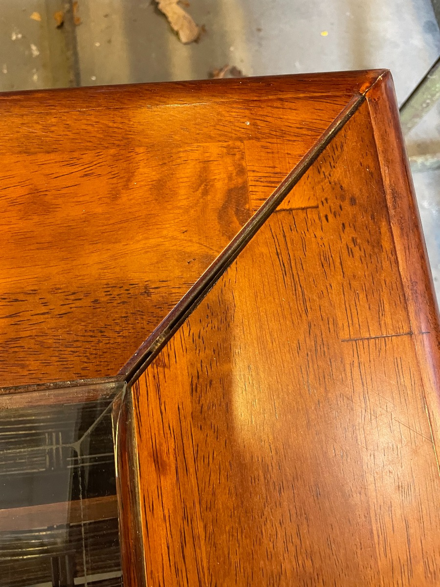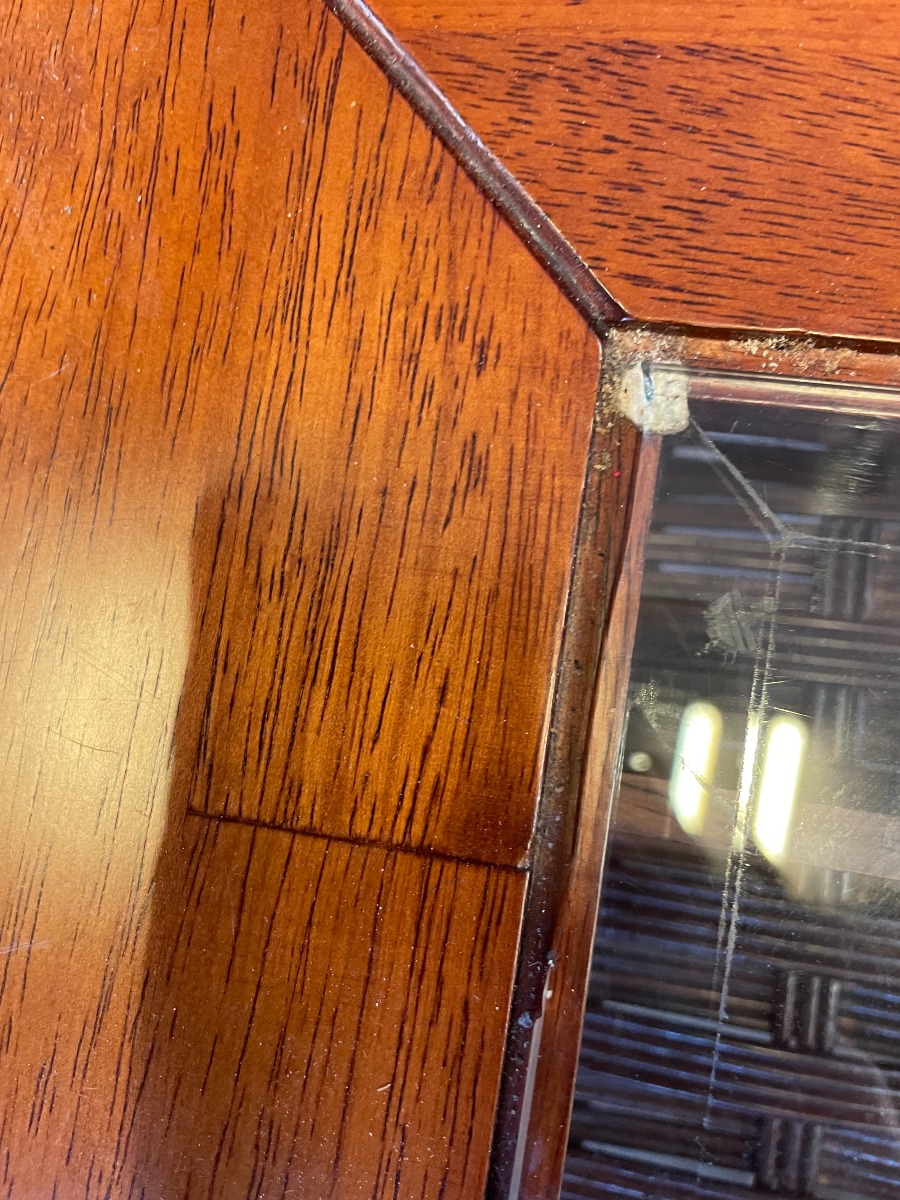 Lille afslag på glasplade, skjult af hvile listenh. Tørrevne i hjørne.