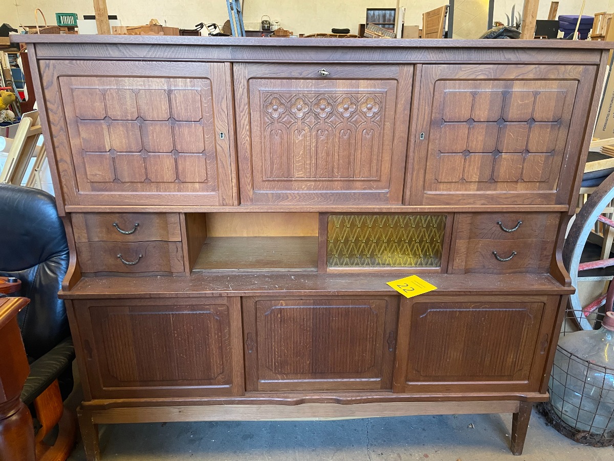 Rigt prydet med udskæringer. 150 x 165 x 45. Enkelte finer afslag forkommer.