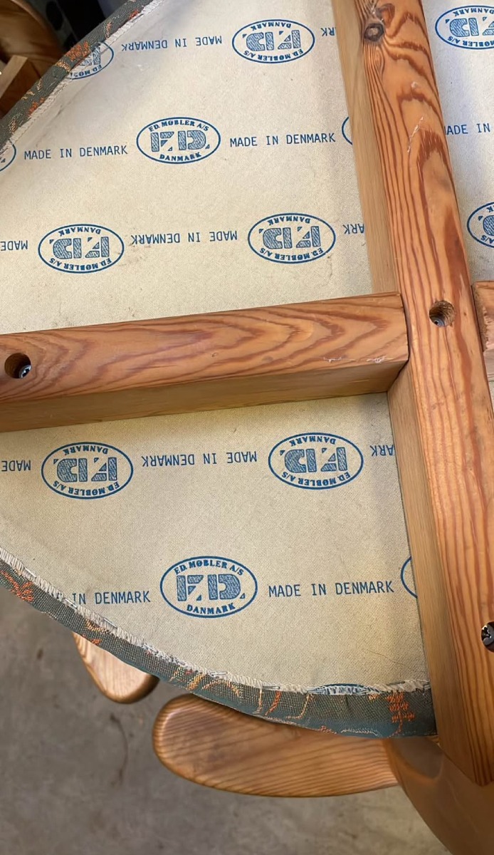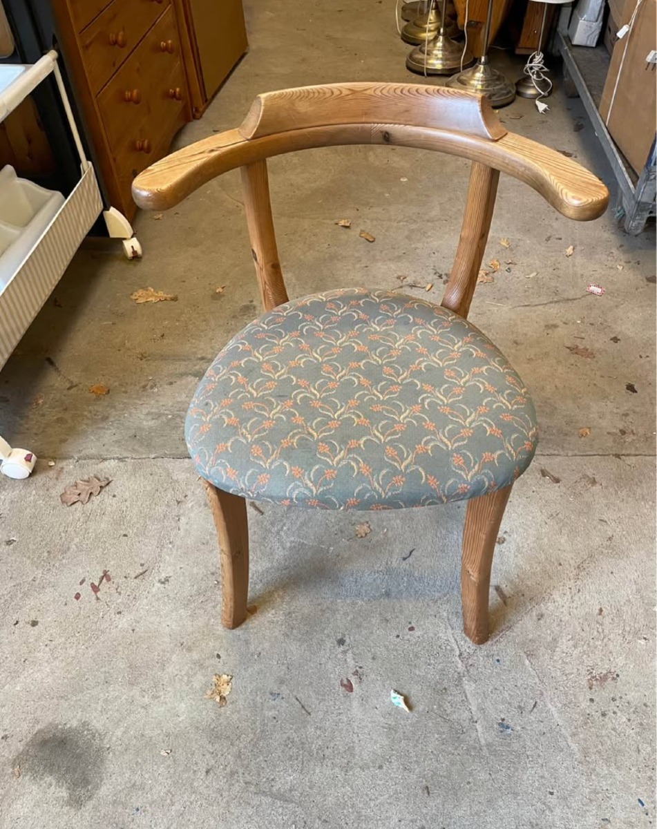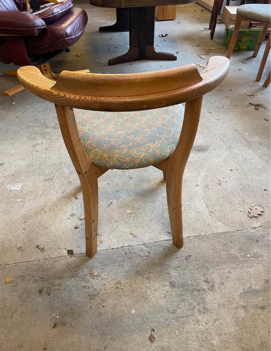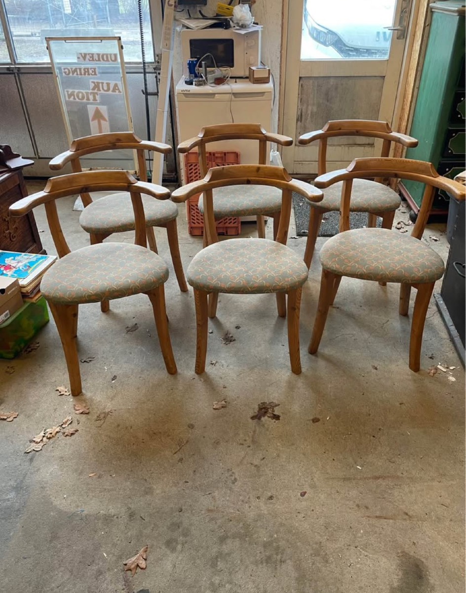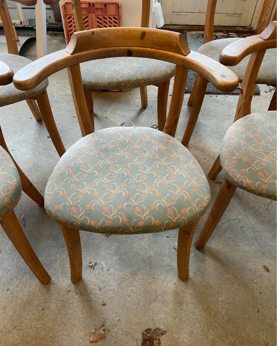 6 F. D. møbler - spisestuestole i massiv fyrretræ i Rainar Daumiller stil. Udført i fyrretræ med polstret sæde i stof. Enkelt revne i  polsteret på en stol. Trænger til opstramning. Mål: B: 57cm x D52cm x H: 741cm sædehøjde 45cm.