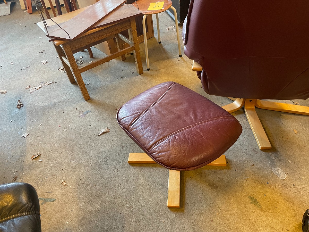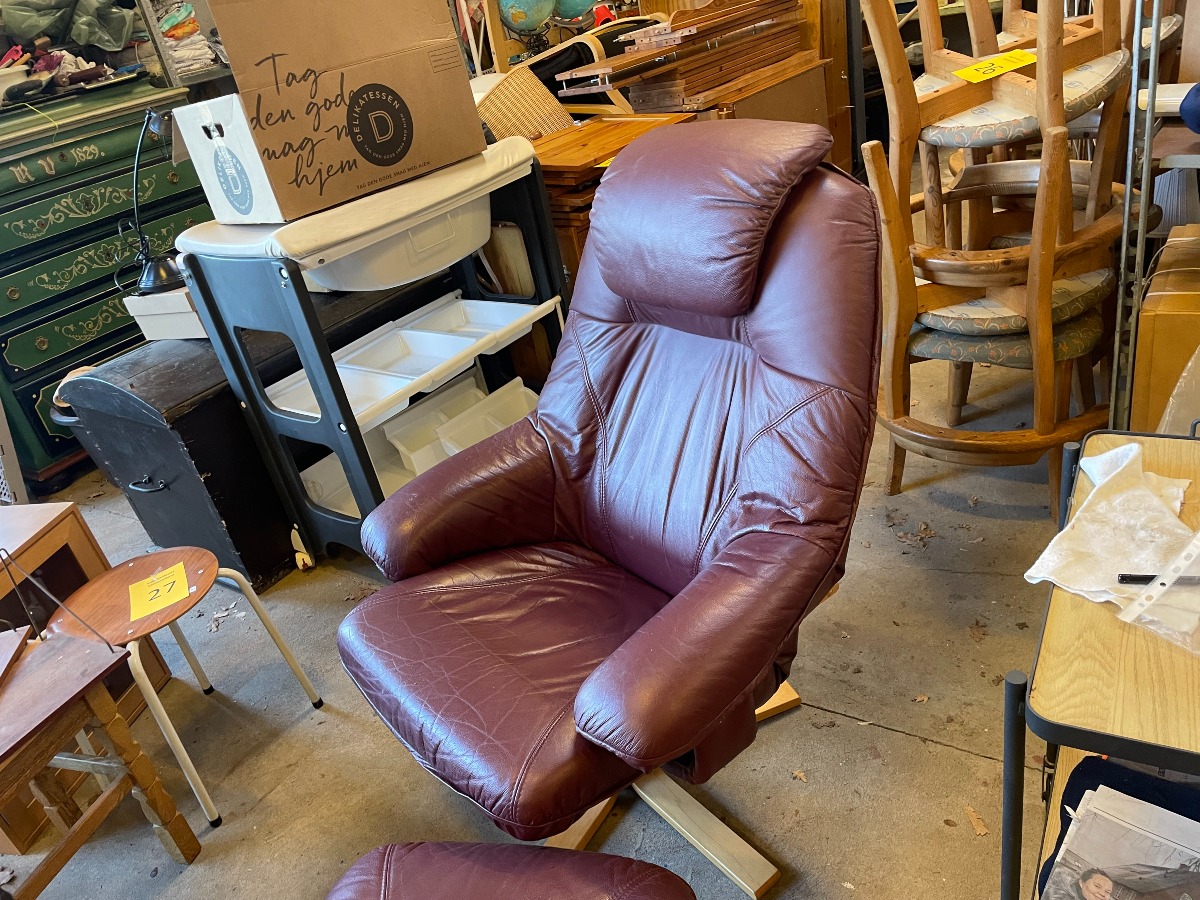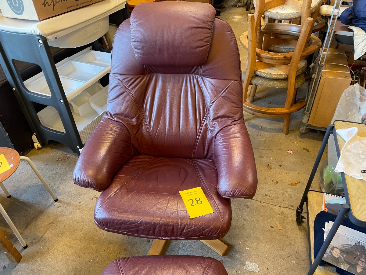 Lænestol med skammel. Monteret med bourdeaux læder.