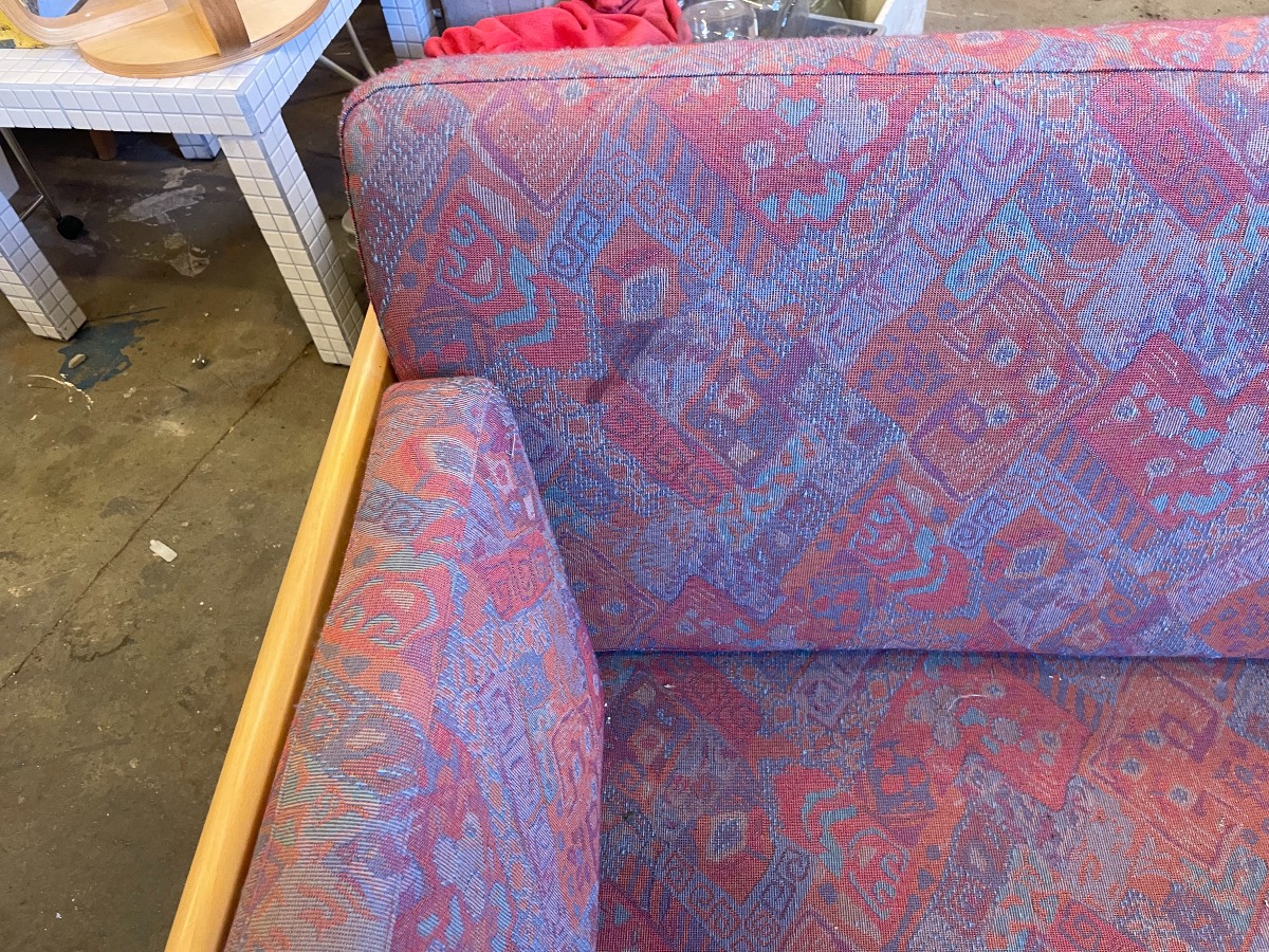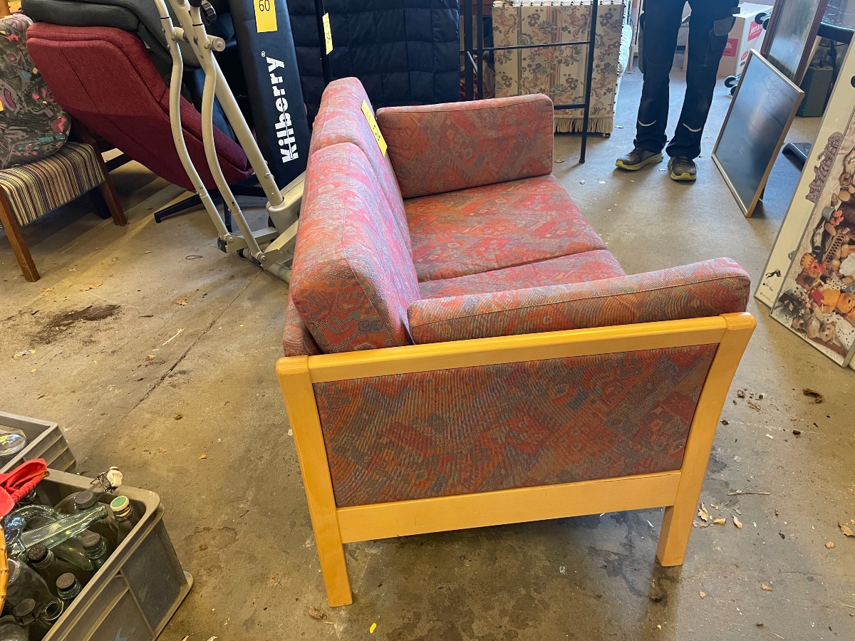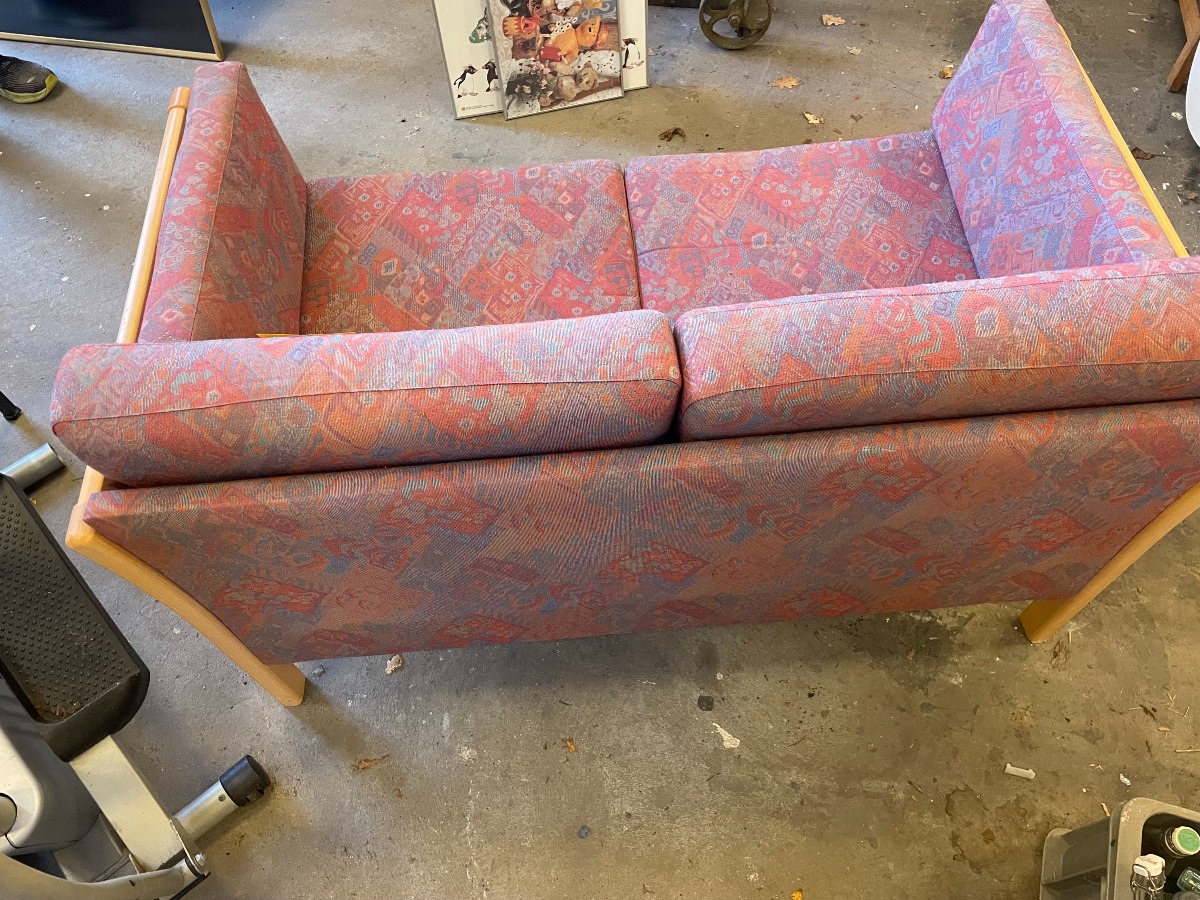 2 personers sofa med stel i formspændt bøg og multifarvet betræk. Lille plet på betræk.