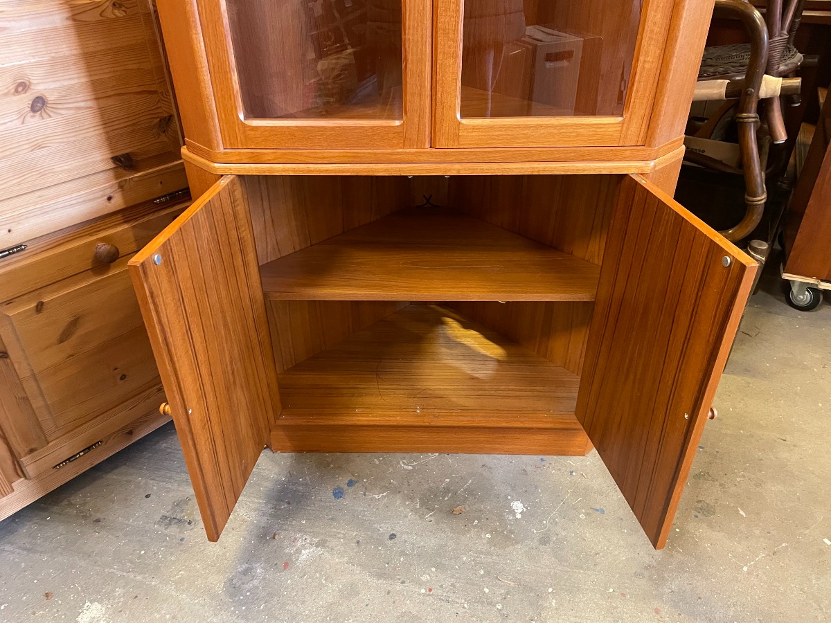 Nyere hjørneskab af teak. Vitrine overdel indrettet med glashylder og lys. Mål: 170 x 85 x 50 cm.