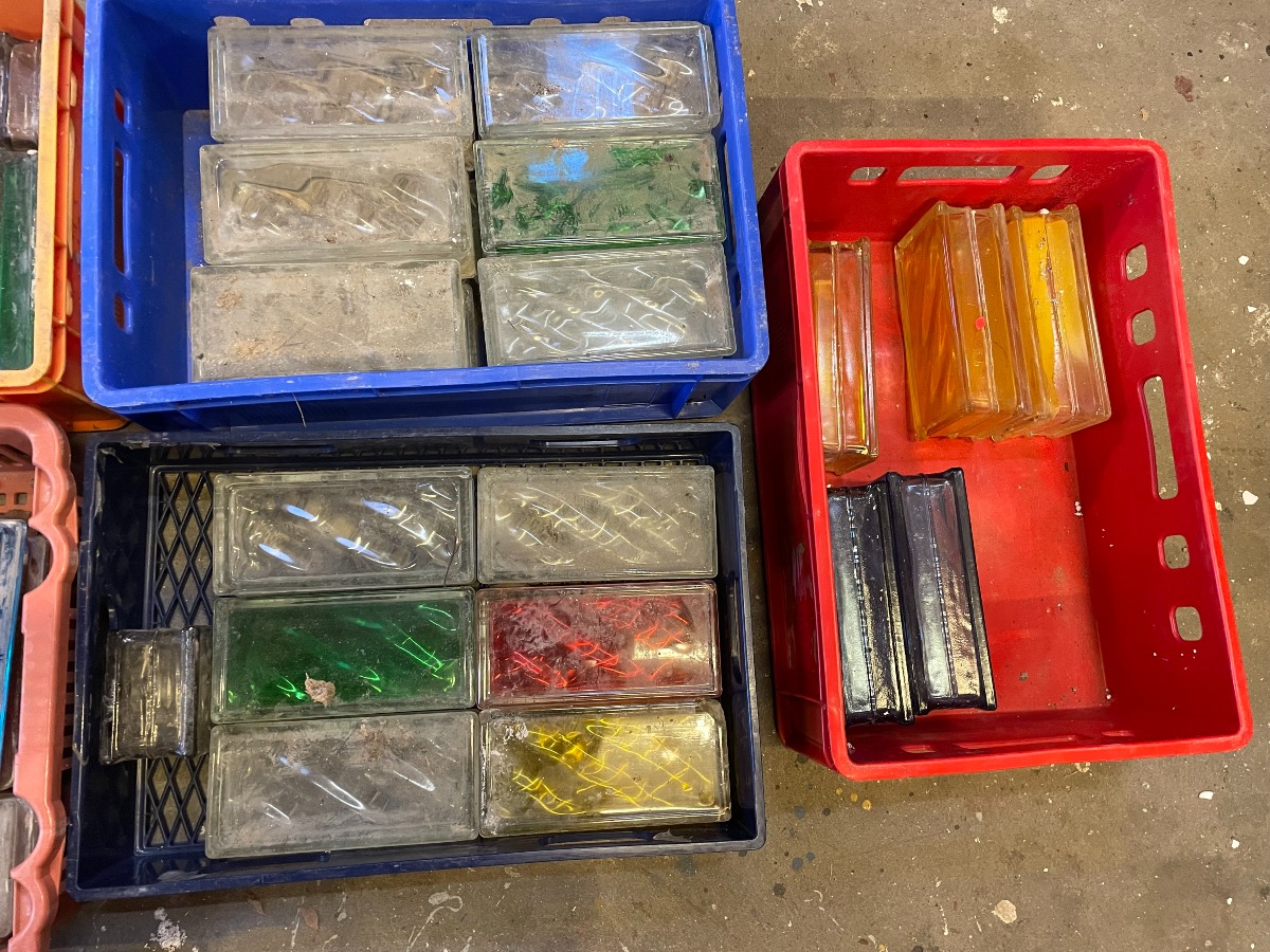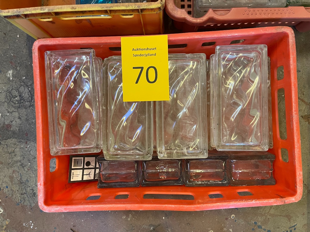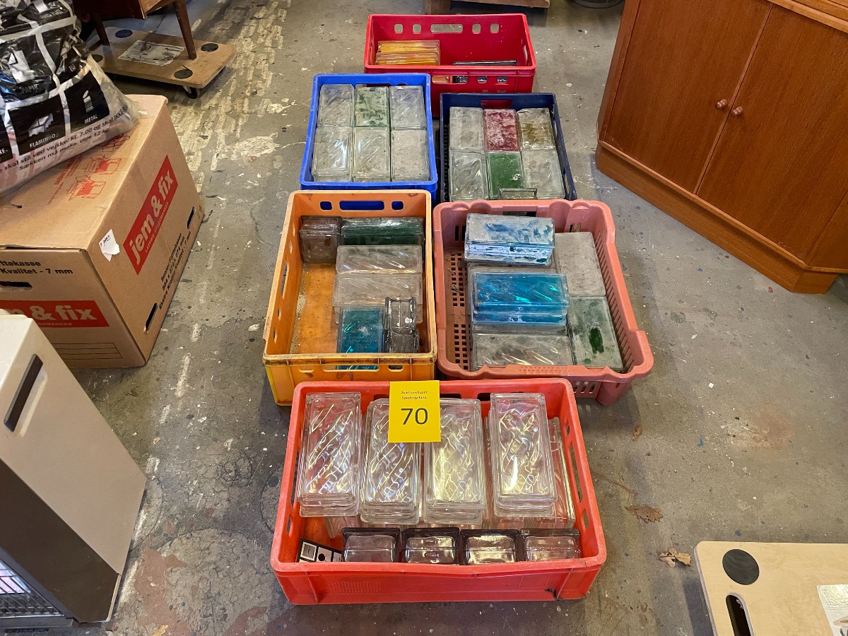 Glasbyggesten farvede og klare. 9 x 19 x 8 for de rektangulære. Plastkasser medfølger ikke.
