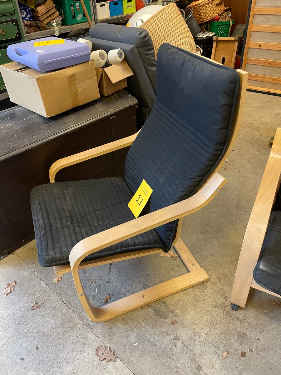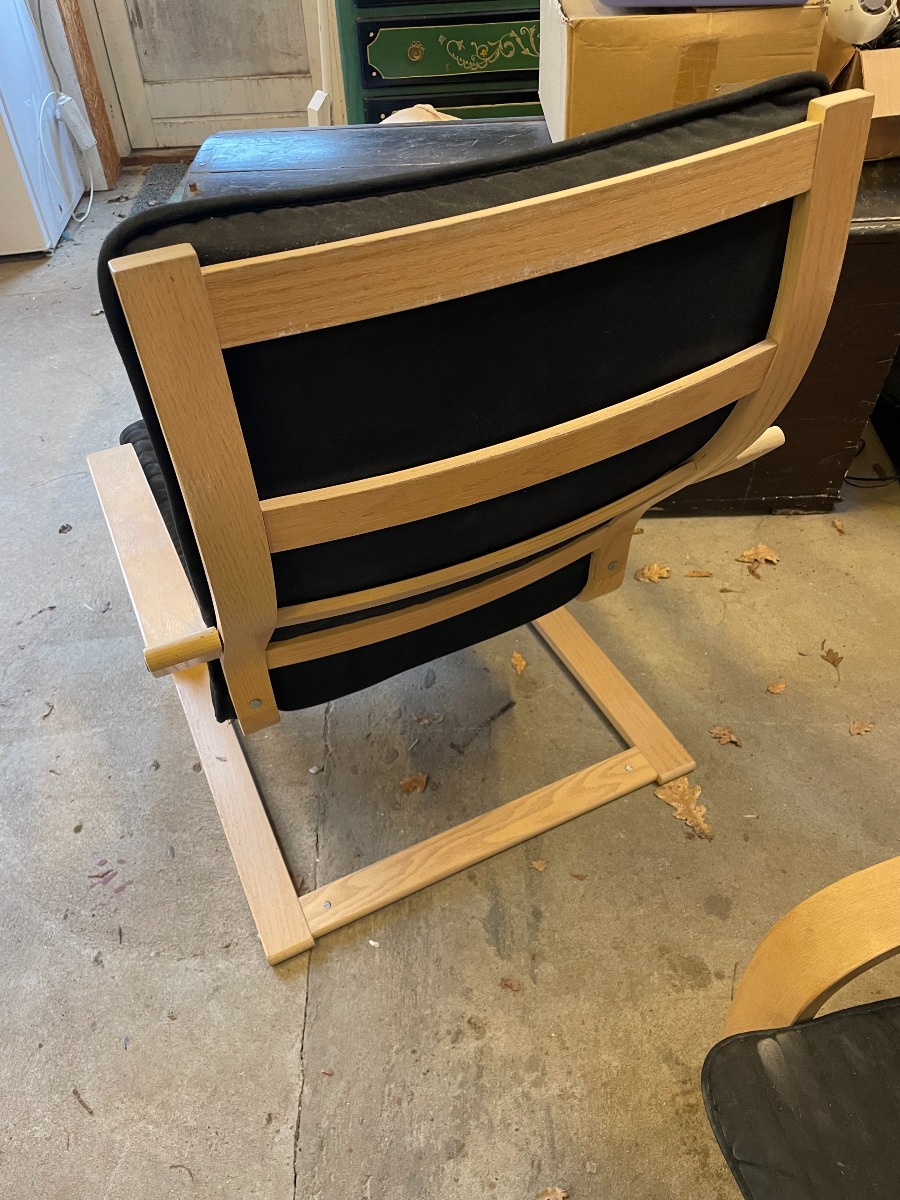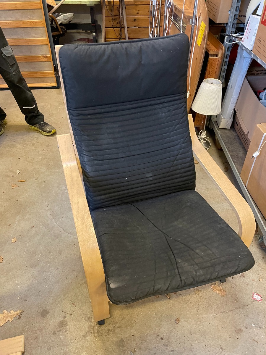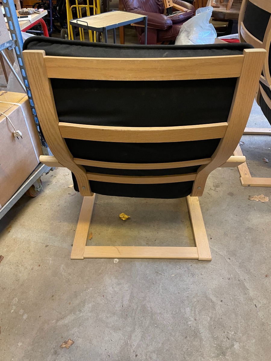 Par IKEA Poäng frisvingere. Formbøjet bøg med mørk sædehynde. Trænger til rengøring. Varerne brugte og med forventelige brugsspor.