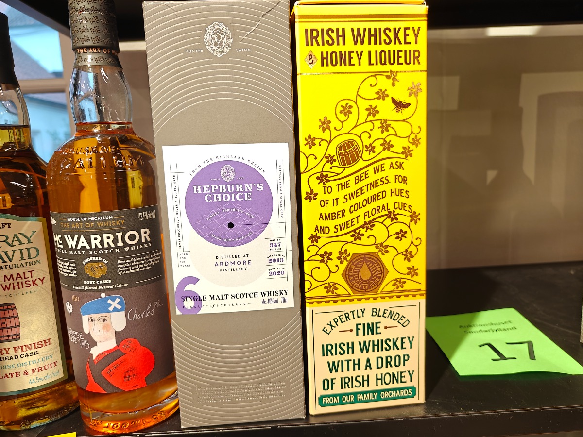 Udvalg af single malt og likør. Se foto for detaljer.