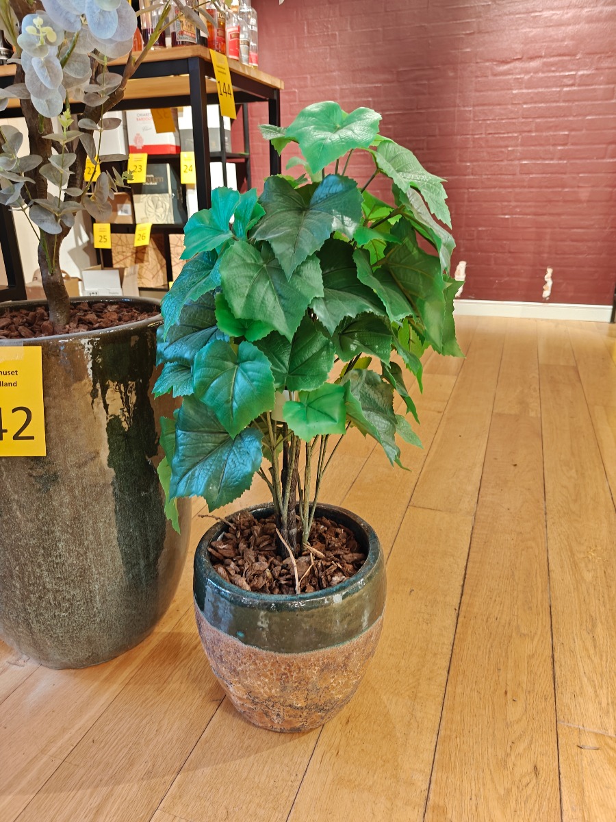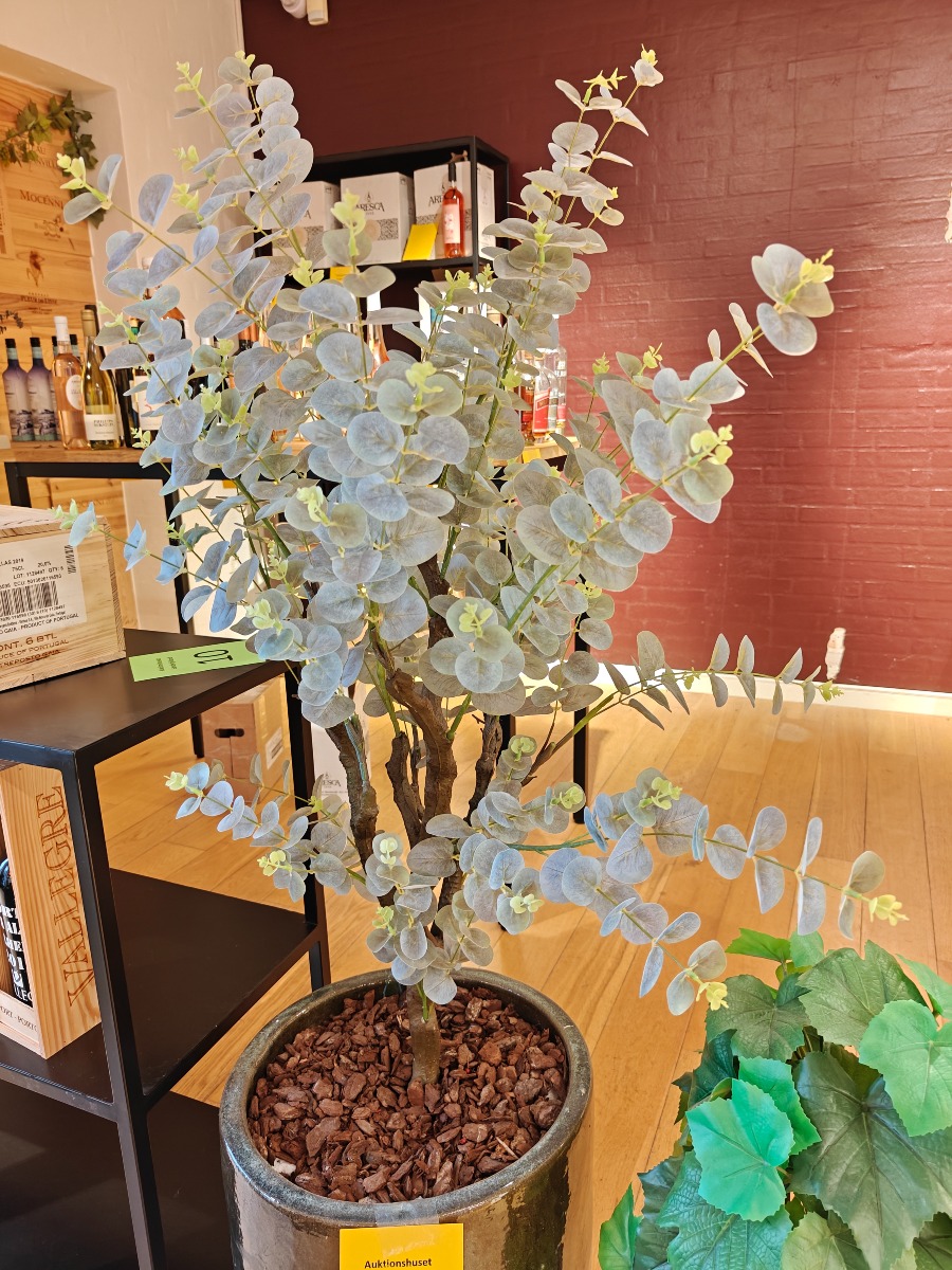 Kunstig eukalyptus og vinstok. Stående i krukker. Højde for største ca. 140 cm.