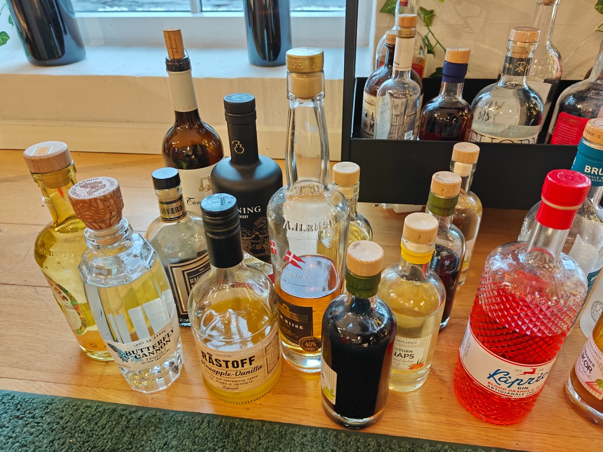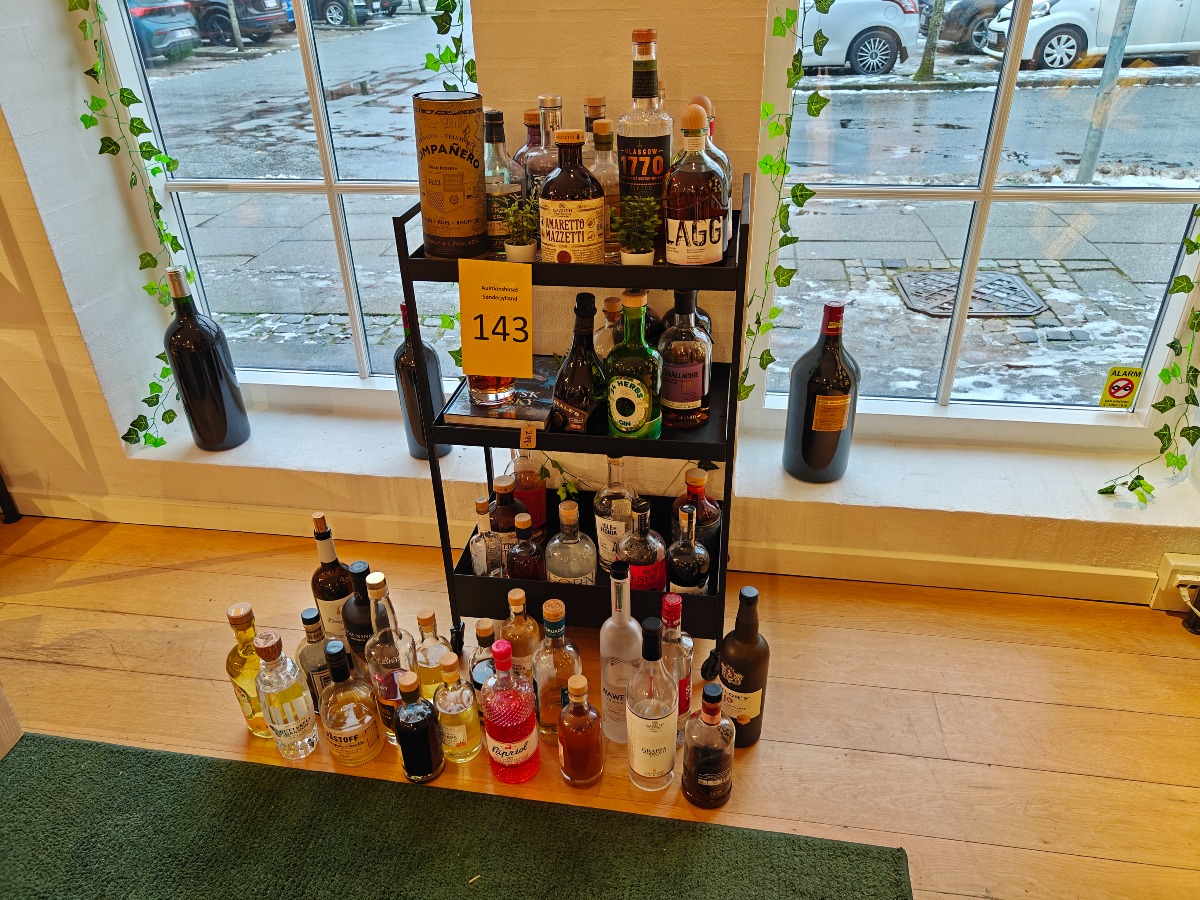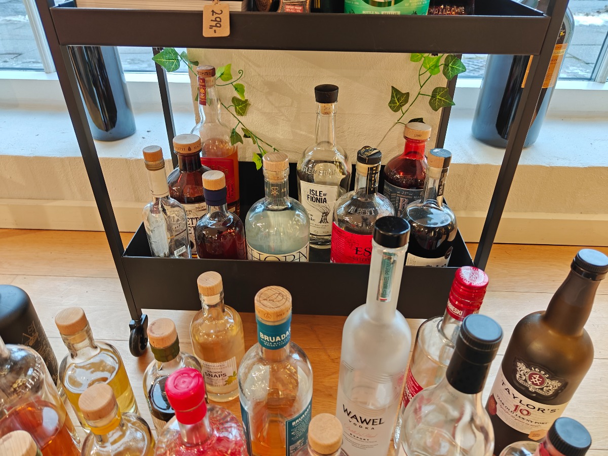 Stort udvalg af flasker brugt til smagsprøver. Rullebord planter og bøger medfølger ikke.