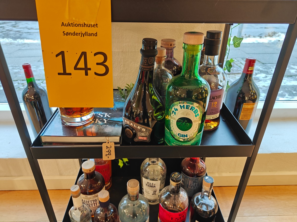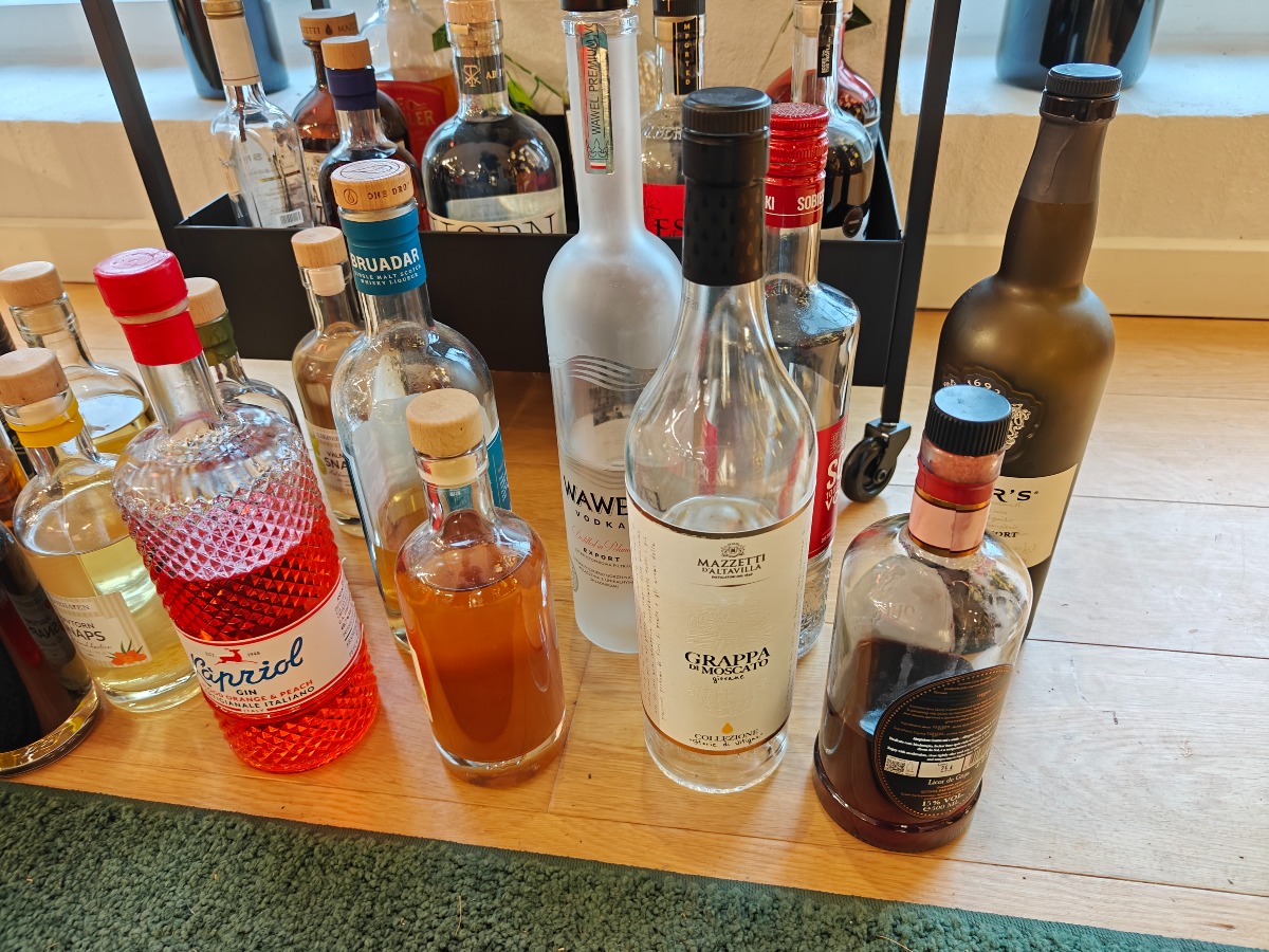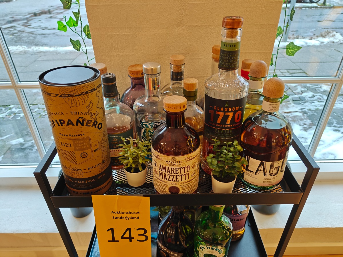 Stort udvalg af flasker brugt til smagsprøver. Rullebord planter og bøger medfølger ikke.
