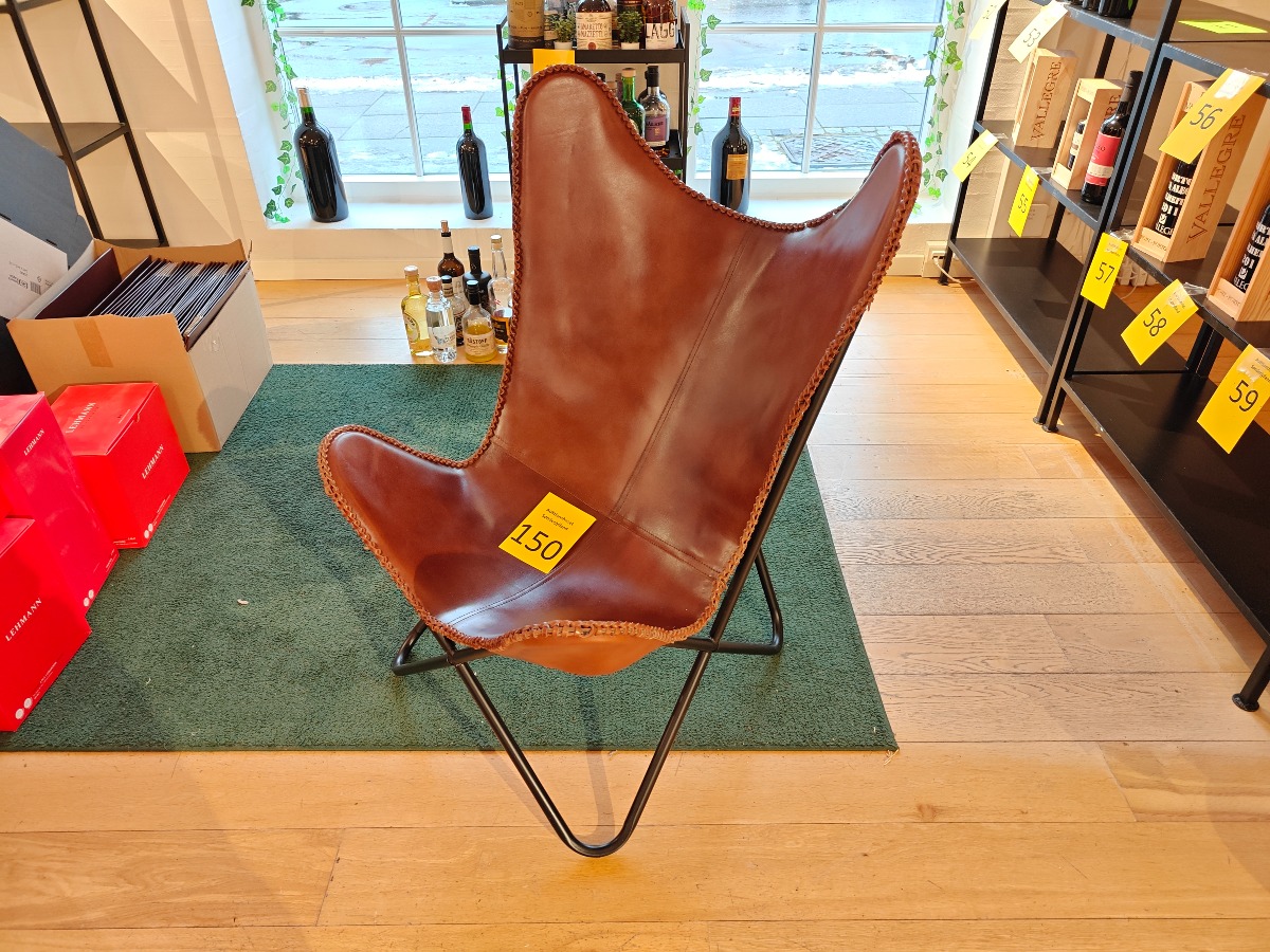Butterfly-stol på mørklakeret stålstel. Sæde af cognacfarvet kernelæder.