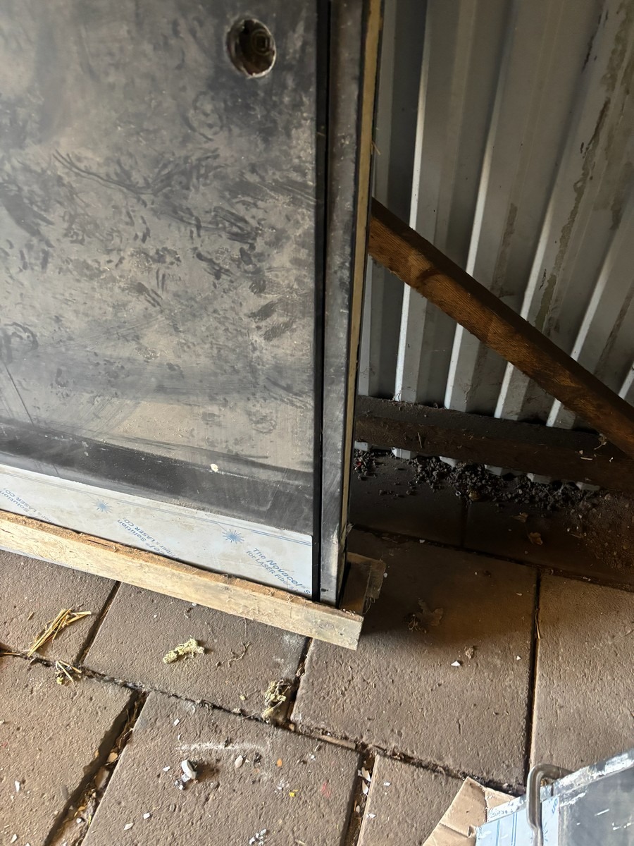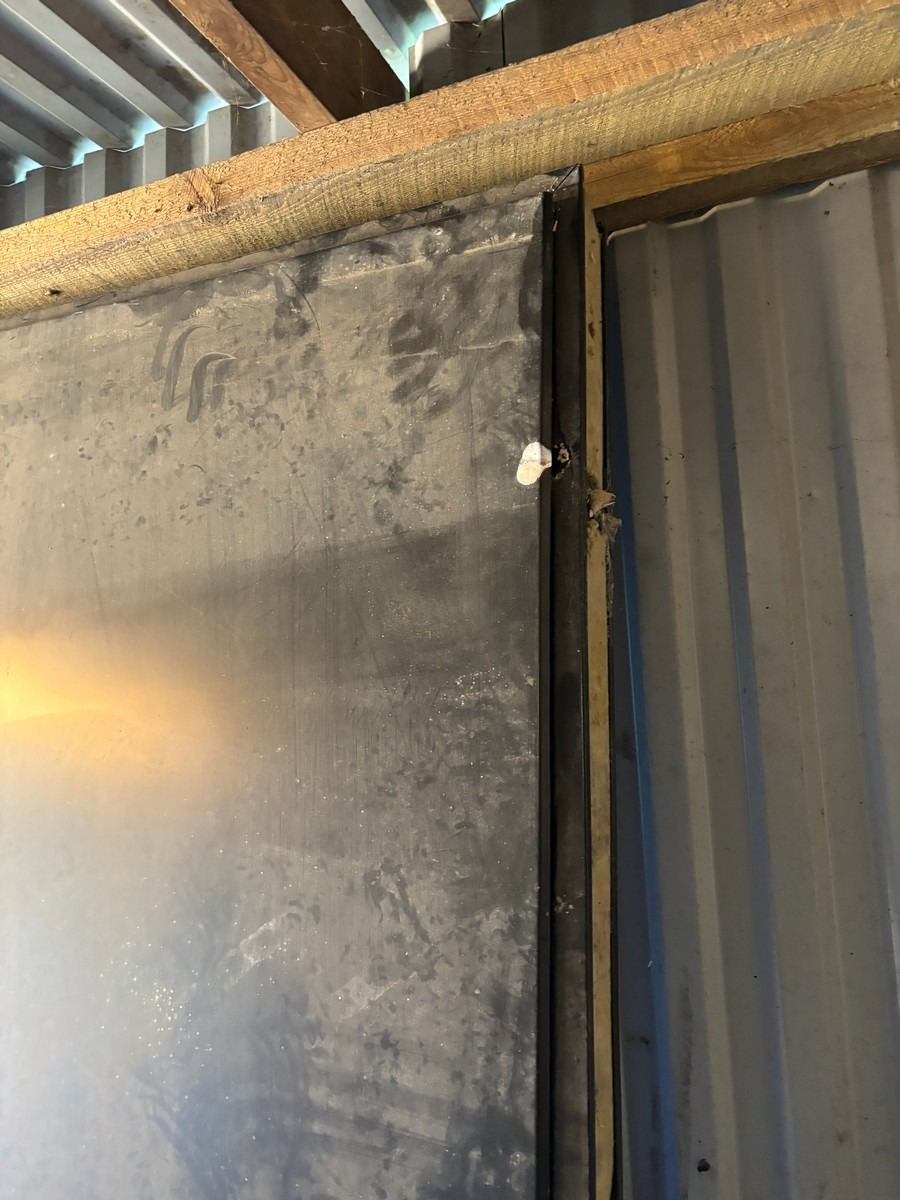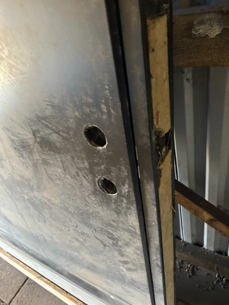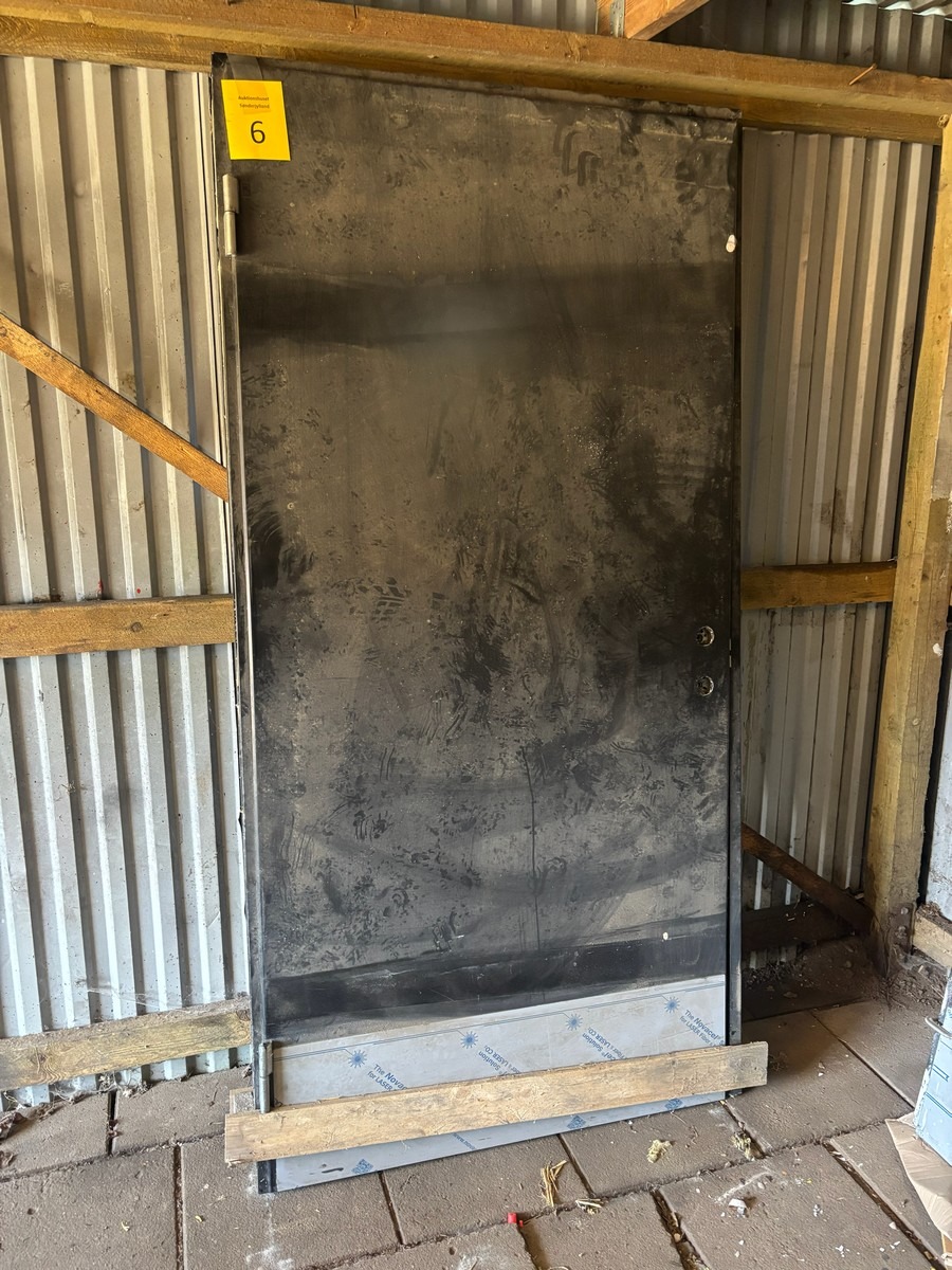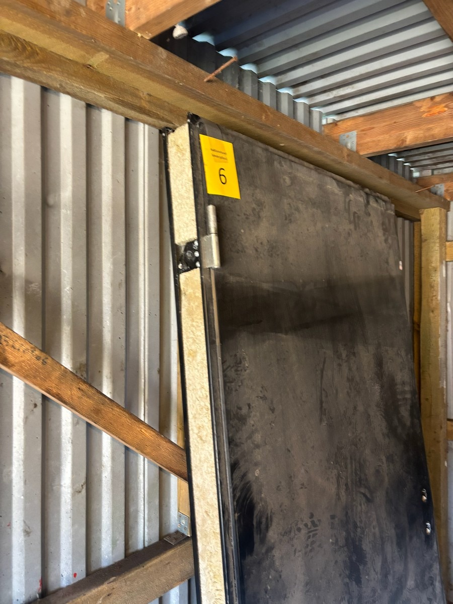 Branddør, med karm. Den måler på karmen : Ca. B 110 cm, H 218 cm. Tykkelse 10 cm. Været monteret, men afmonteret lige efter. Så fremstår som ny