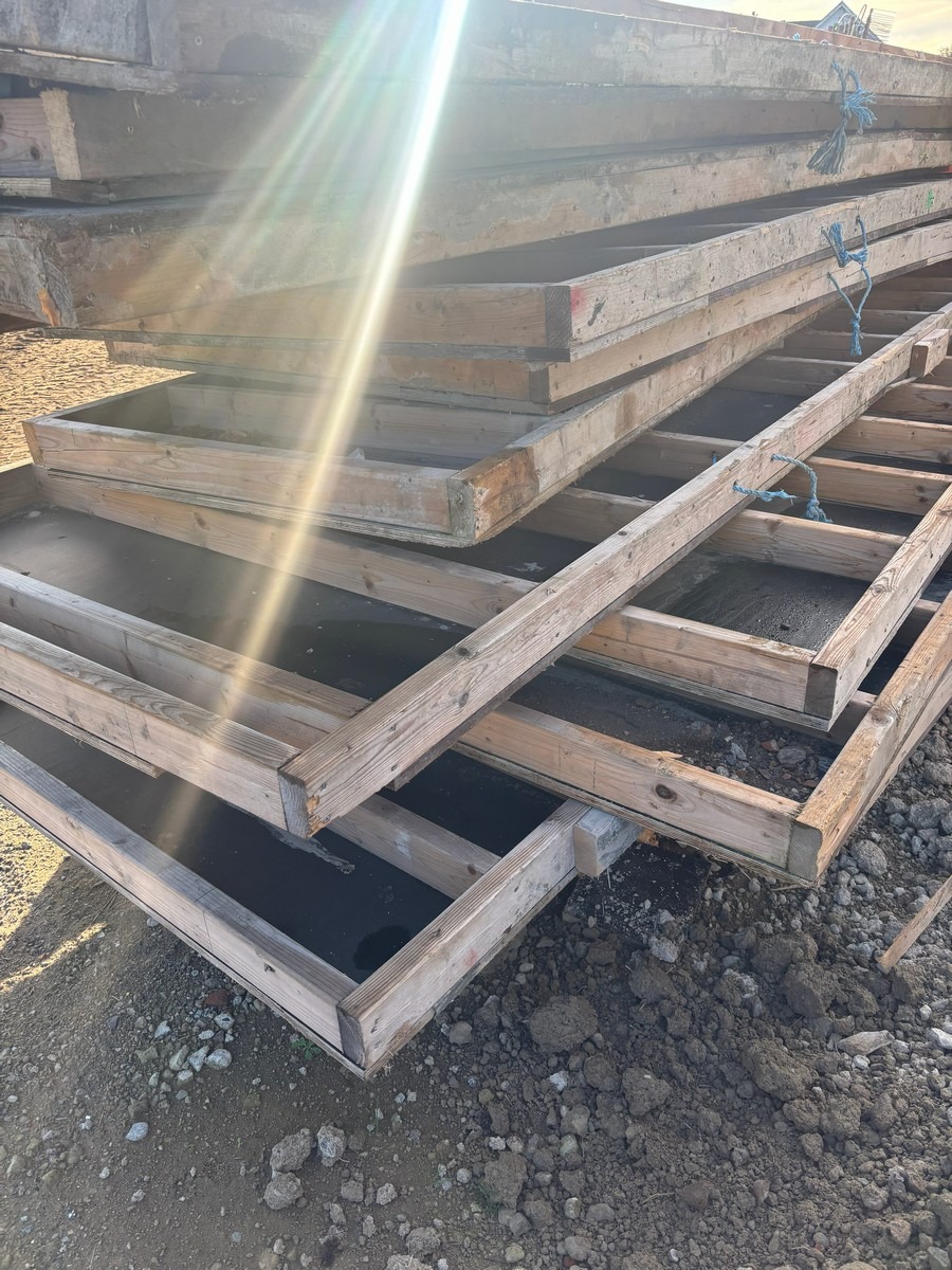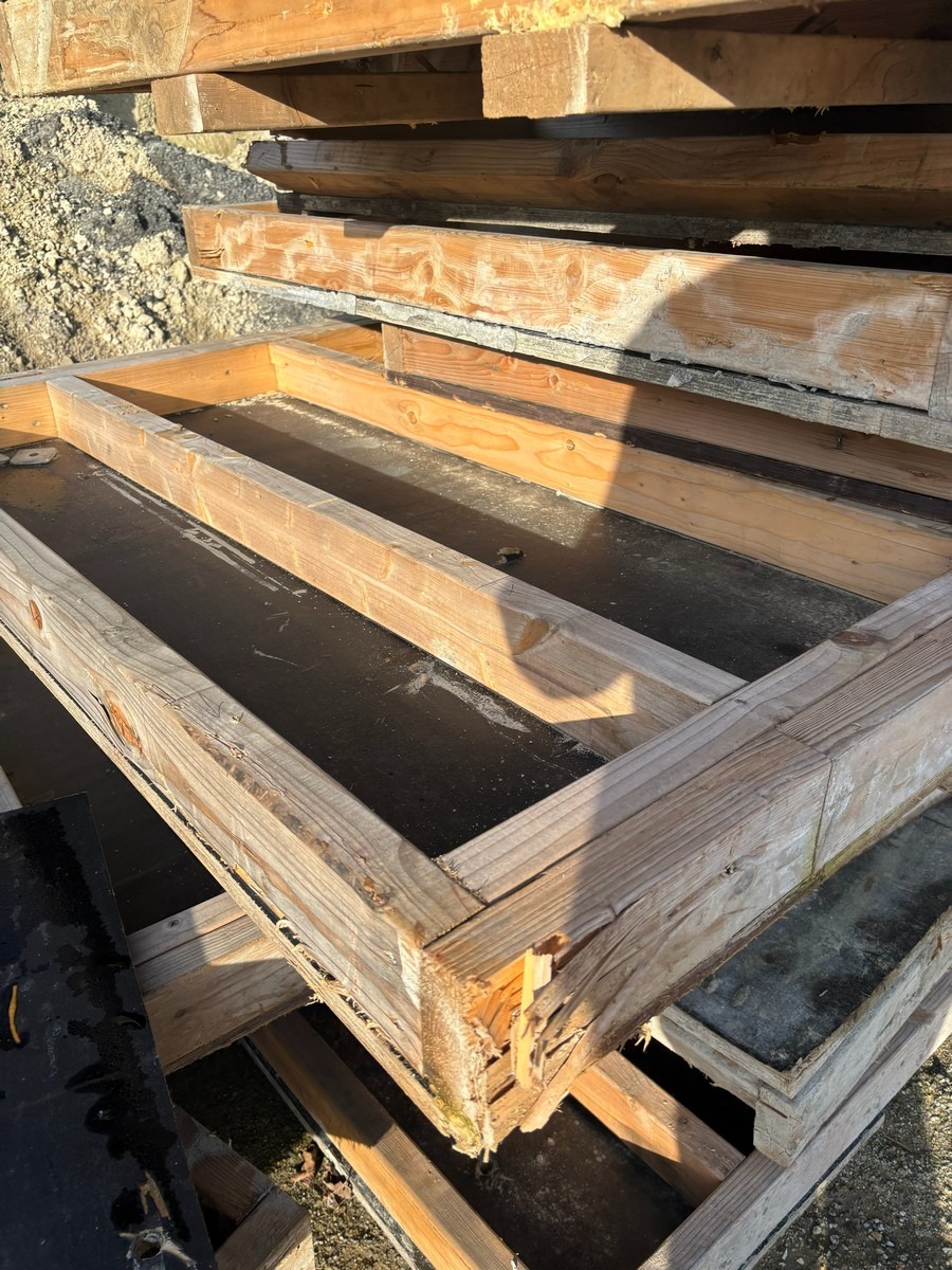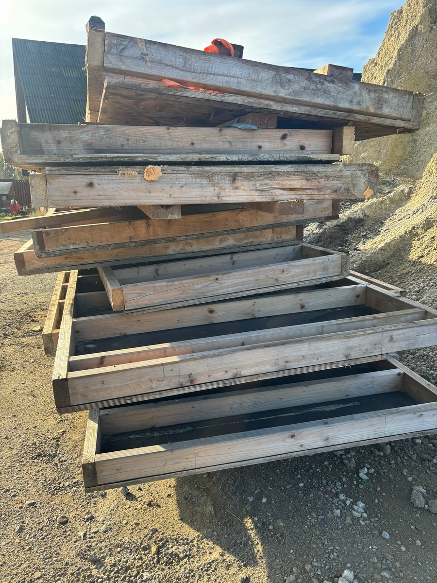 Støbeforskallinger.  Største målet 620 x 150 og mindste måler 490 x 150. Bygget op i rekler 45 x 95. Plade er 21 mm vandfas kryds dominerer ( trailer bund ) halvdel brugt 5 gange og den anden halv brugt 2 gange.