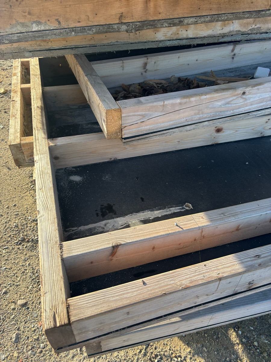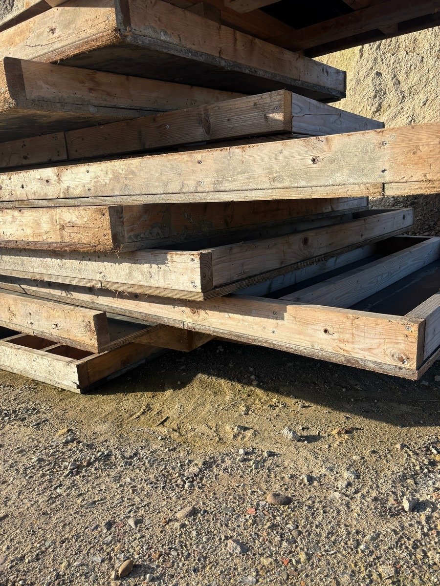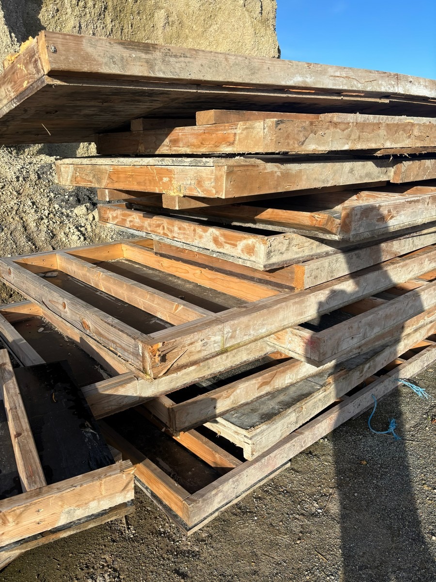 Støbeforskallinger.  Største målet 620 x 150 og mindste måler 490 x 150. Bygget op i rekler 45 x 95. Plade er 21 mm vandfas kryds dominerer ( trailer bund ) halvdel brugt 5 gange og den anden halv brugt 2 gange.